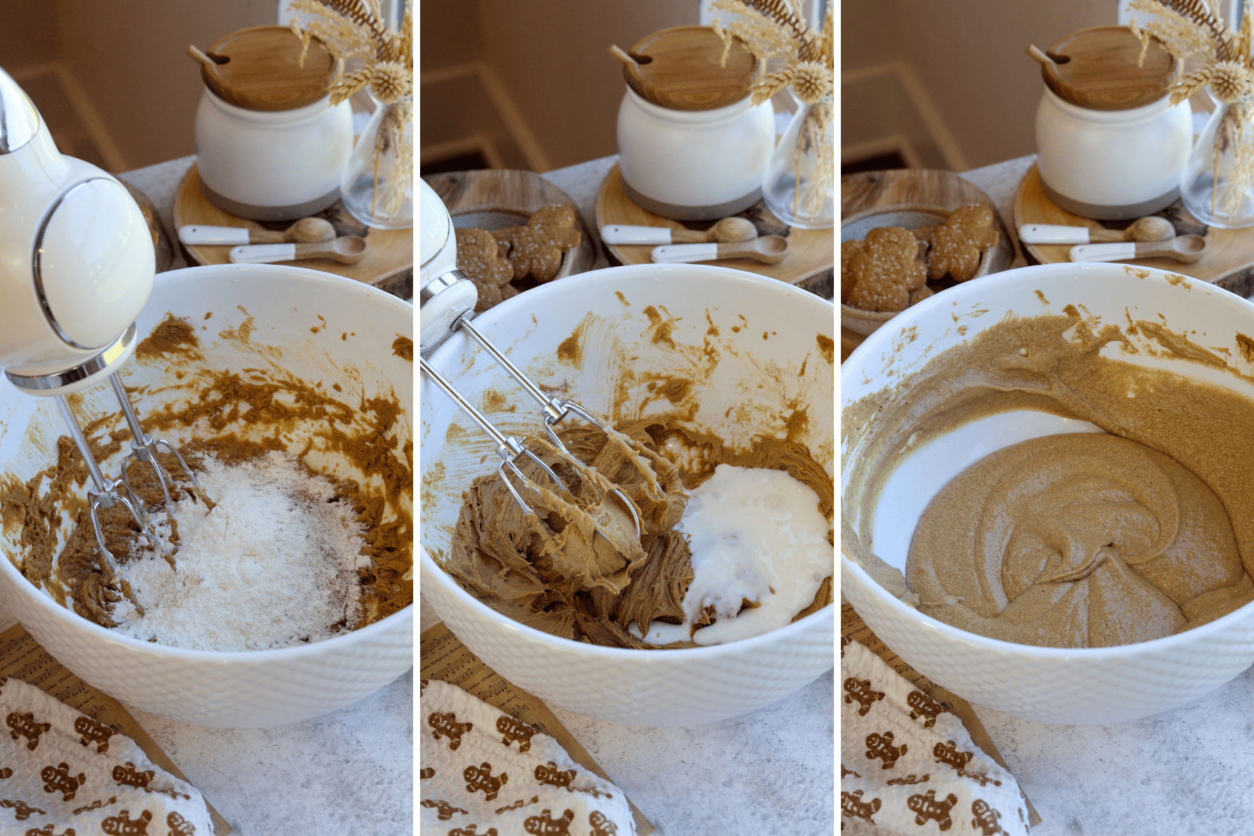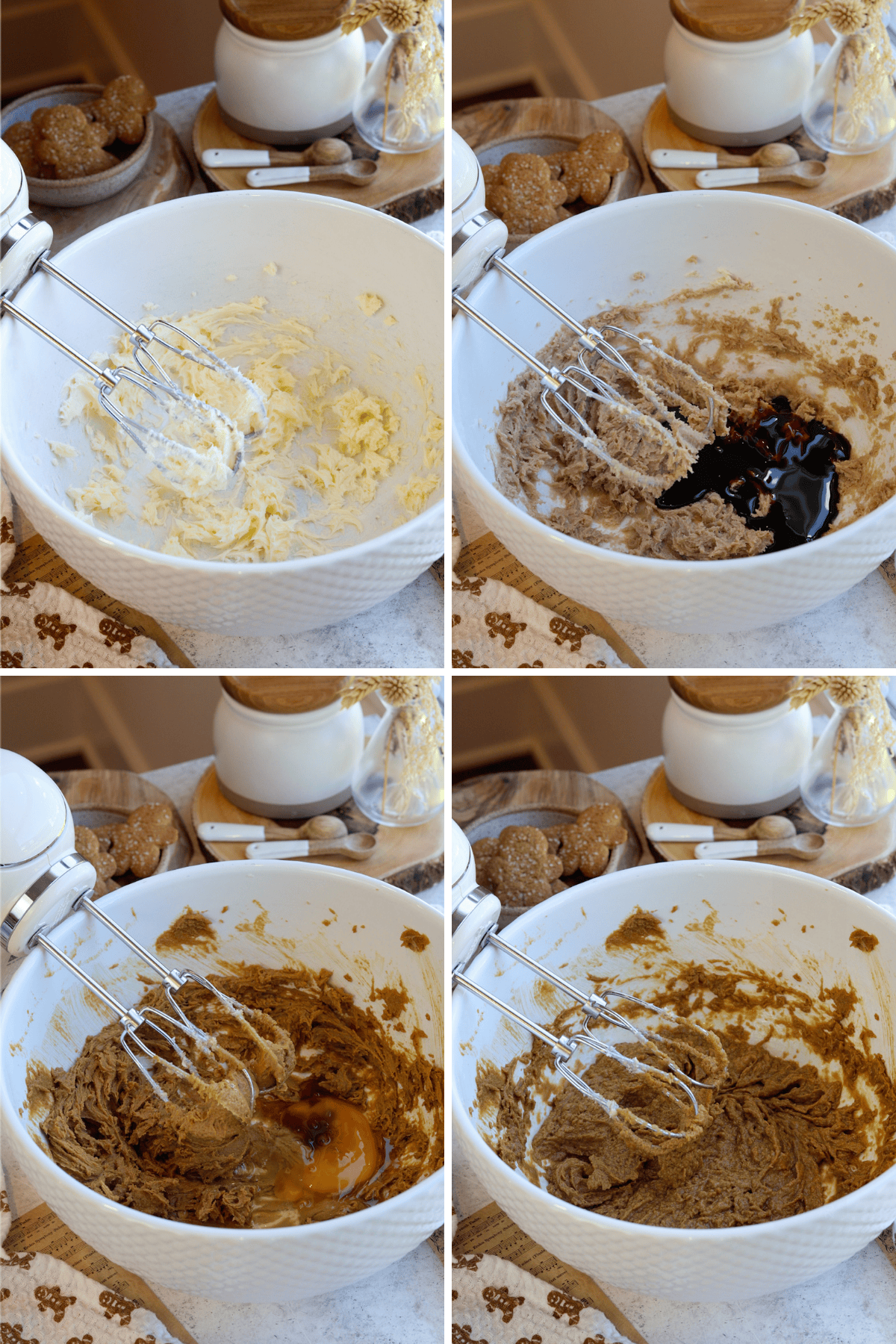 - In another bowl, beat the butter and brown sugar until light and creamy, then mix in the molasses. Add the egg and vanilla. Mix to combine.