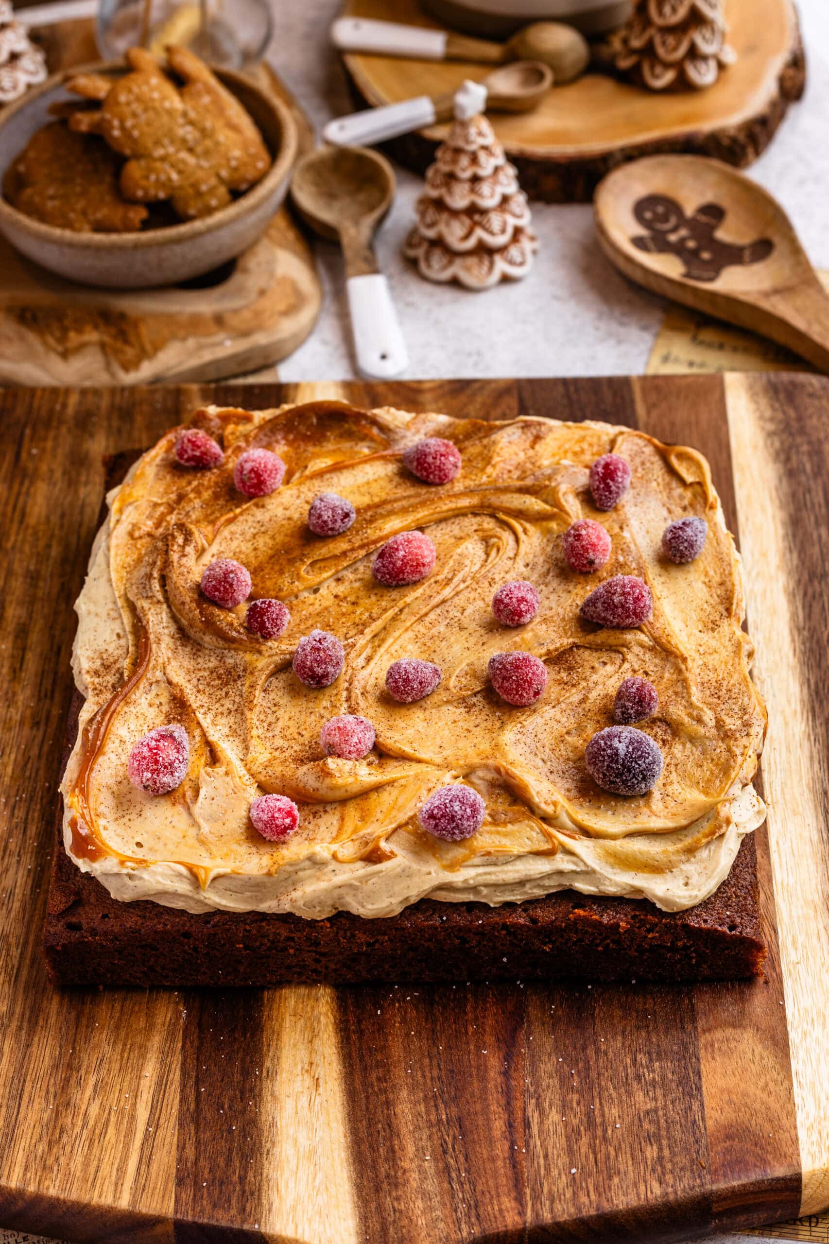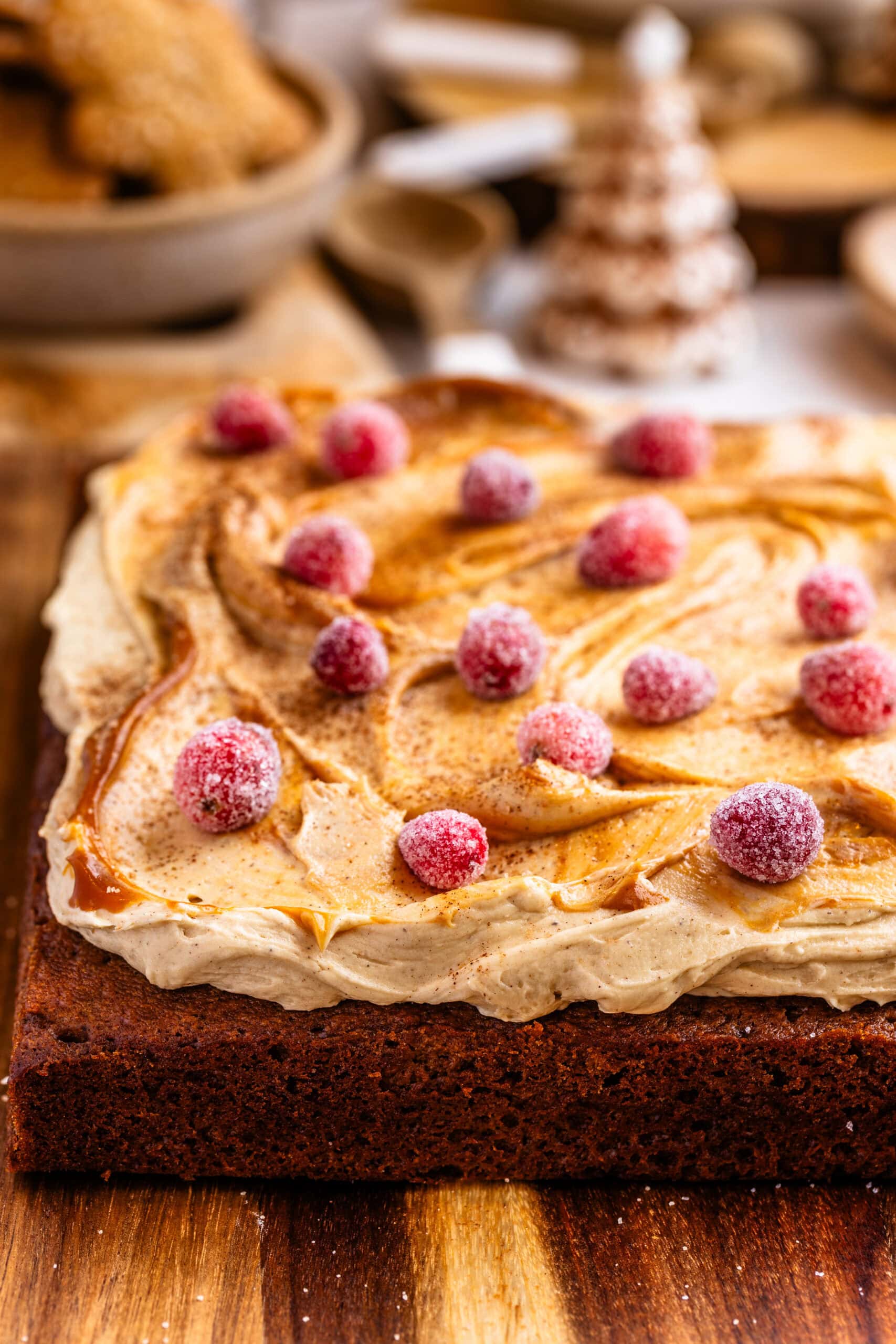- To decorate, I added a drizzle of melted dulce de leche. You can use caramel sauce instead if desired, or simply just the frosting. I also made these sugared cranberries to decorate the top of the cake. They are delicious and also beautiful for decorating your holiday desserts.