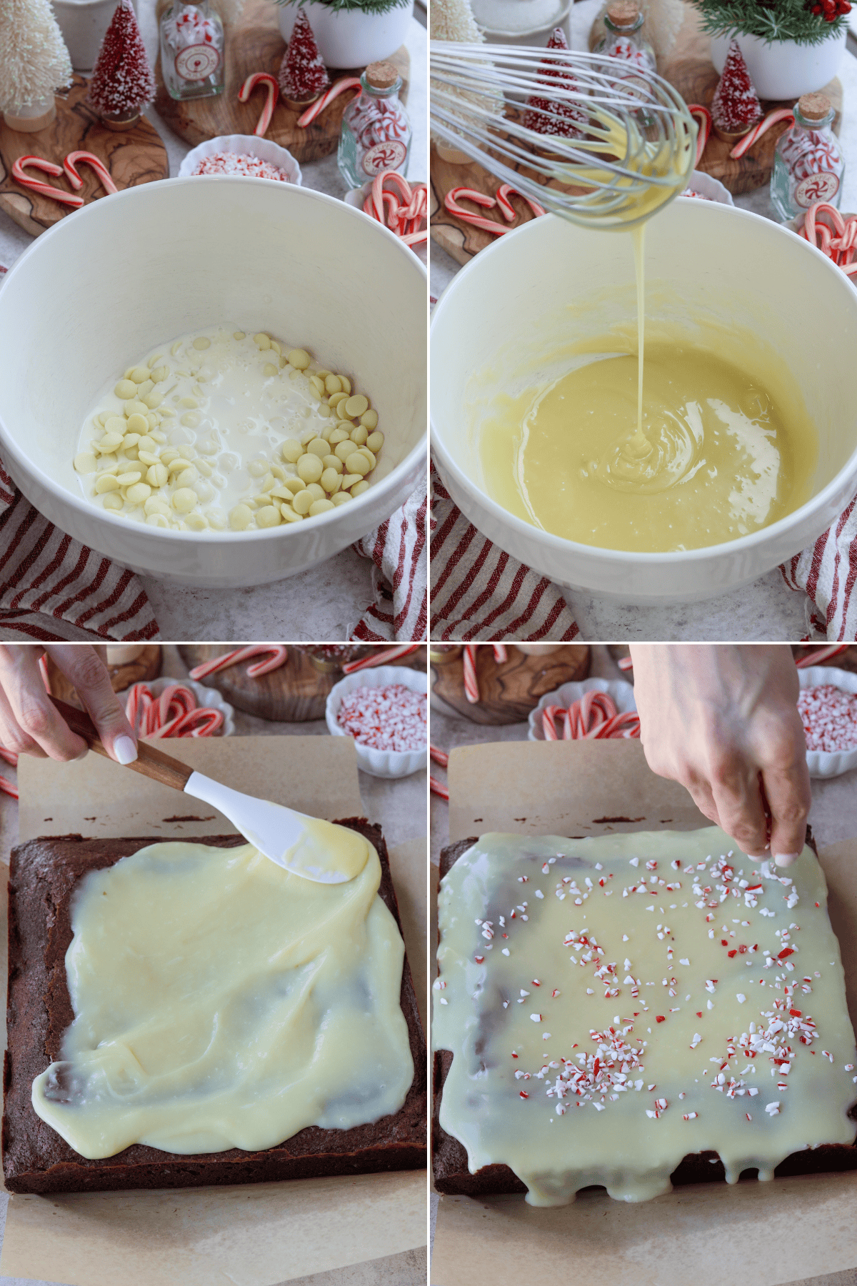Once the brownies have cooled completely, spread the ganache evenly over the top. Sprinkle with crushed peppermint candies for a festive touch. Refrigerate the brownies for about 20 minutes to help the ganache set before slicing.
