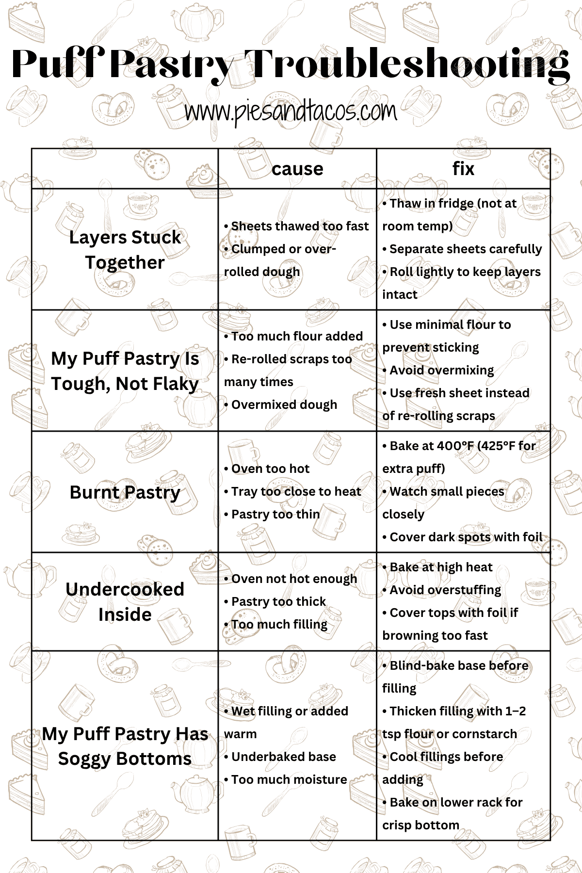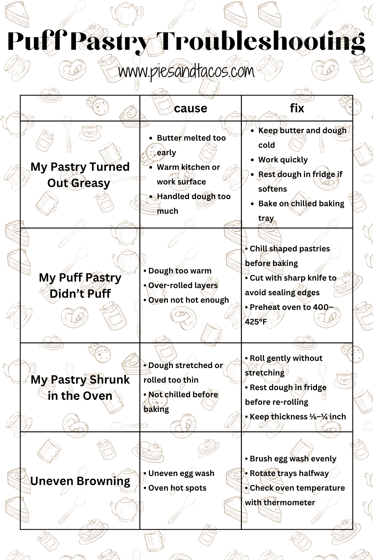 Enjoy these two quick Puff Pastry Troubleshooting tables โ a handy guide to fix common puff pastry problems at a glance. From greasy dough to soggy bottoms, youโll find causes and solutions to help your bakes turn out perfectly crisp and flaky every time.