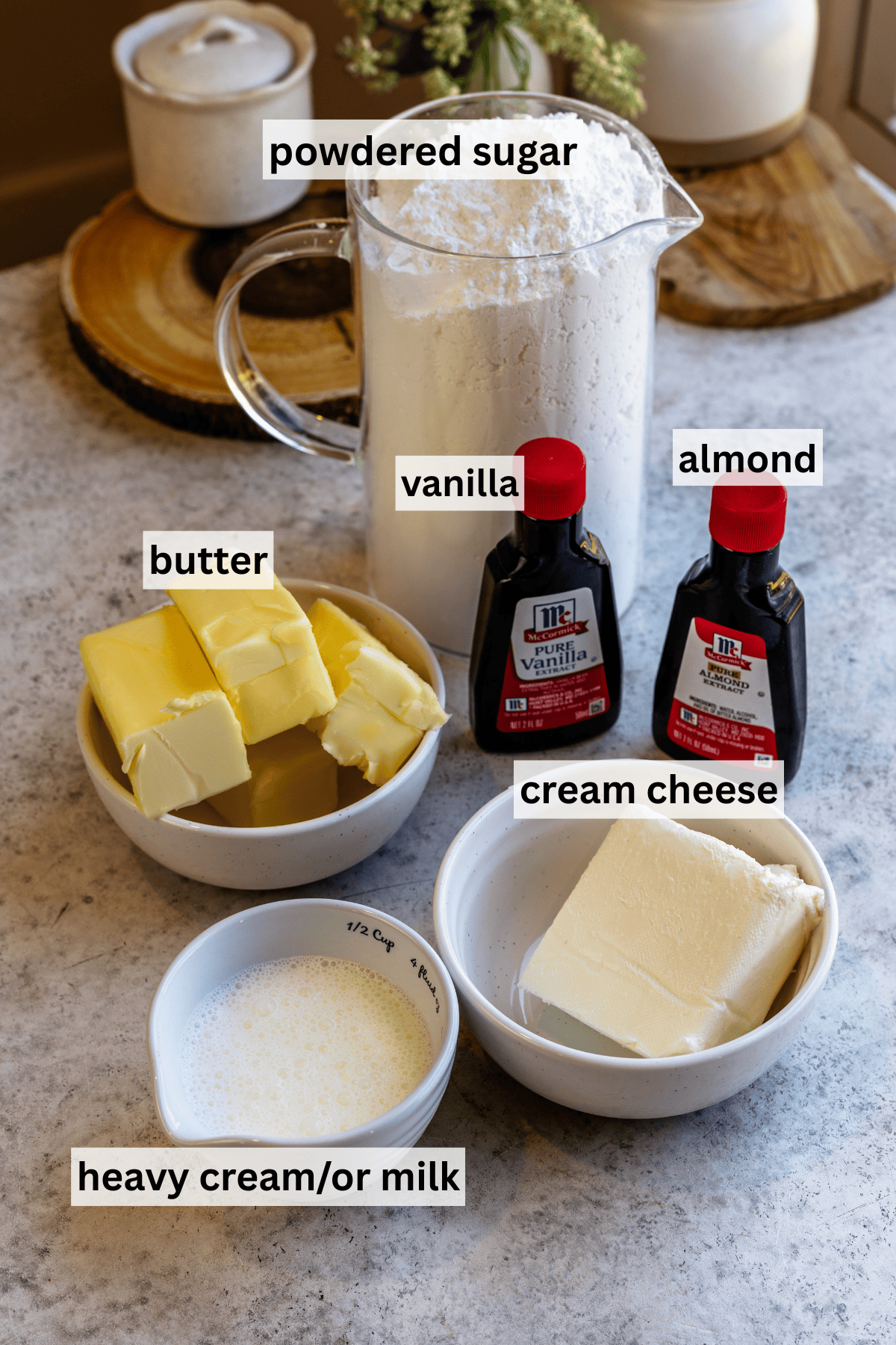 Cream cheese โ I like the slight tang it adds. It keeps the frosting from tasting flat or overly sweet, especially with almond.