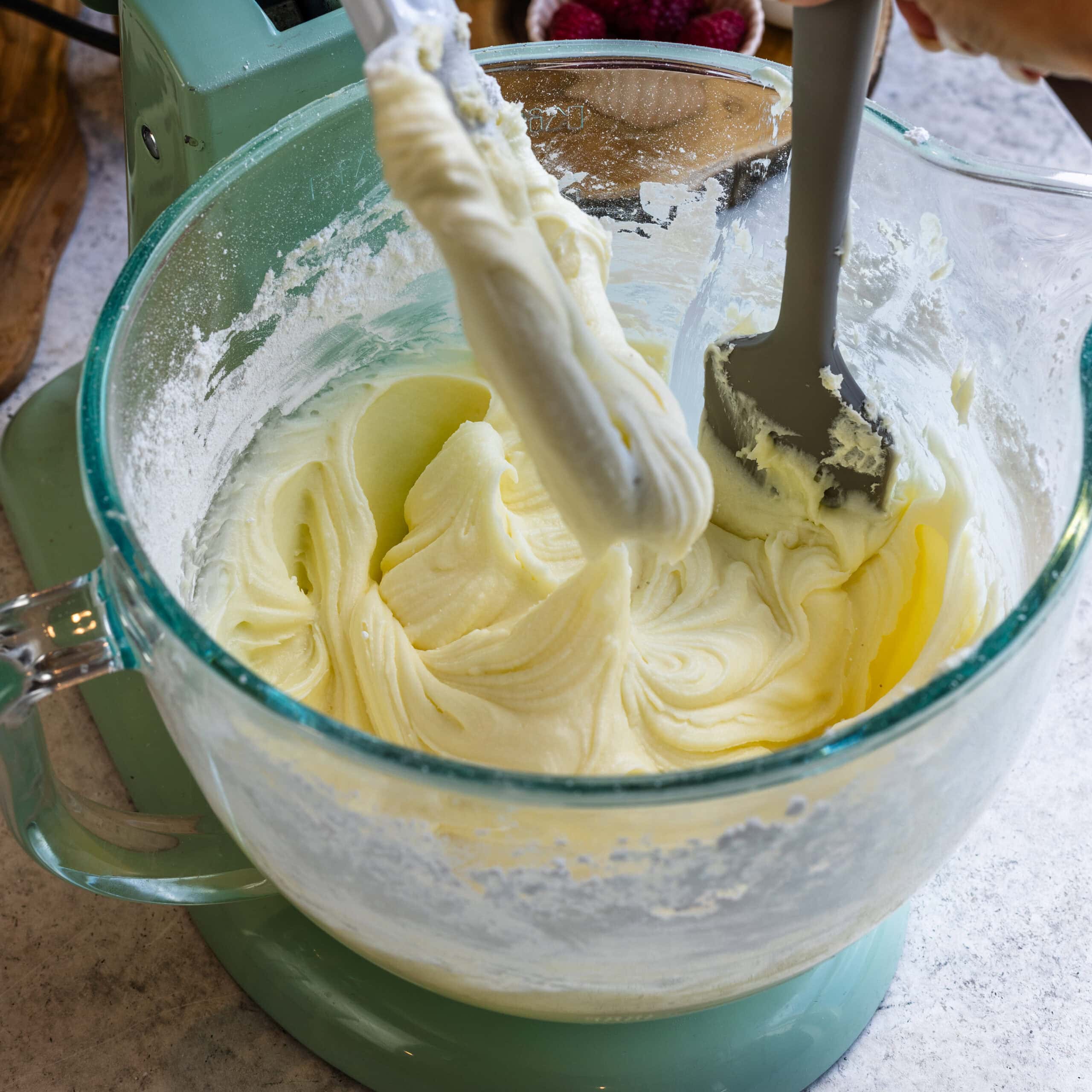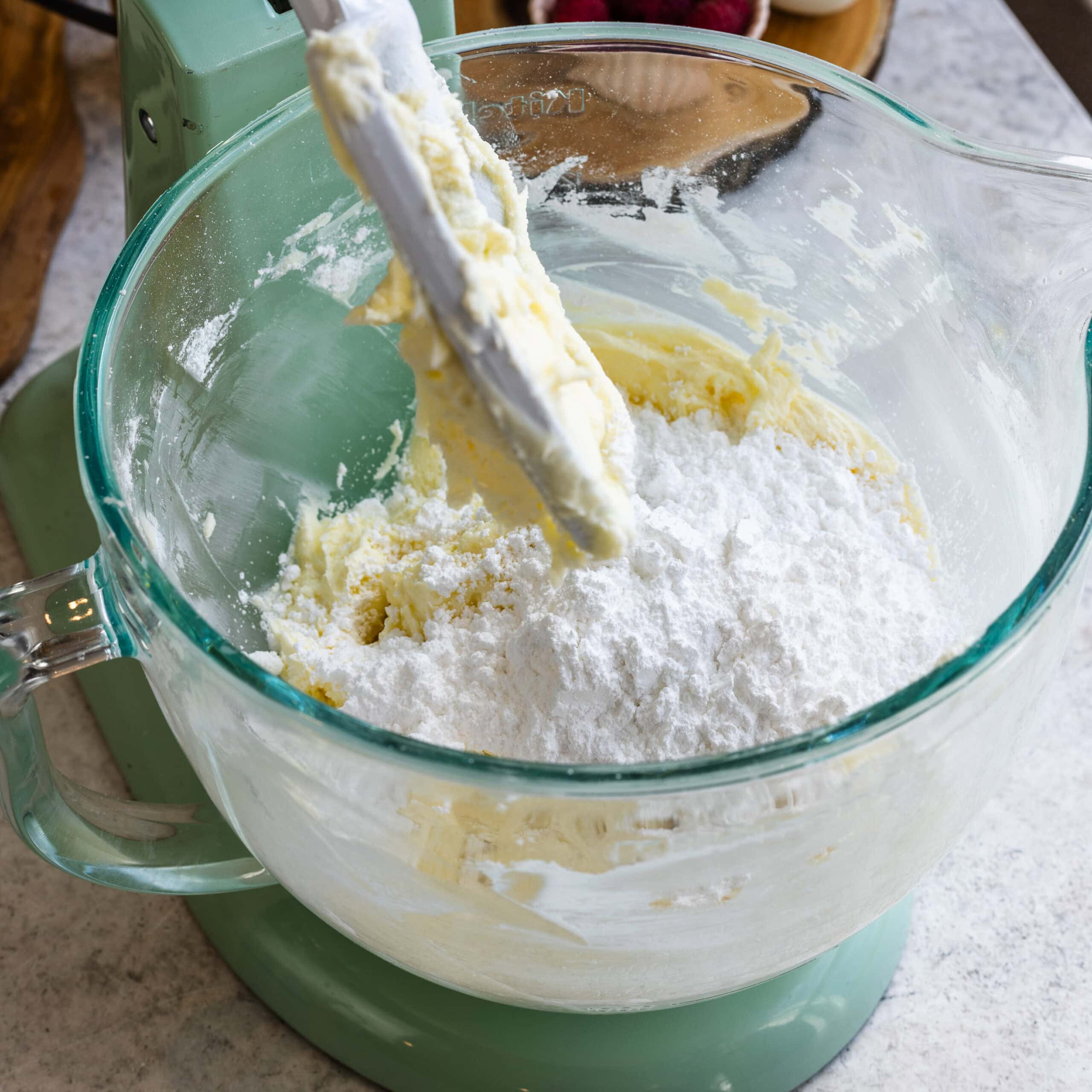 - Add the powdered sugar, mix on low until incorporated. Raise the speed to medium-high and beat for another minute.