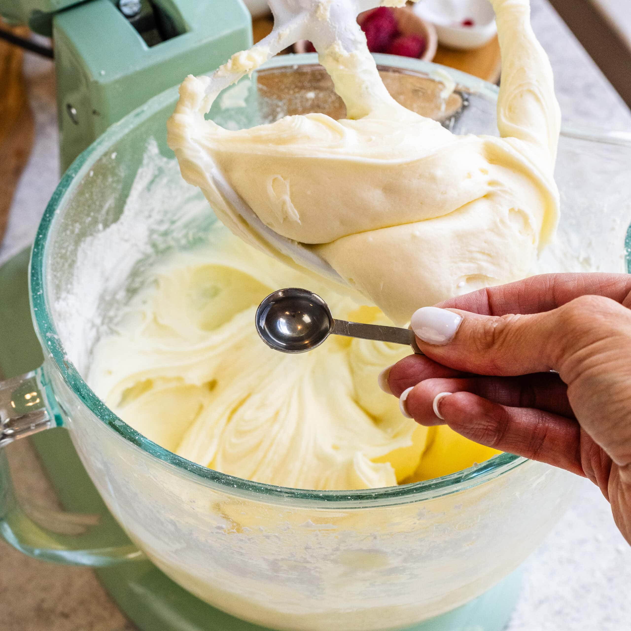 I add the vanilla extract and almond extract and mix just until combined. I donโt overmix at this point โ once the sugar is in, Iโm careful not to beat longer than necessary.