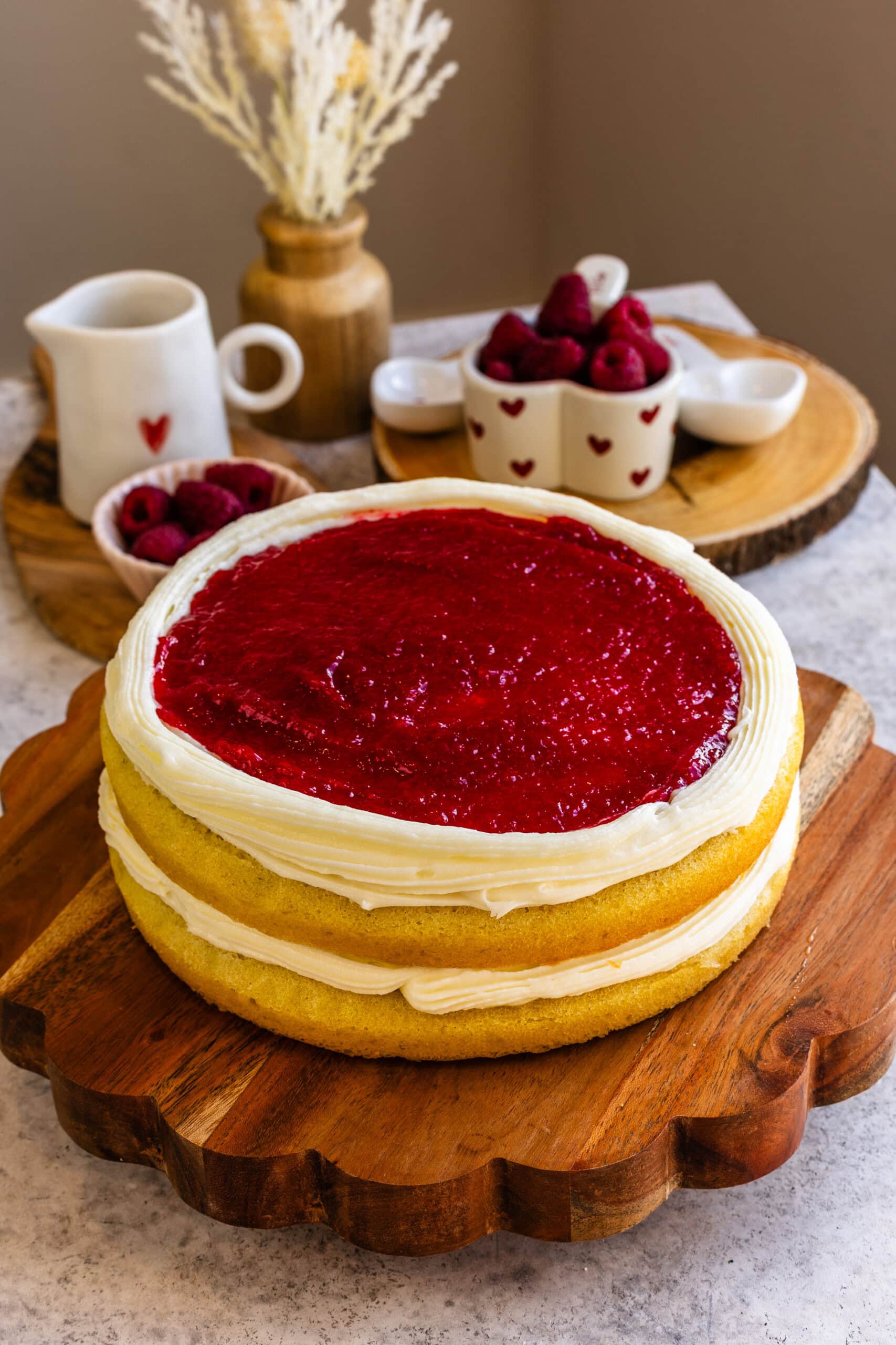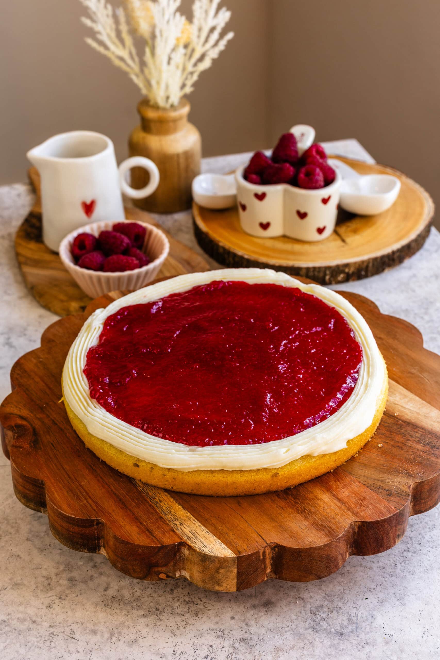 - Spread a thin layer of frosting on top of the cake and pipe a ring of frosting around the edges. Spoon some of the raspberry jam in the middle.