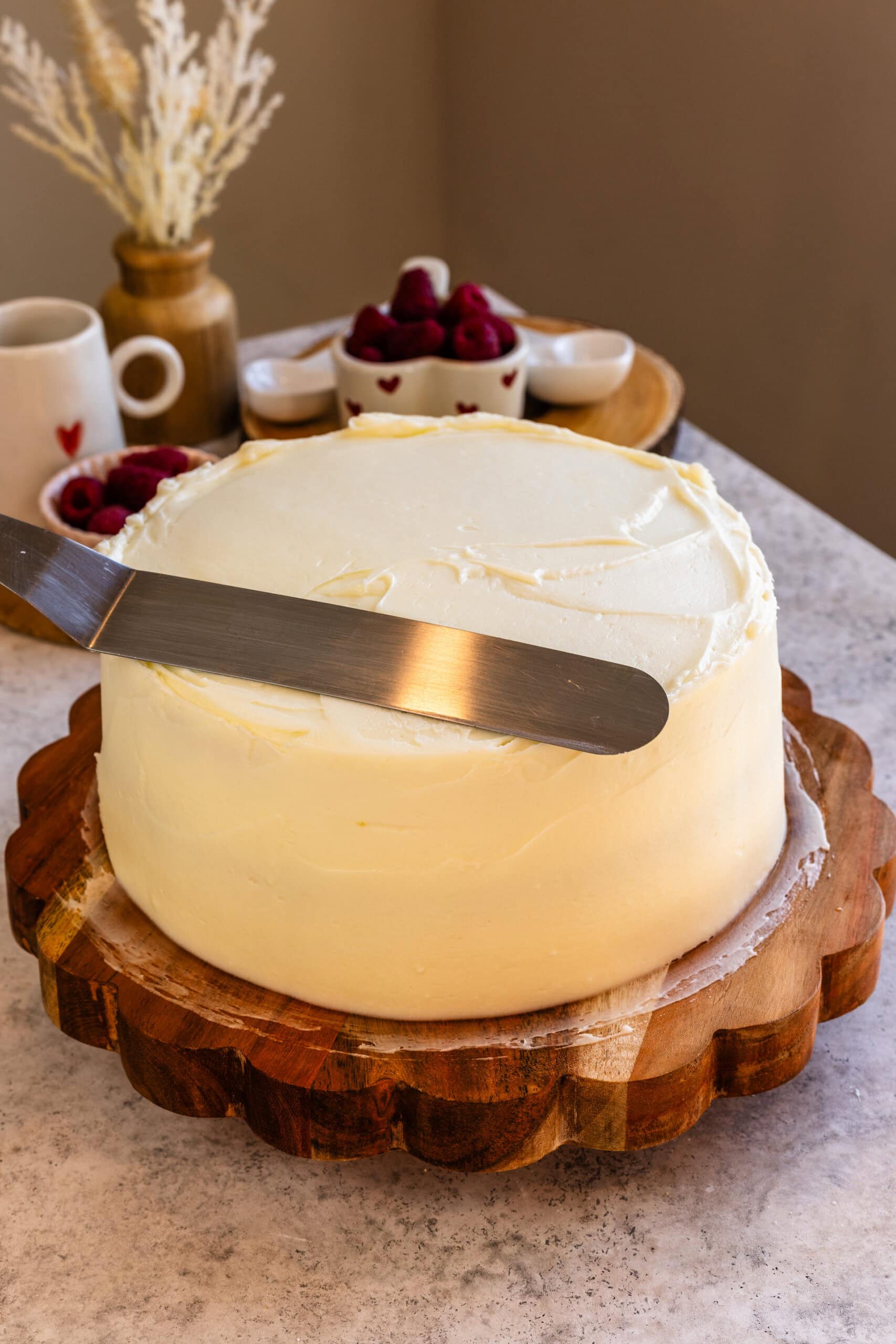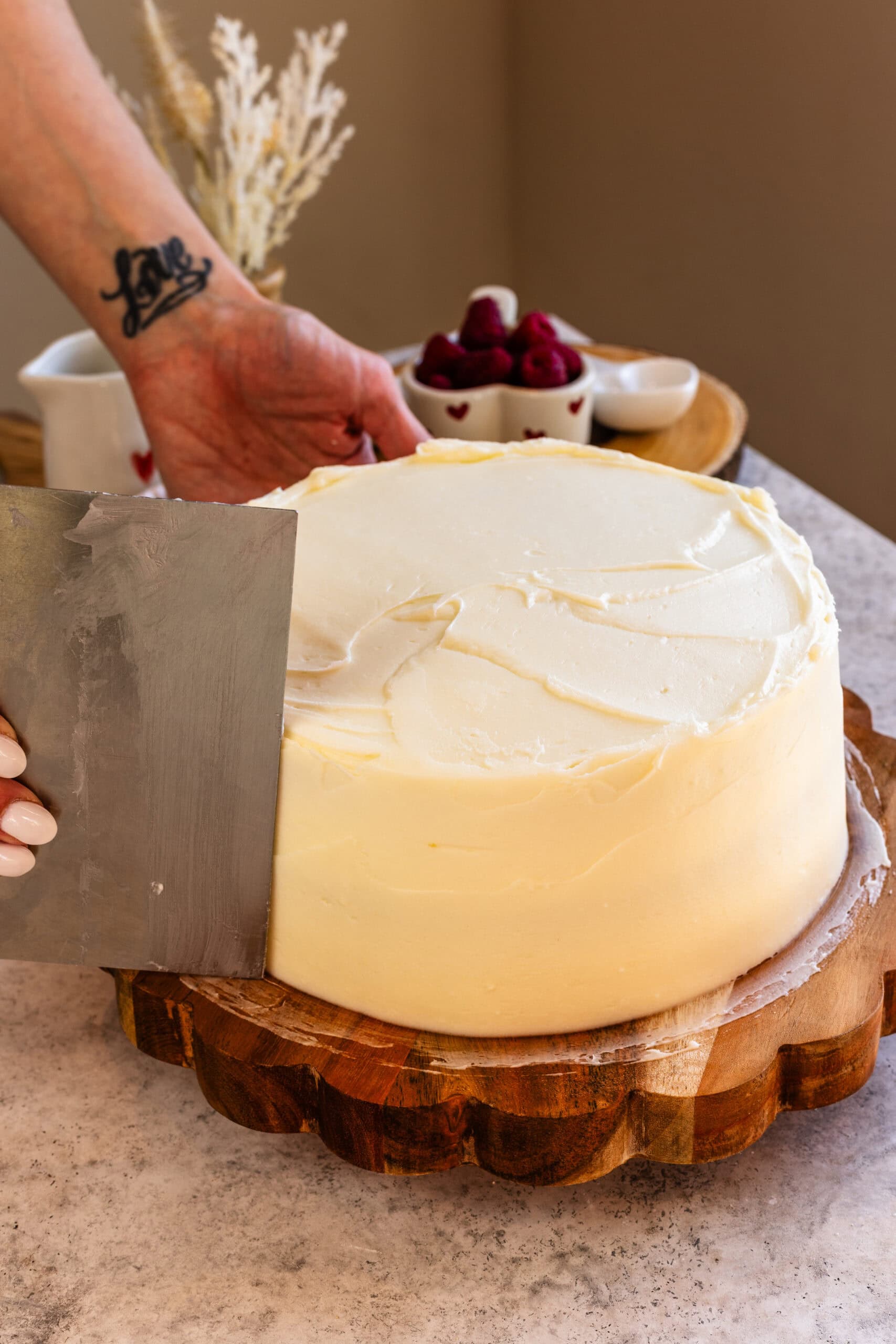 - Repeat the smoothing of the cake with an offset spatula for the top and a bench scraper for the sides.