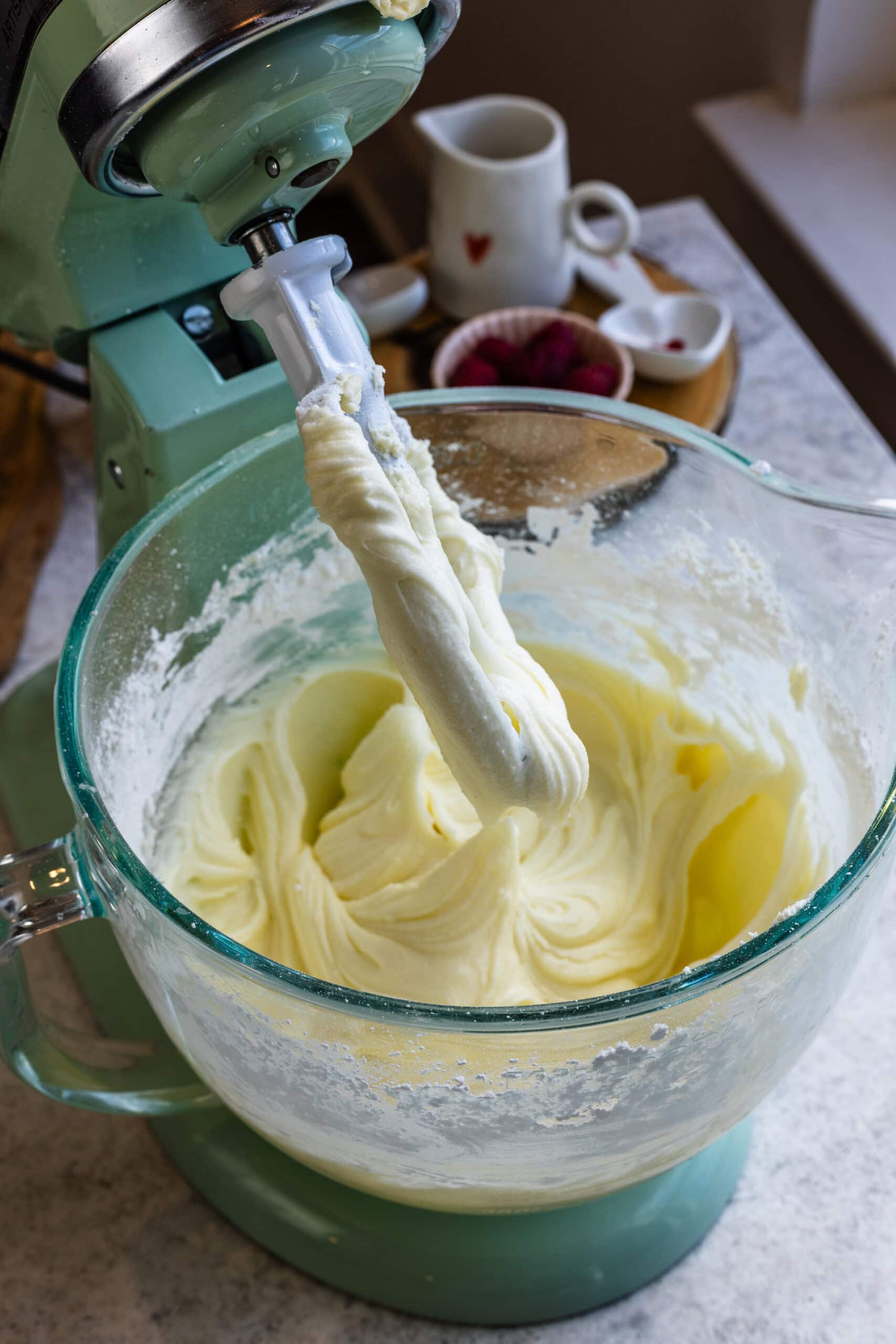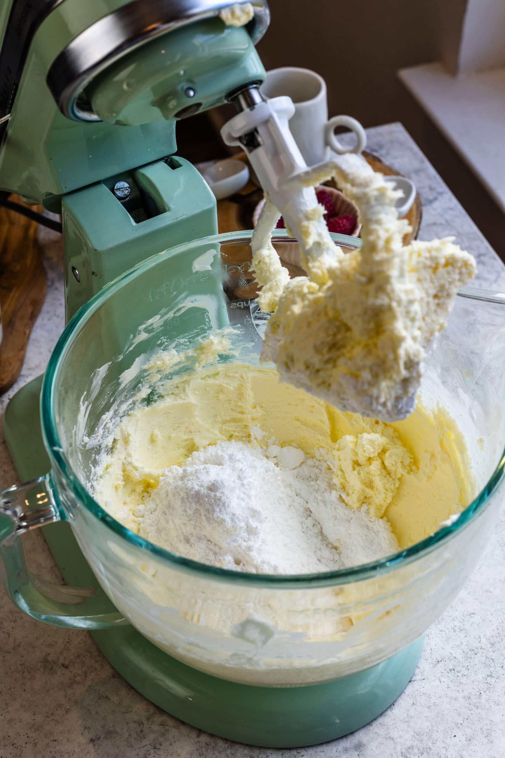 - Add the powdered sugar, mix on low until incorporated. Raise the speed to medium-high and beat for another minute.