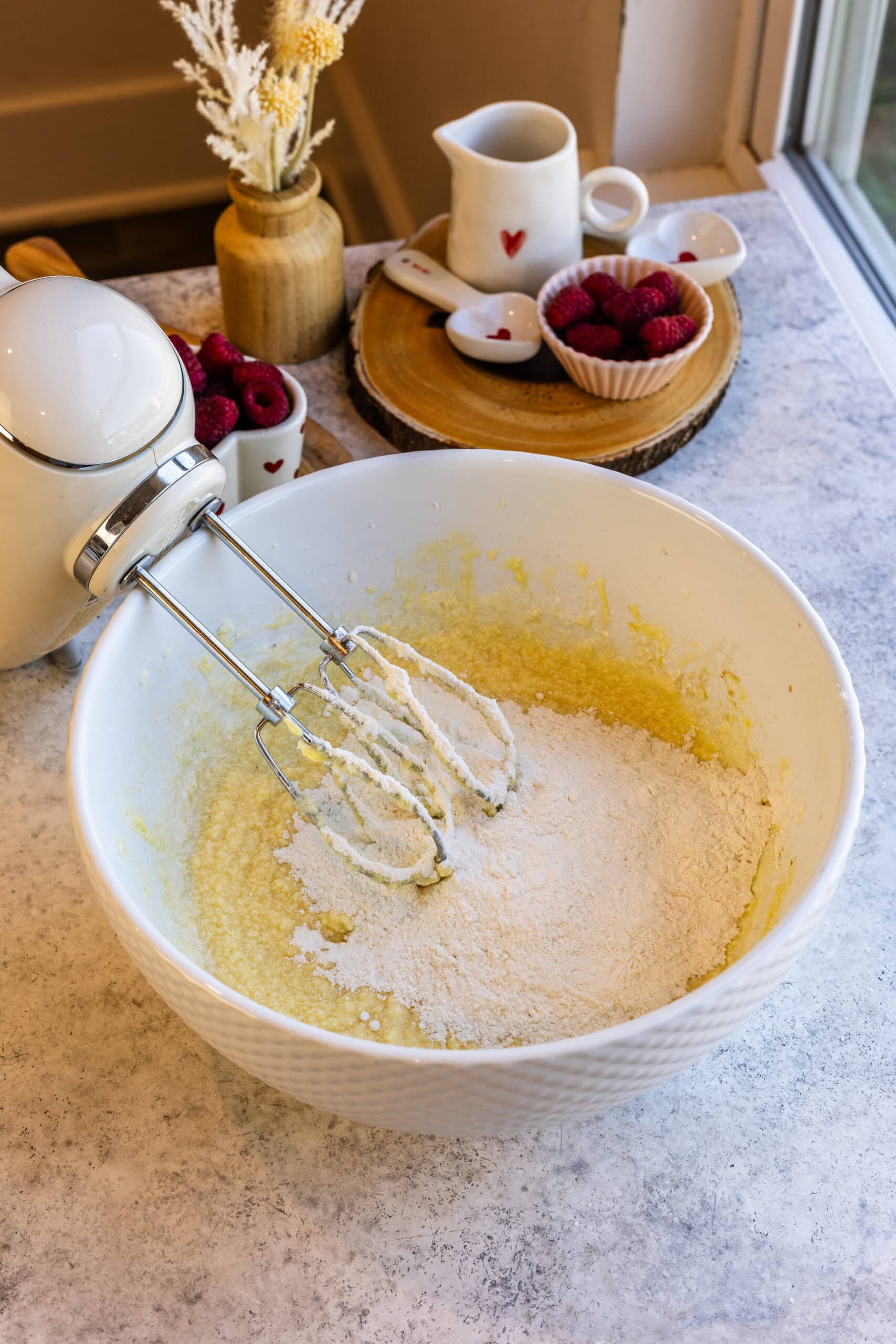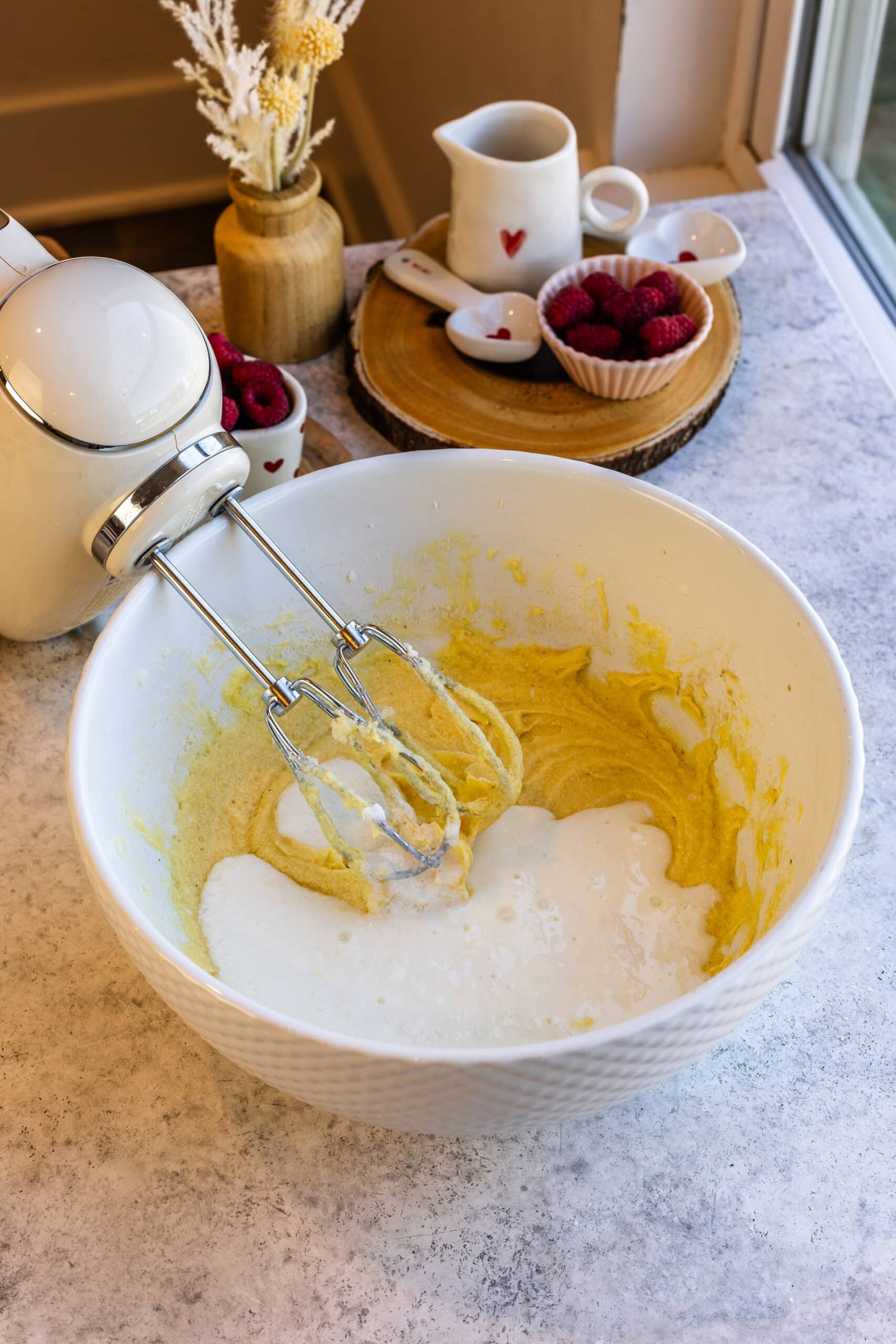 - Add the remaining dry ingredient mixture and fold to combine. I like to finish mixing with a spatula, to ensure the batter won't get over mixed.