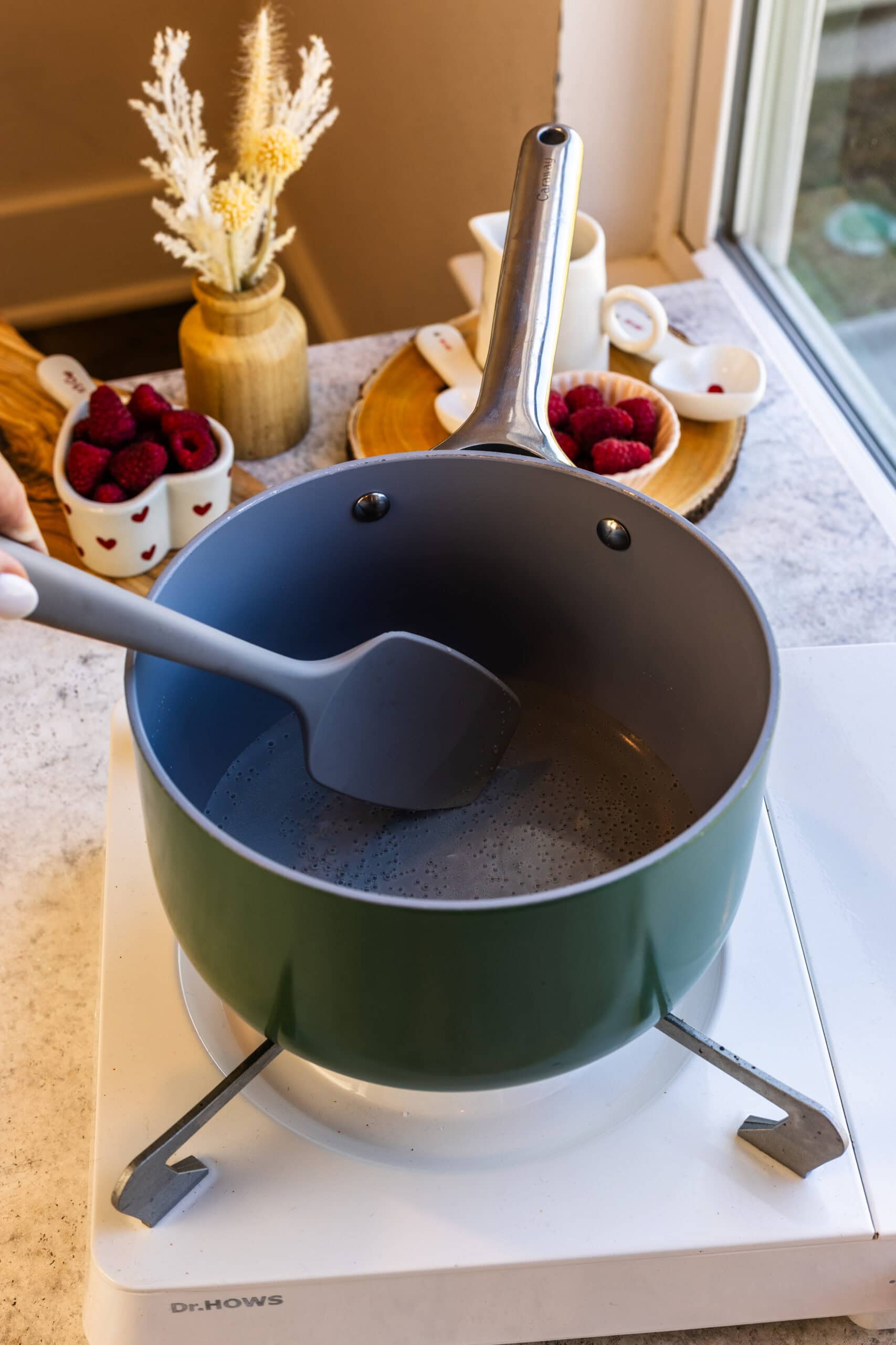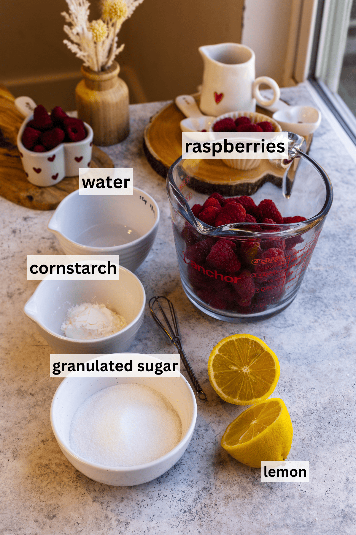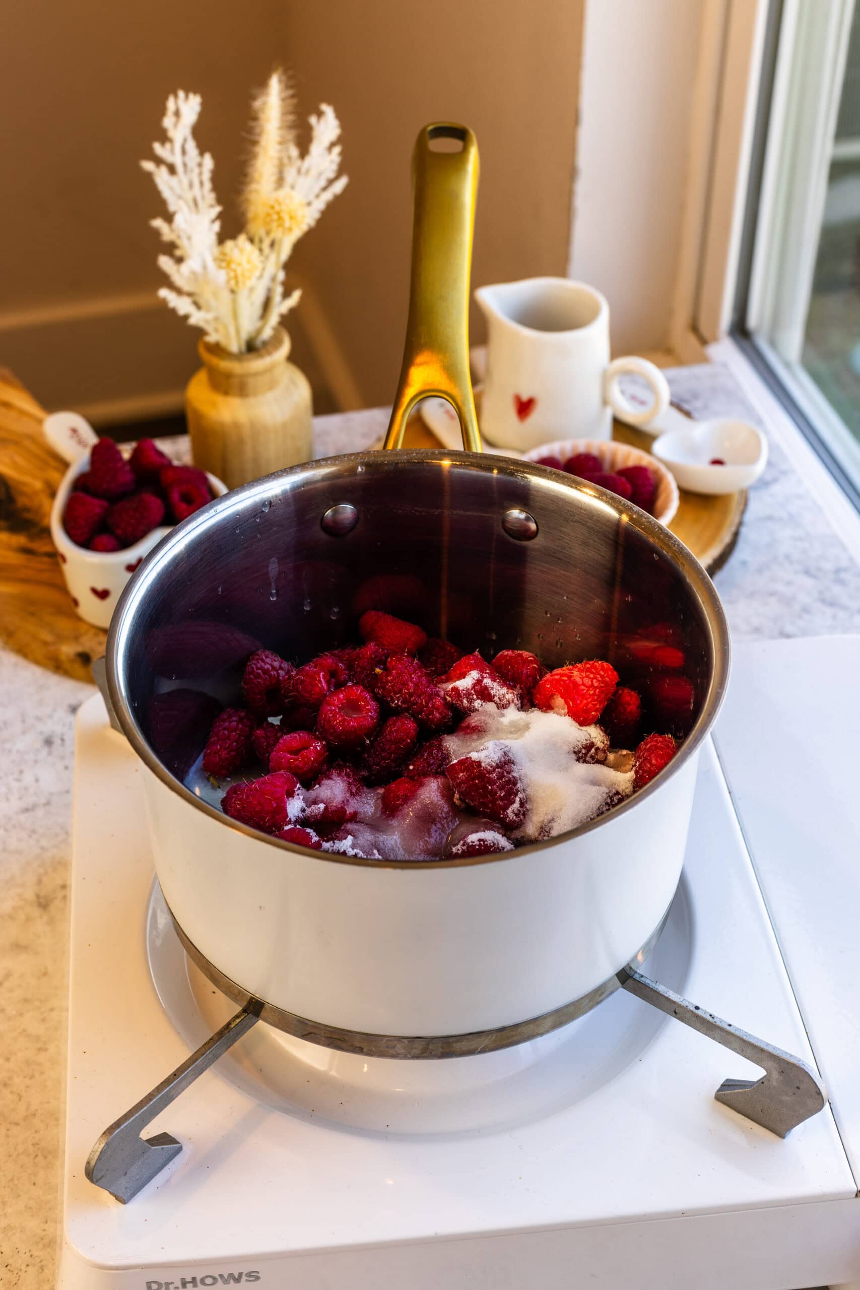 While the raspberries cook, pour the water over the cornstarch in a small bowl. Whisk to combine until the cornstarch dissolves. You might have to re-whisk before adding to the pan.