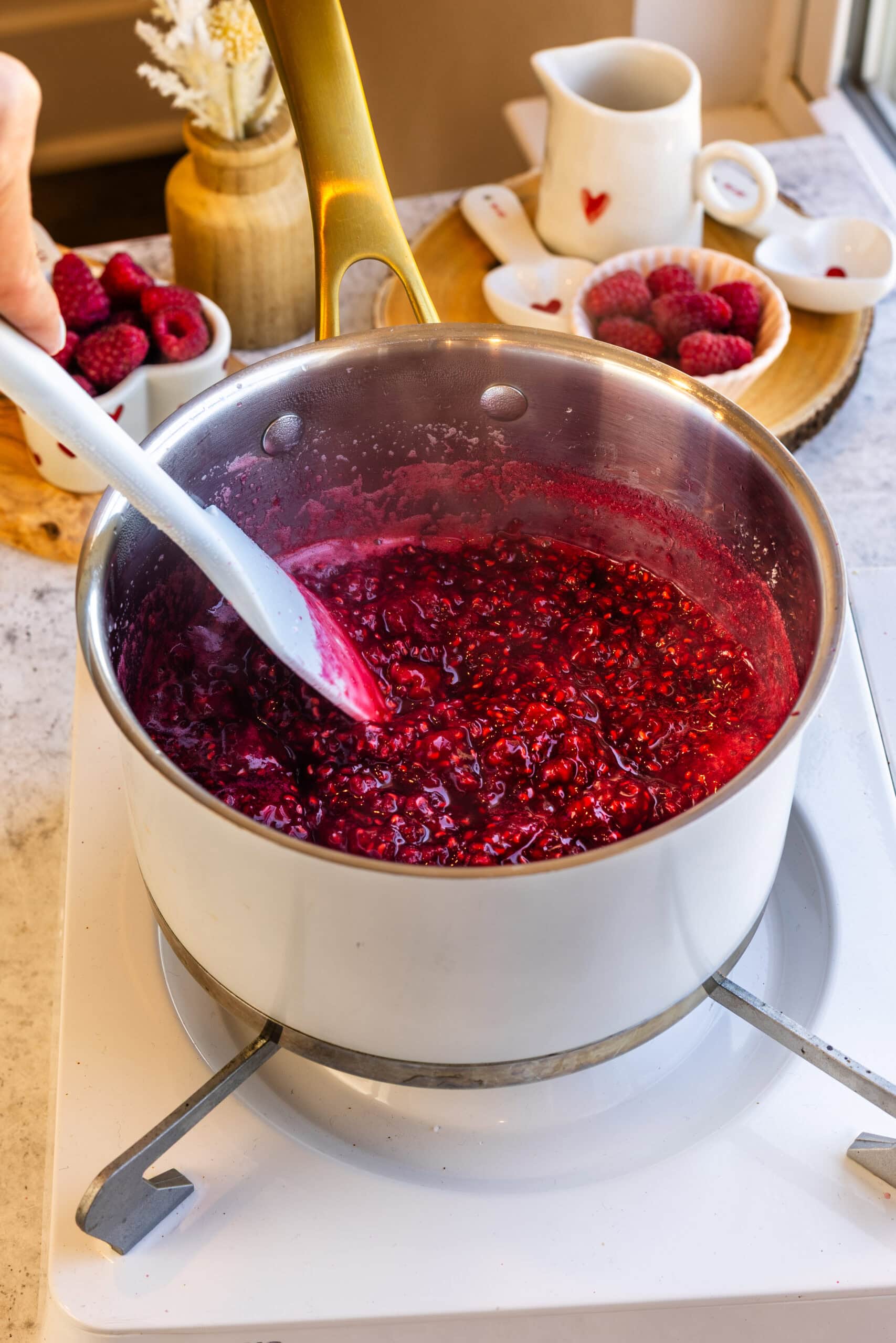 Once the raspberries are reduced to a sauce, add the cornstarch and immediately mix. Iโve forgotten to mix before and clumps of cornstarch formed in the mixture. Donโt make that same mistake. Cook for another minute or so, until very thick.