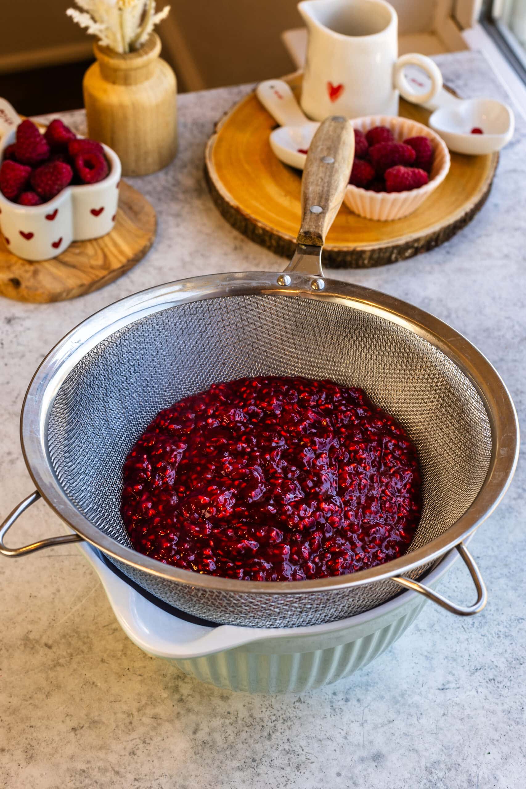 - Pour the jam through a fine mesh sieve, use a spatula to stir and press down on the raspberries to extract all the liquid out and strain the seeds out. Take your time doing this or you will miss out on a lot of jam.