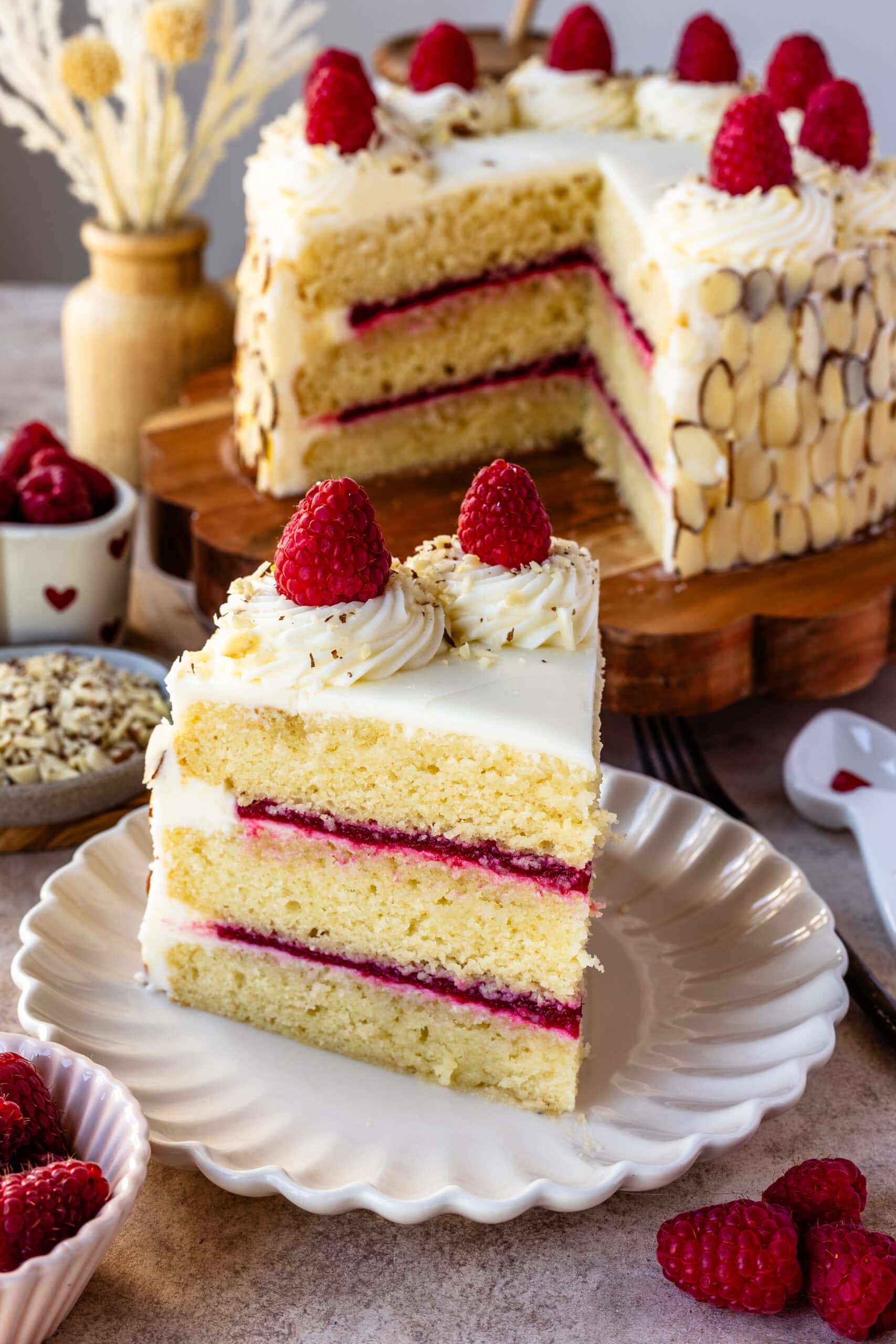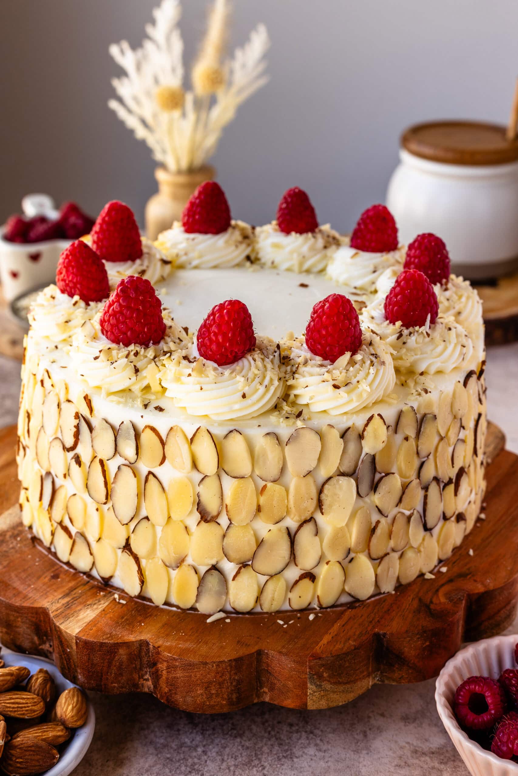 - Place the remaining frosting in a piping bag and pipe on top of the cake. I used a tip 4B. Top with raspberries and sprinkle with chopped almonds.