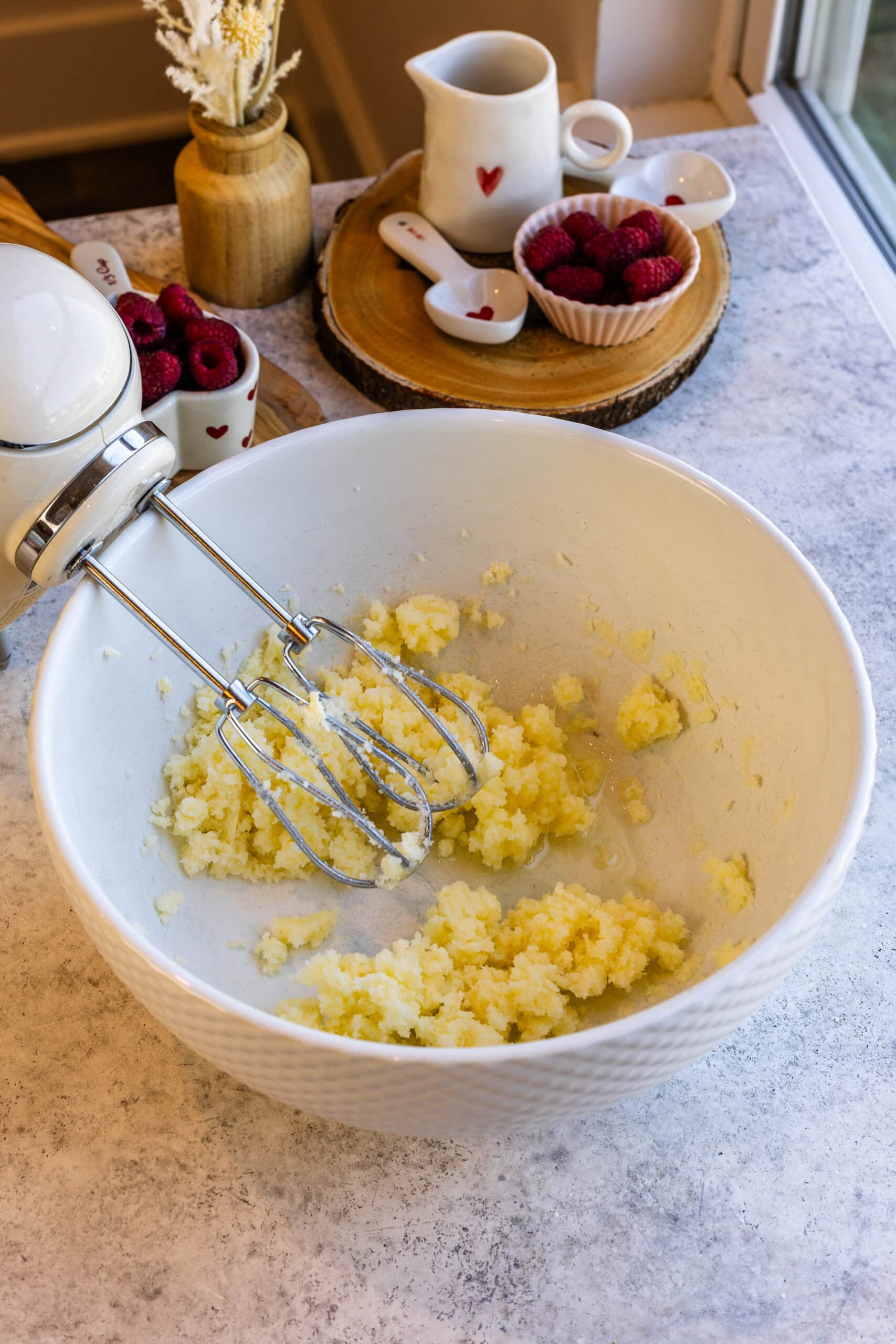 - Beat the butter in the bowl of a stand mixer for 1 minute, on medium speed. Add the sugar and beat for 2 minutes. Then add the oil and beat for another minute, until the mixture is creamy and fluffy.