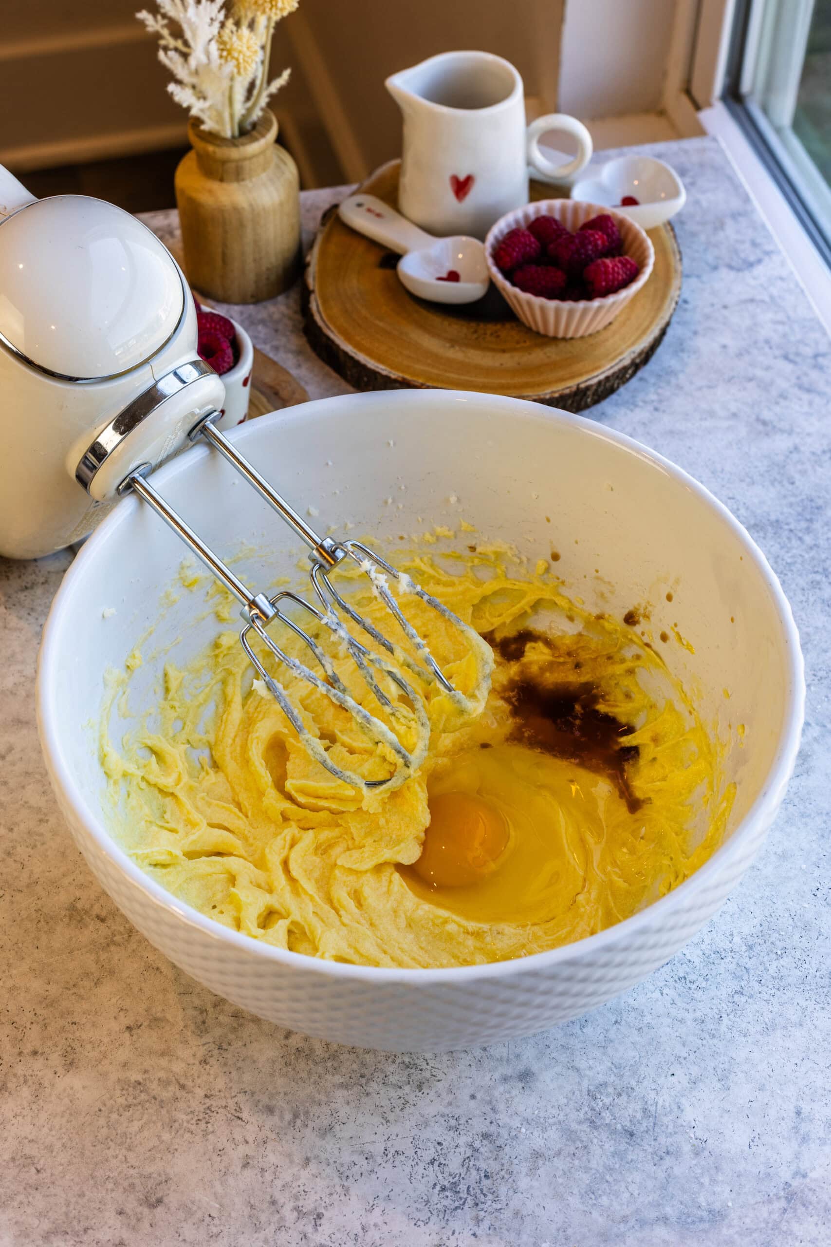 - Add the eggs to the mixture, one at a time, mixing on medium speed. Along with the final egg, you can add the vanilla and almond extract.