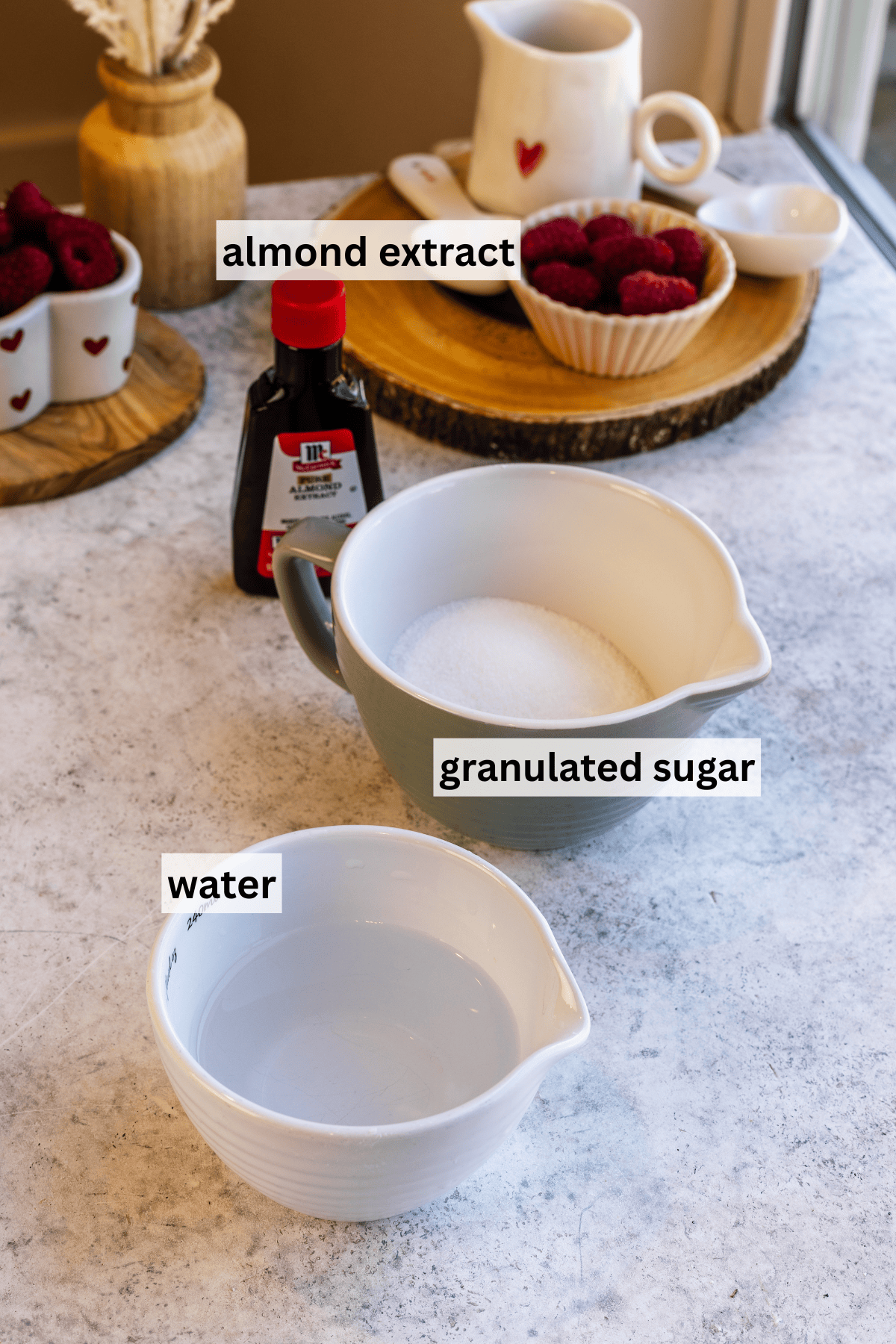 Simply add the water and sugar to a small saucepan and bring to a boil, until the sugar melts. Remove from the heat and add the almond extract. Let it cool down completely before using.
