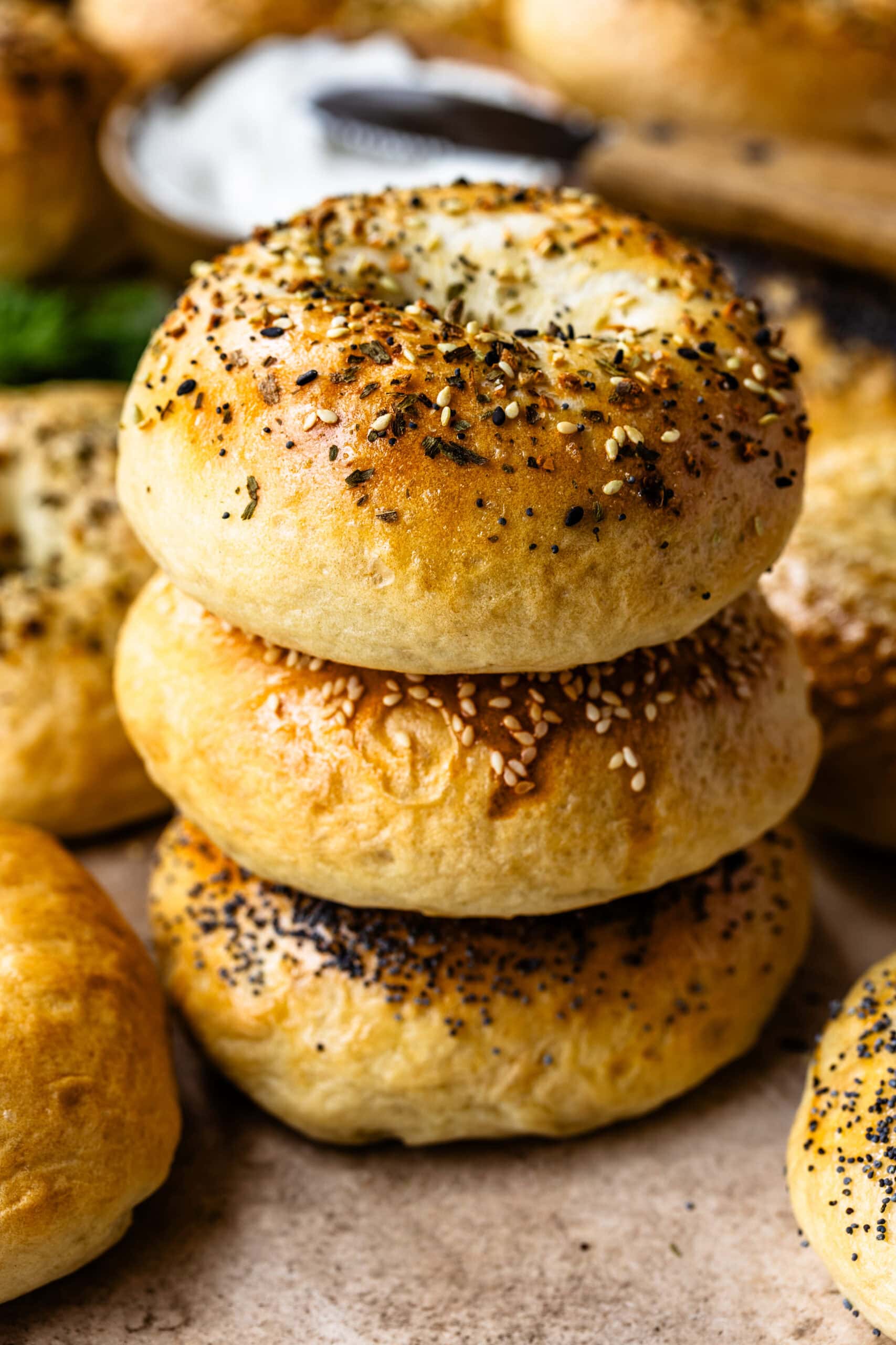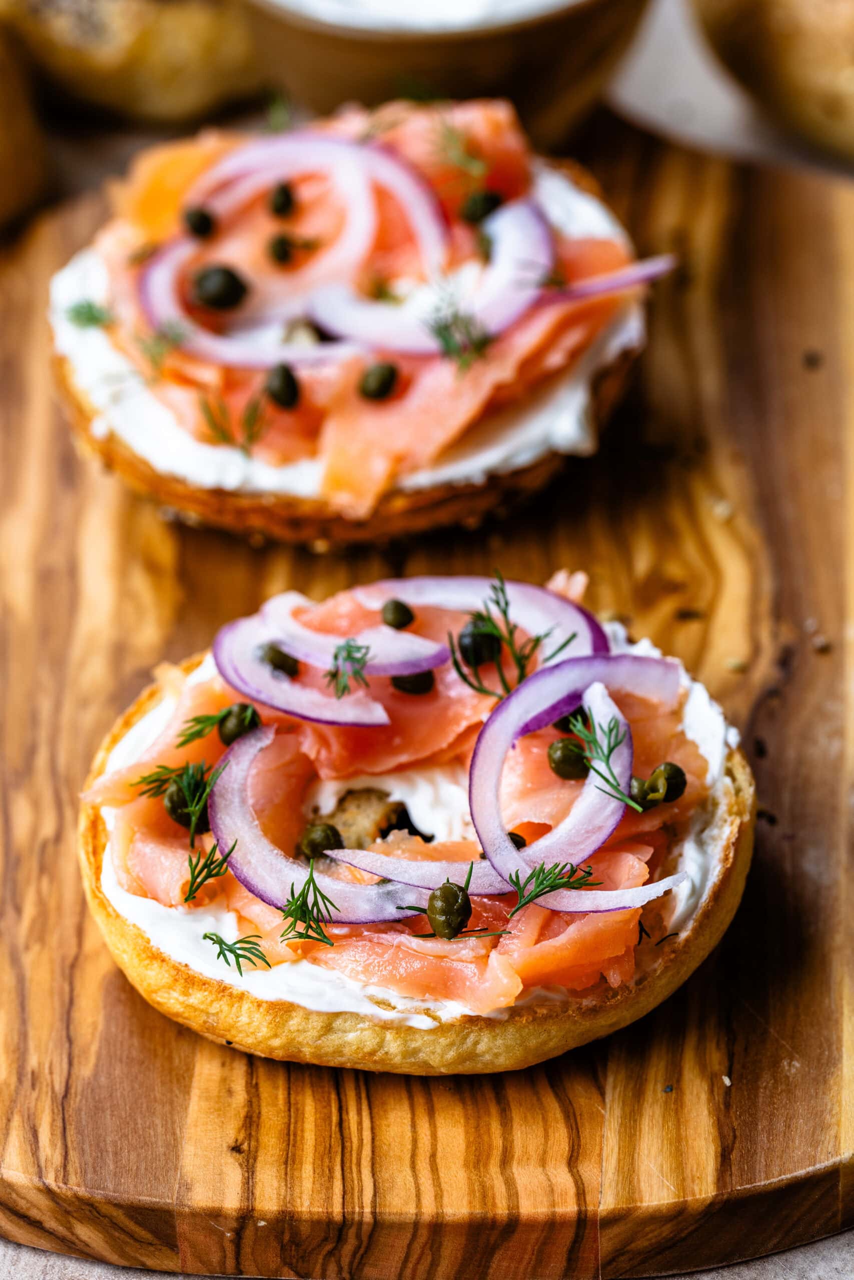 I keep toppings simple and familiar. A classic lox and cream cheese with smoked salmon, red onion, capers, and dill is always a favorite, and these bagels also hold up well to a bacon, egg, and cheese when I want something more filling. For something lighter, I like using them as an avocado toast base with salt, pepper, and a pinch of red pepper flakes. Theyโre also sturdy enough for egg salad or tuna salad, and occasionally Iโll turn one into a quick bagel pizza with marinara and mozzarella, toasted just until the cheese melts. I also have a high-protein bagel recipe and a sourdough bagel recipe for you to try!