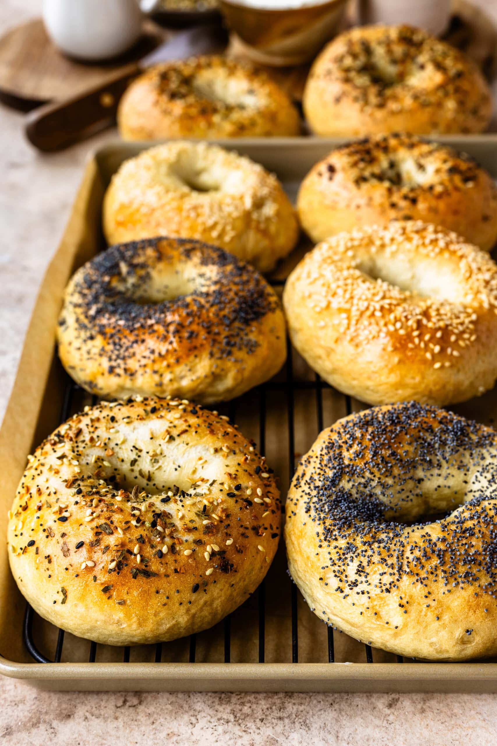 - Remove the bagels from the oven and let them cool on a wire rack for at least 10 minutes before serving.