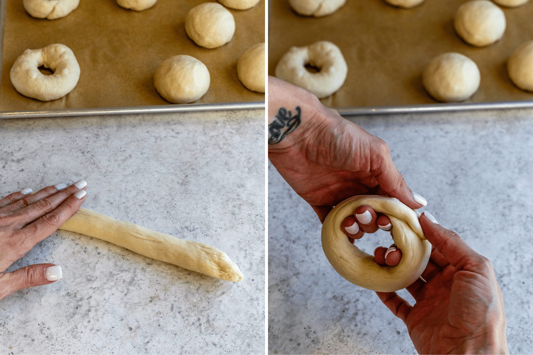 - Alternatively, you can roll each ball into a log, and pinch the ends together. Place the shaped bagels on a parchment-lined tray.