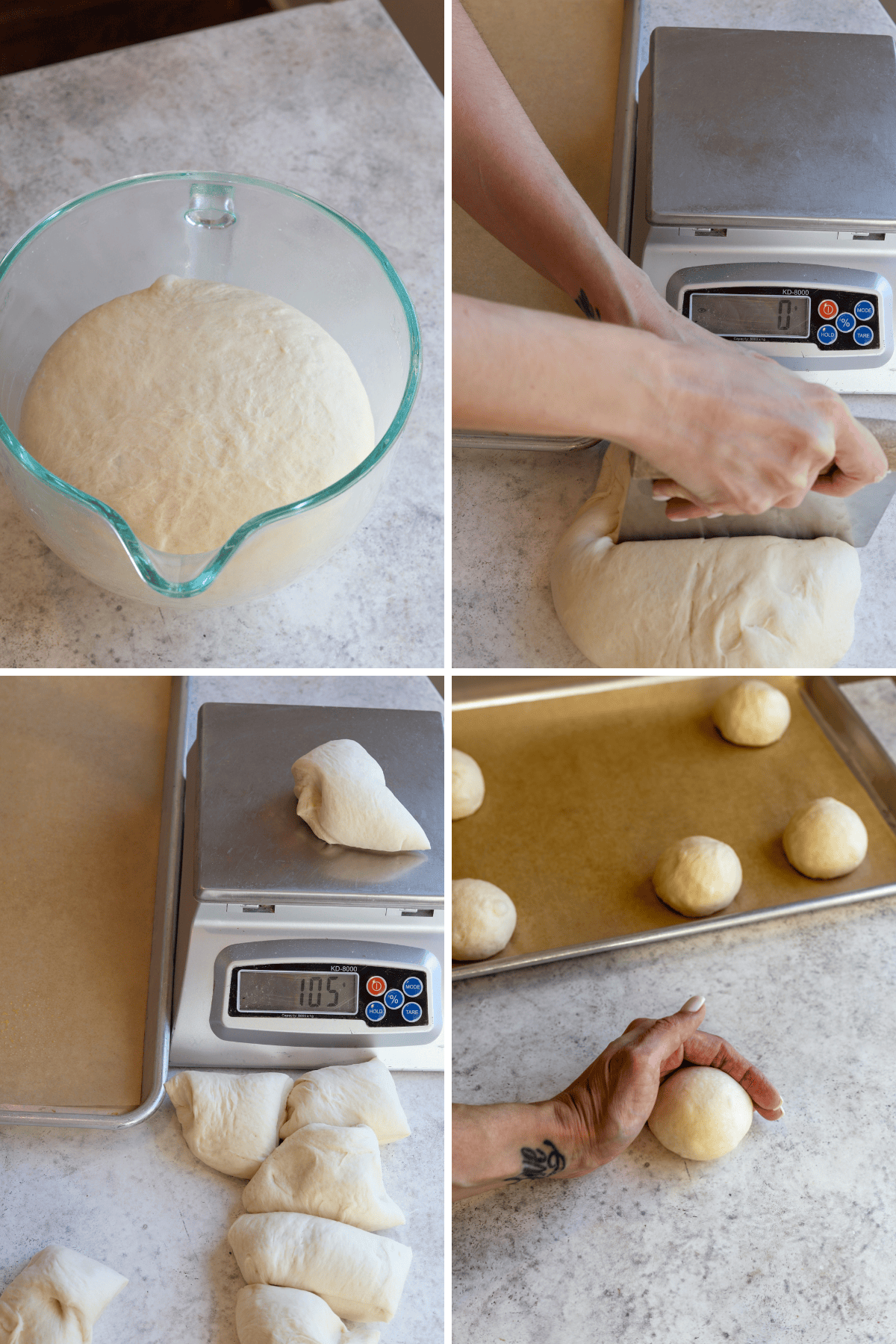 - Roll each piece into a smooth ball by cupping your hand over the dough and gently pulling it toward you against the countertop. This motion creates surface tension, which helps form a tight, smooth ball.