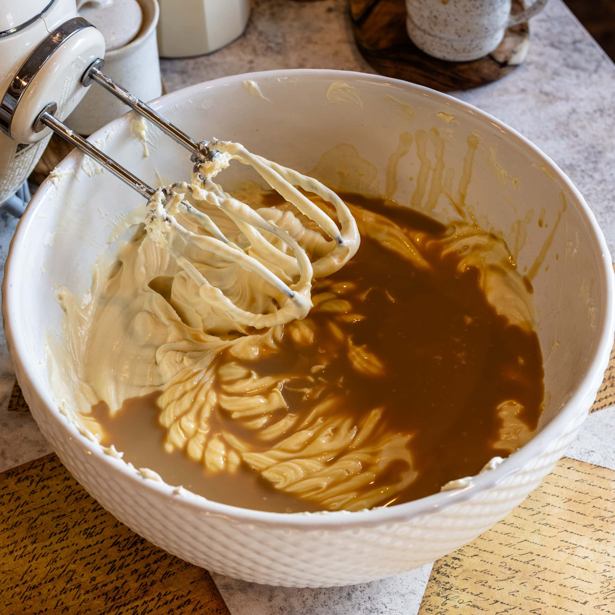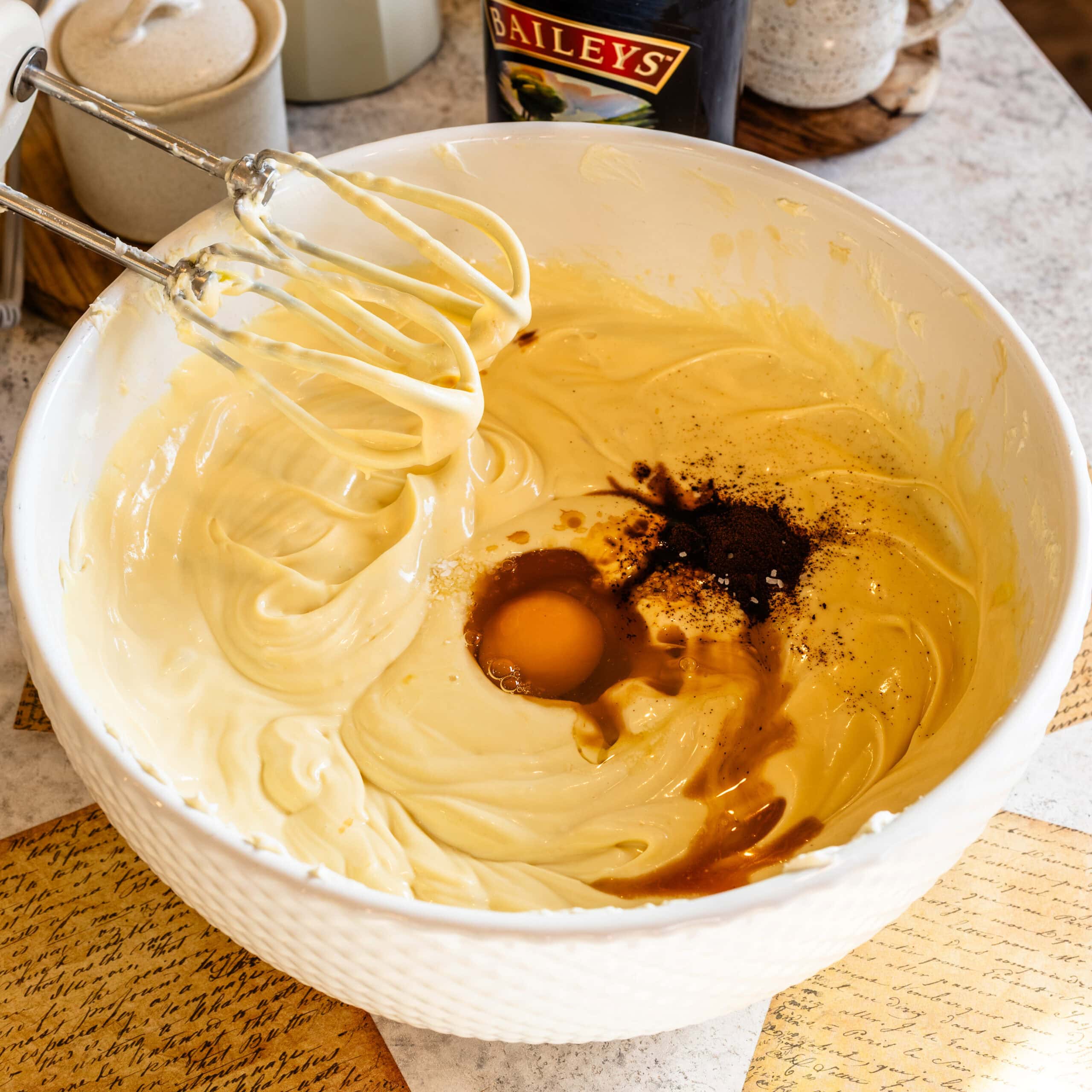 - Pour the Baileyโs in and mix. Scrape the bowl and beat for another 30 seconds.