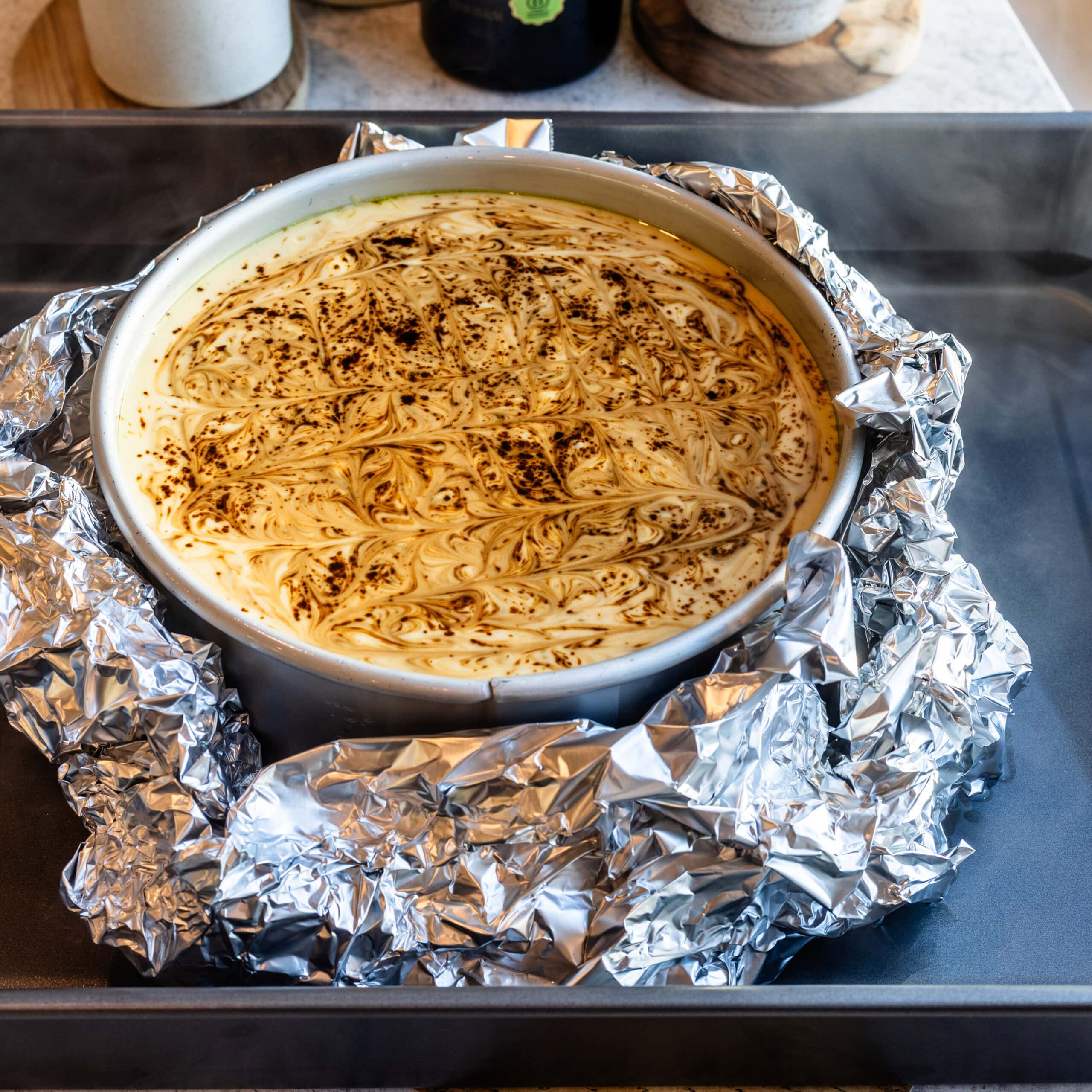 Wrap the bottom of the pan with a few layers of foil, then place it inside a large roasting pan for the water bath. Fill the roasting pan with hot water so it reaches halfway up the sides of the cheesecake pan.