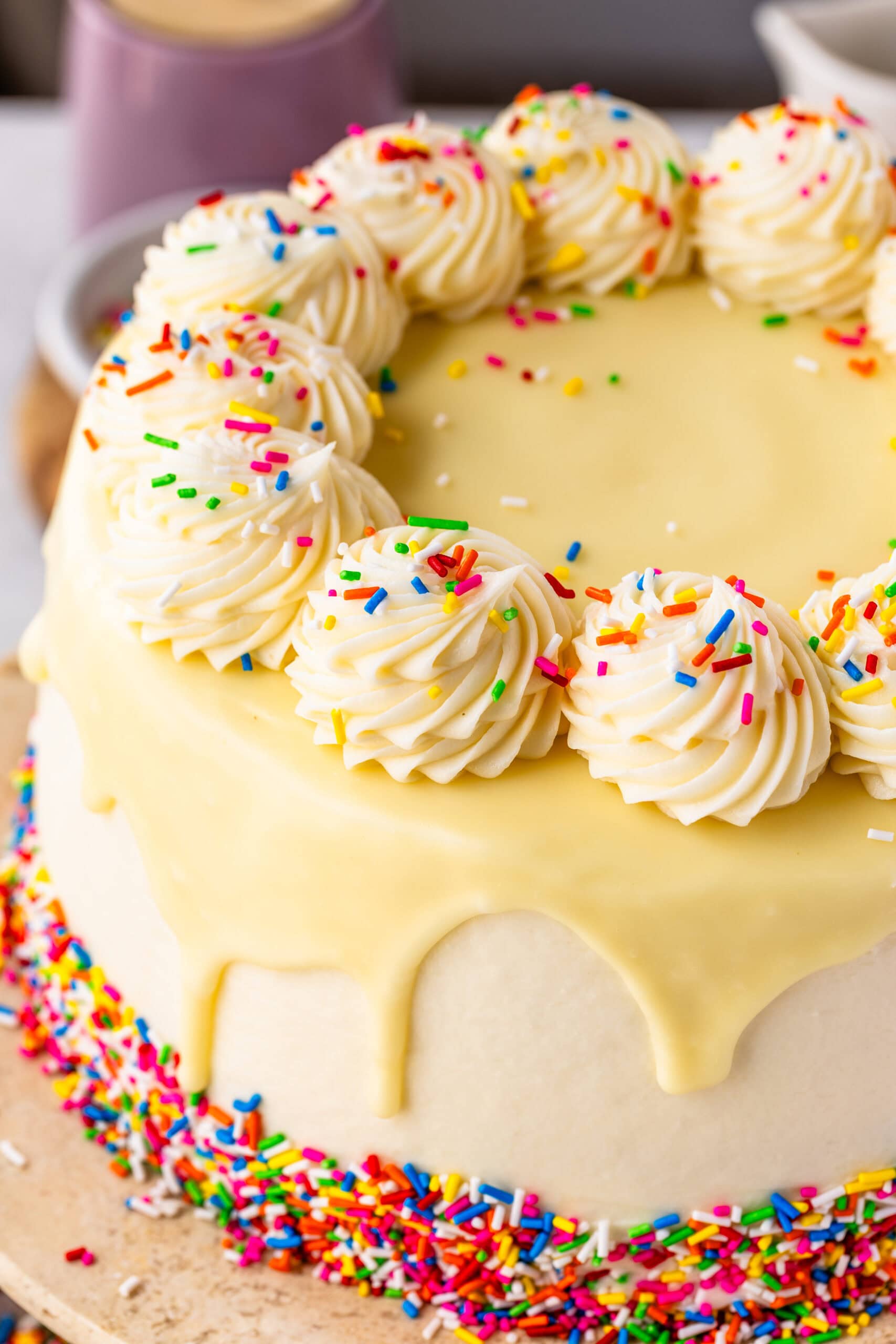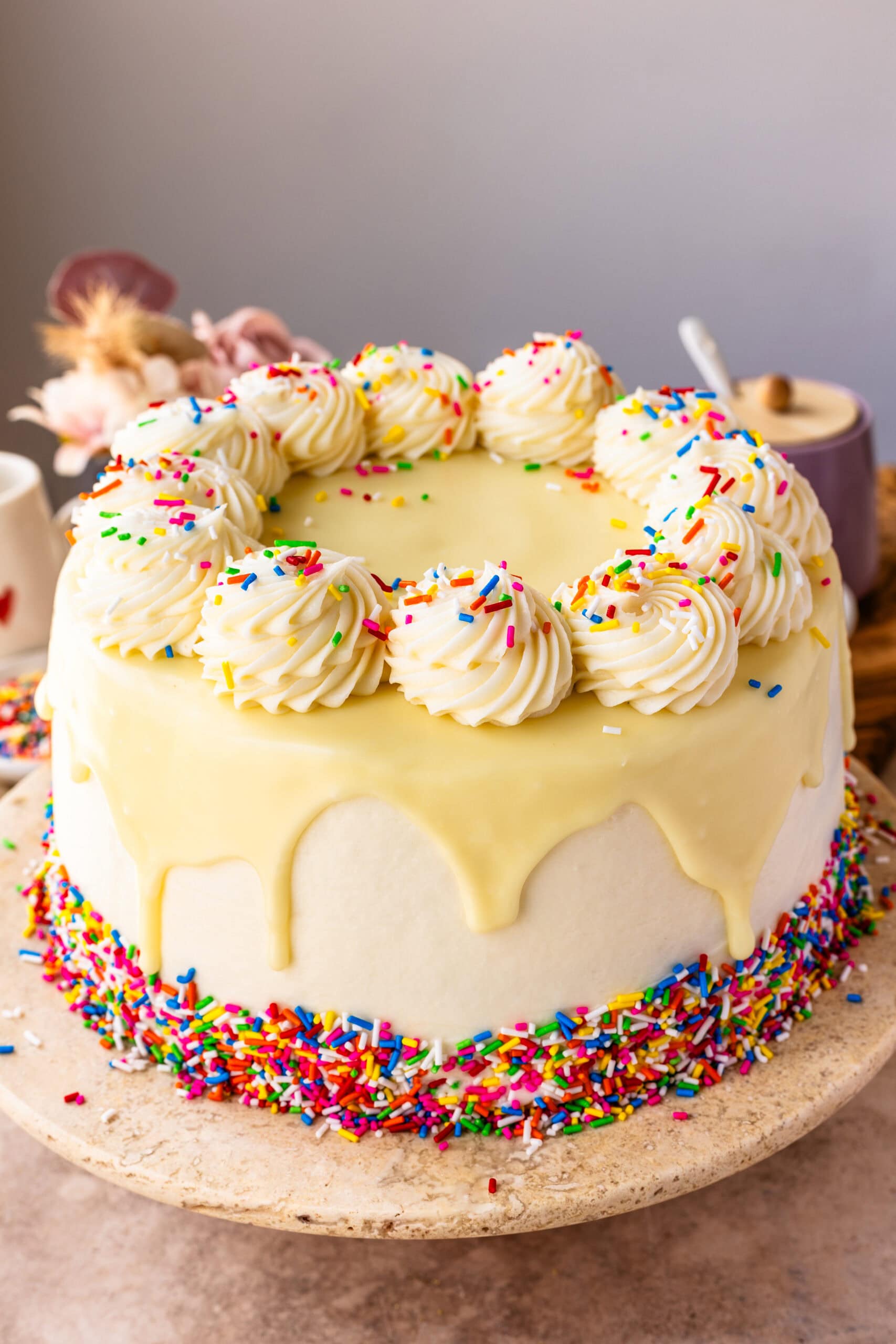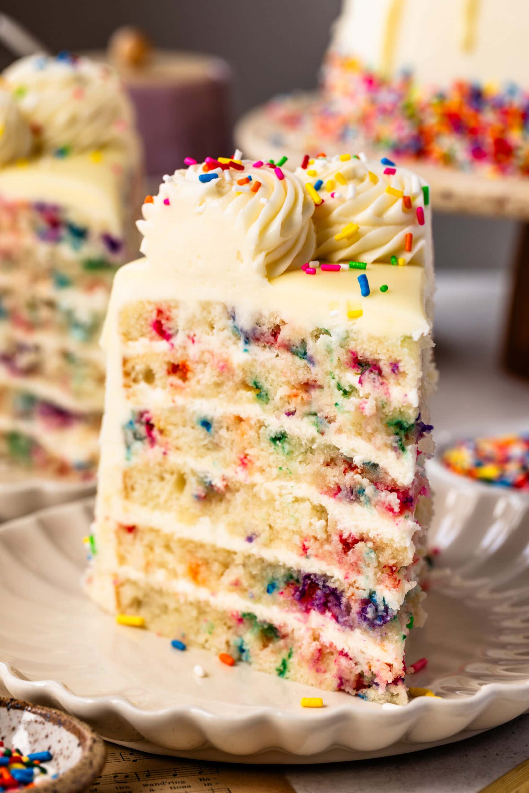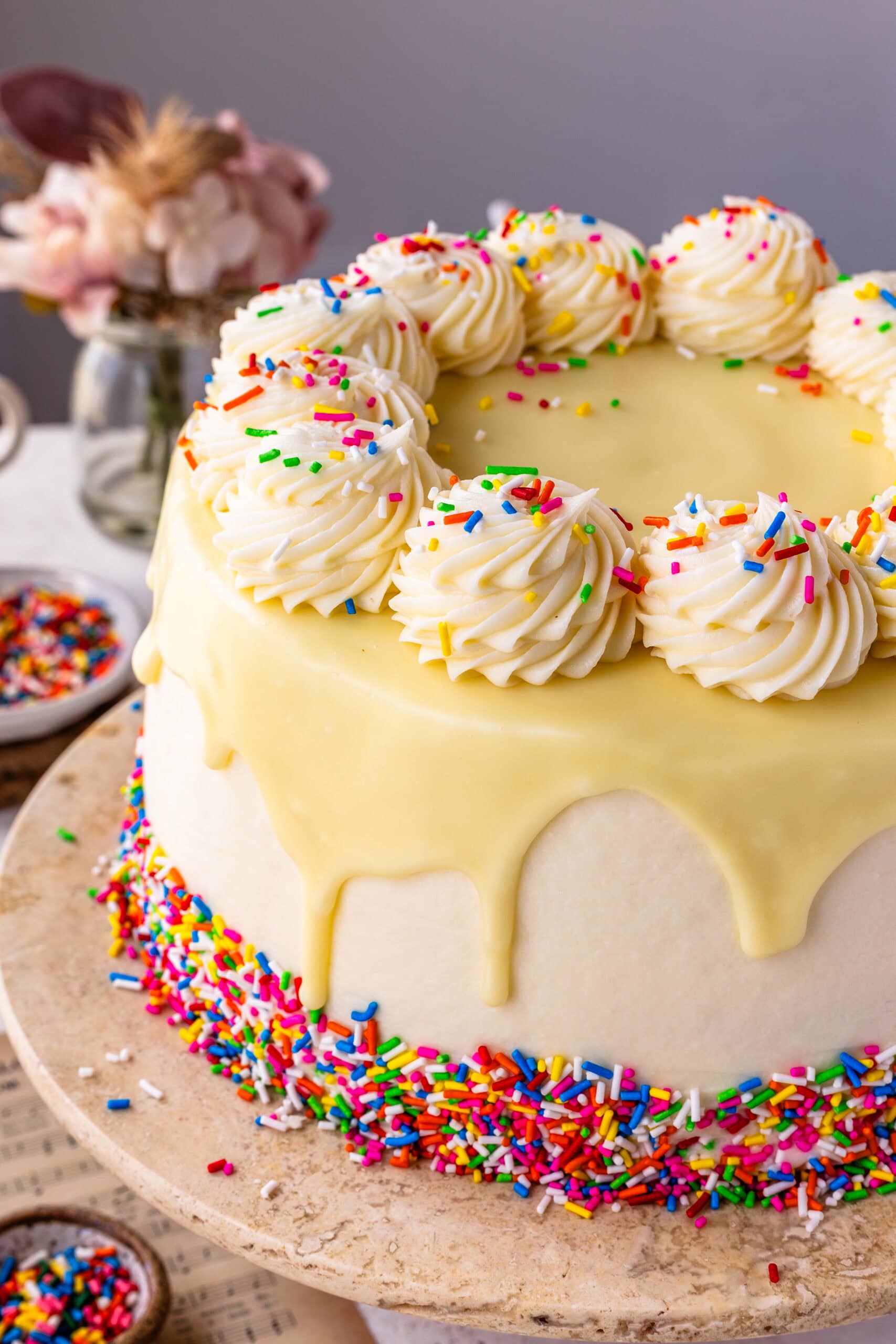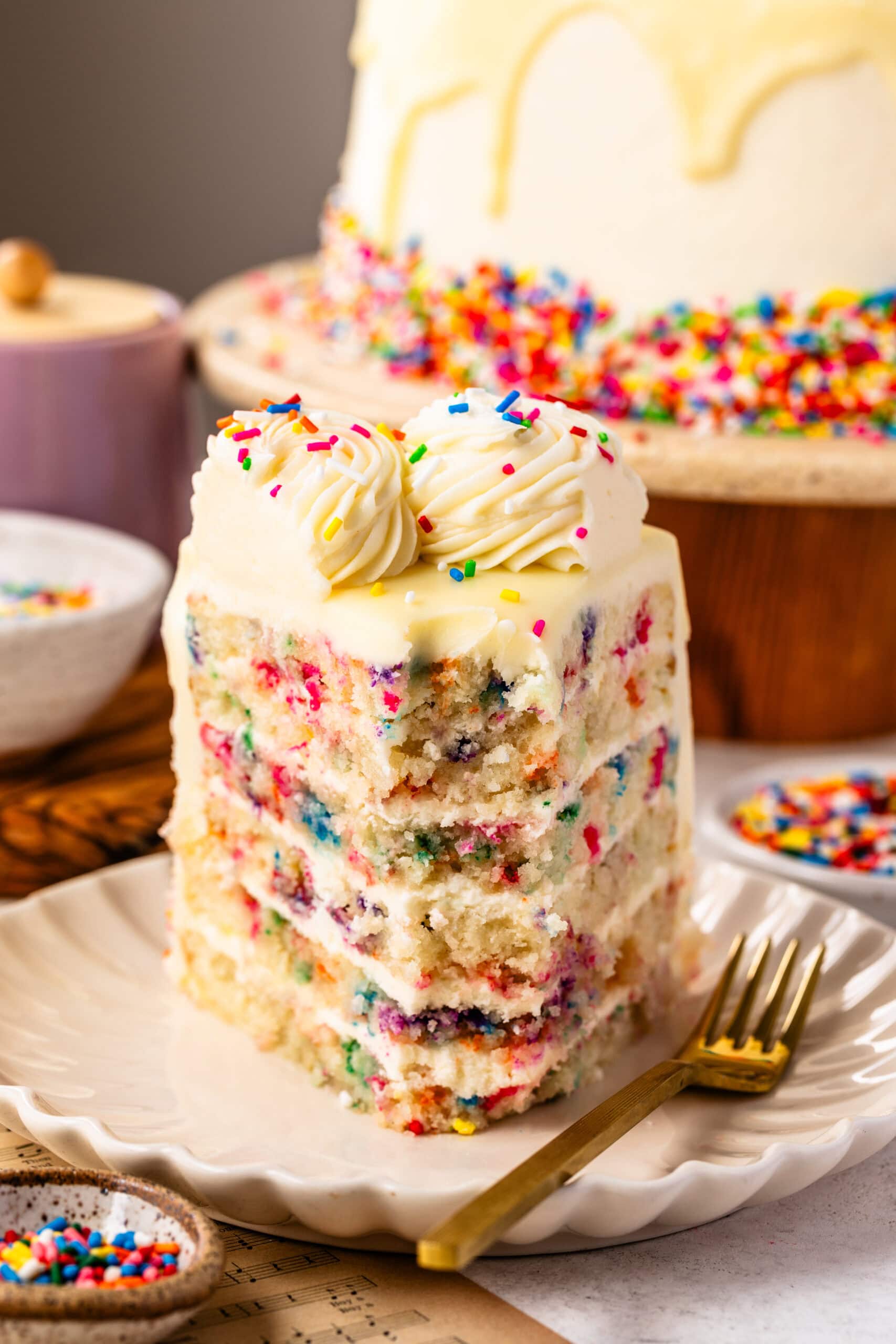I set out to create the ultimate funfetti cake. Thin, delicateย layersย ofย vanilla cakeย and frosting, finished with a white chocolate ganache and a shower of sprinkles. Itโs incredibly indulgent, packed withย vanilla flavor, and melts in your mouth like a soft, velvety dream.