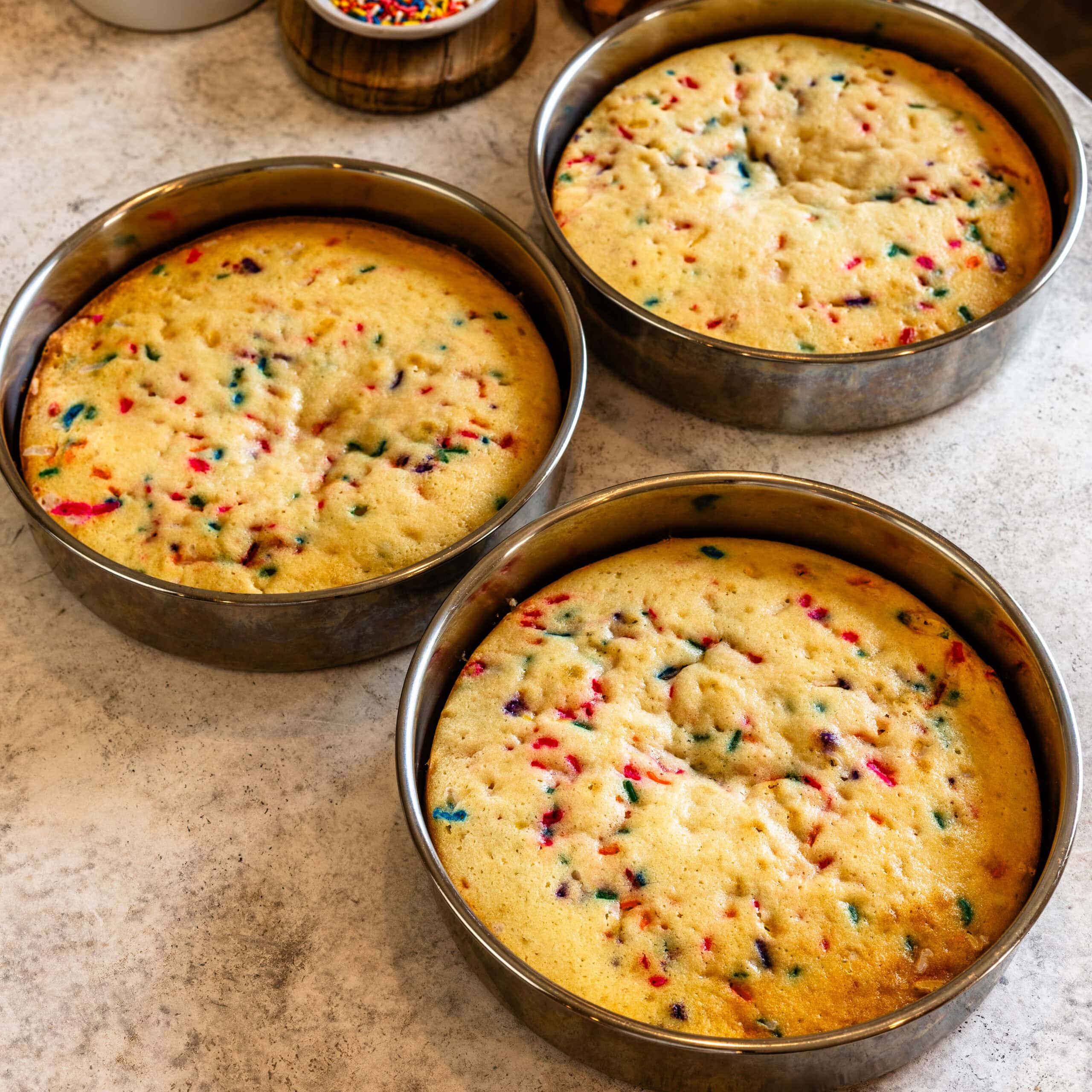 - Once the cake layers have cooled completely, you can slice each layer in half horizontally if you baked three layers and want a 6-layer cake. Otherwise, keep them as is for a 3-layer cake.