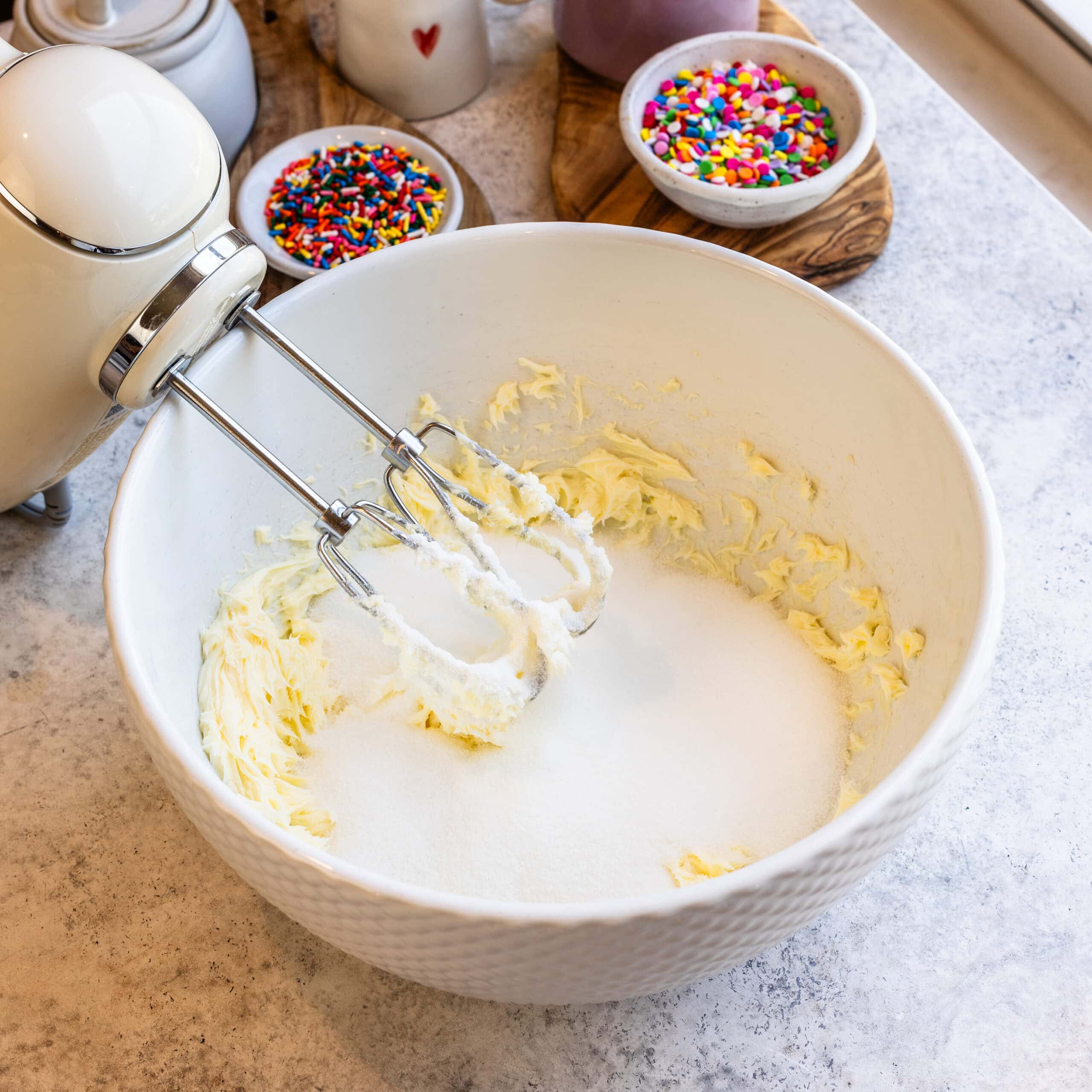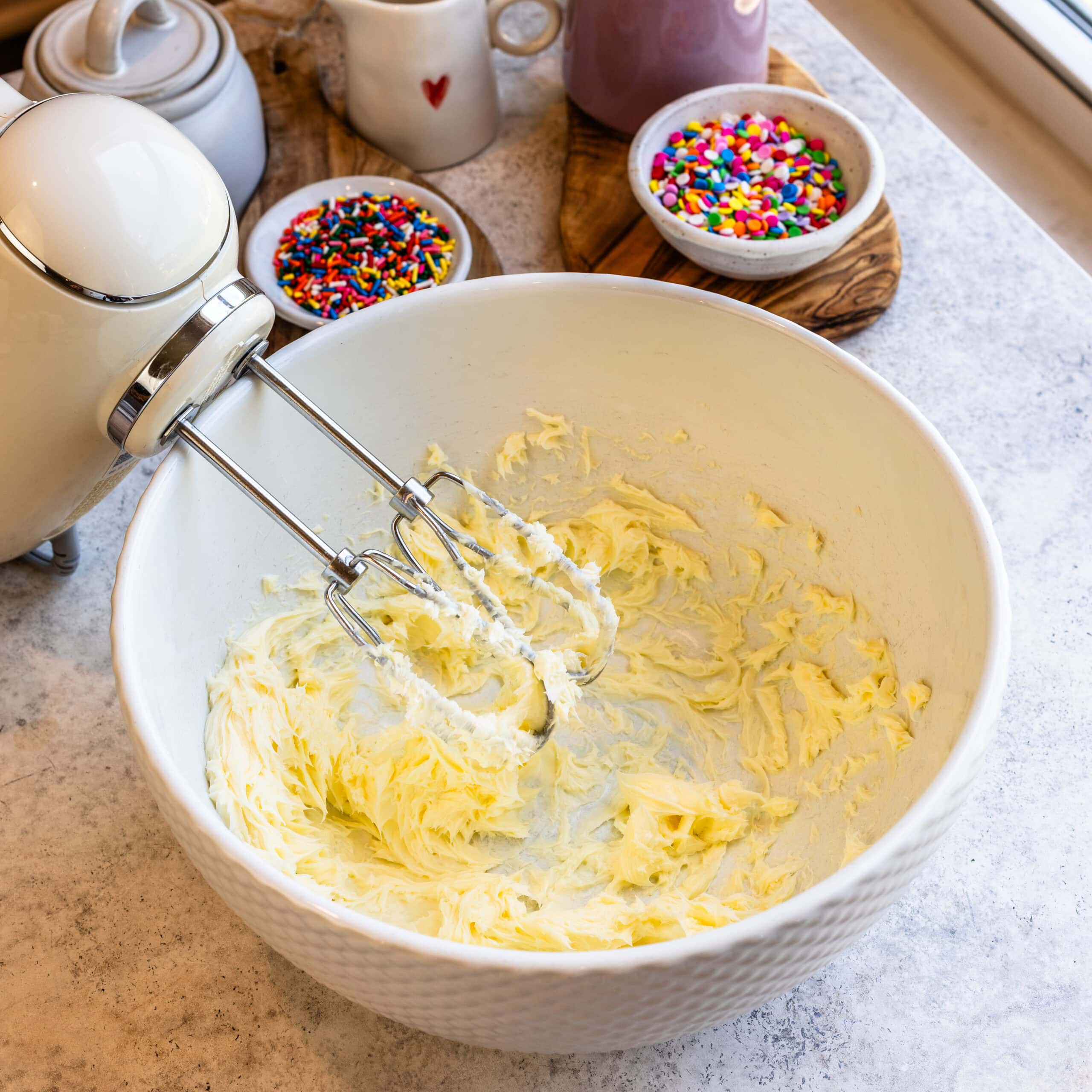 - In a large bowl, beat the butter for thirty seconds. Add the sugar and beat for another minute on medium speed for 2-3 minutes, until light and fluffy.