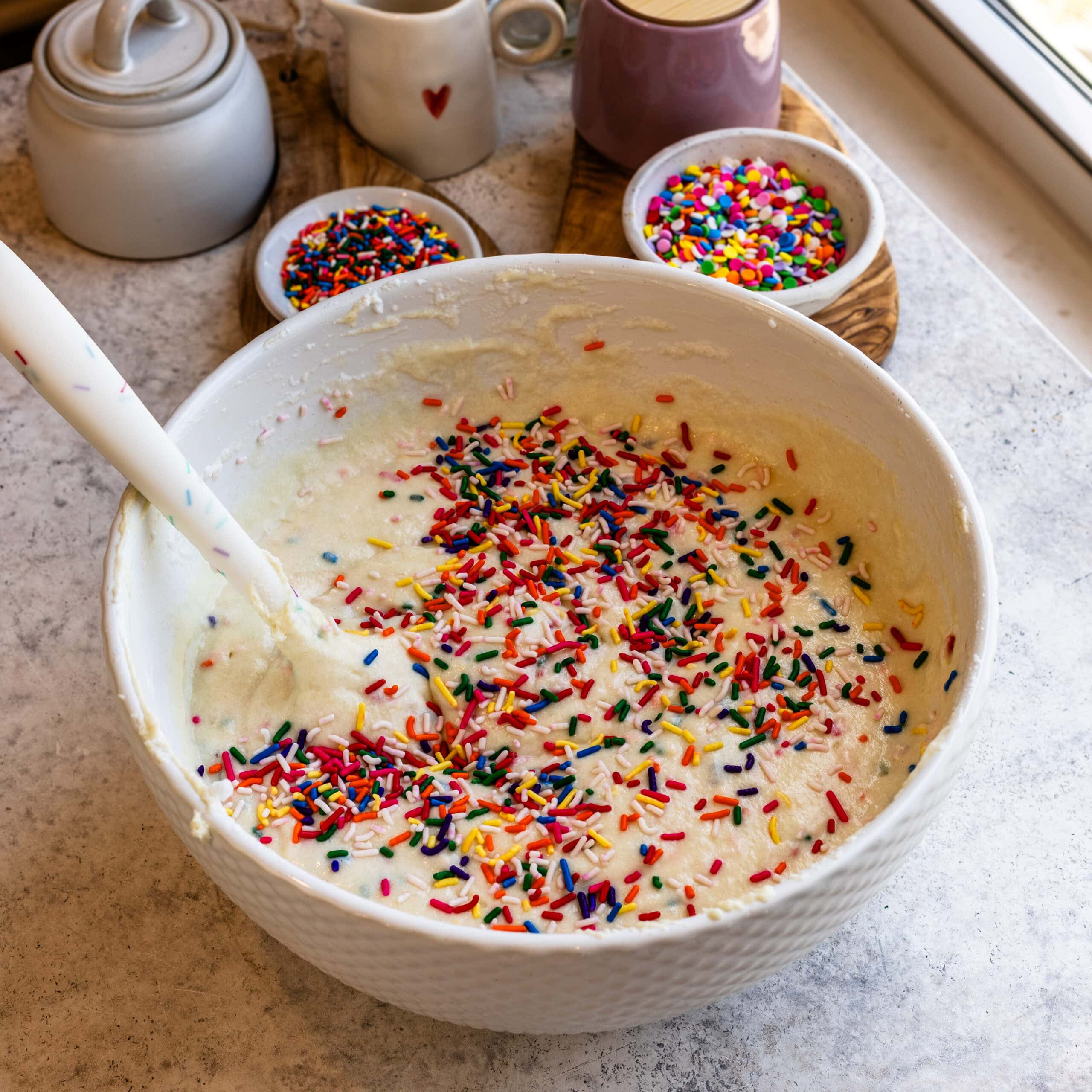 - Finish with a generous sprinkle of funfetti sprinkles over the top.
