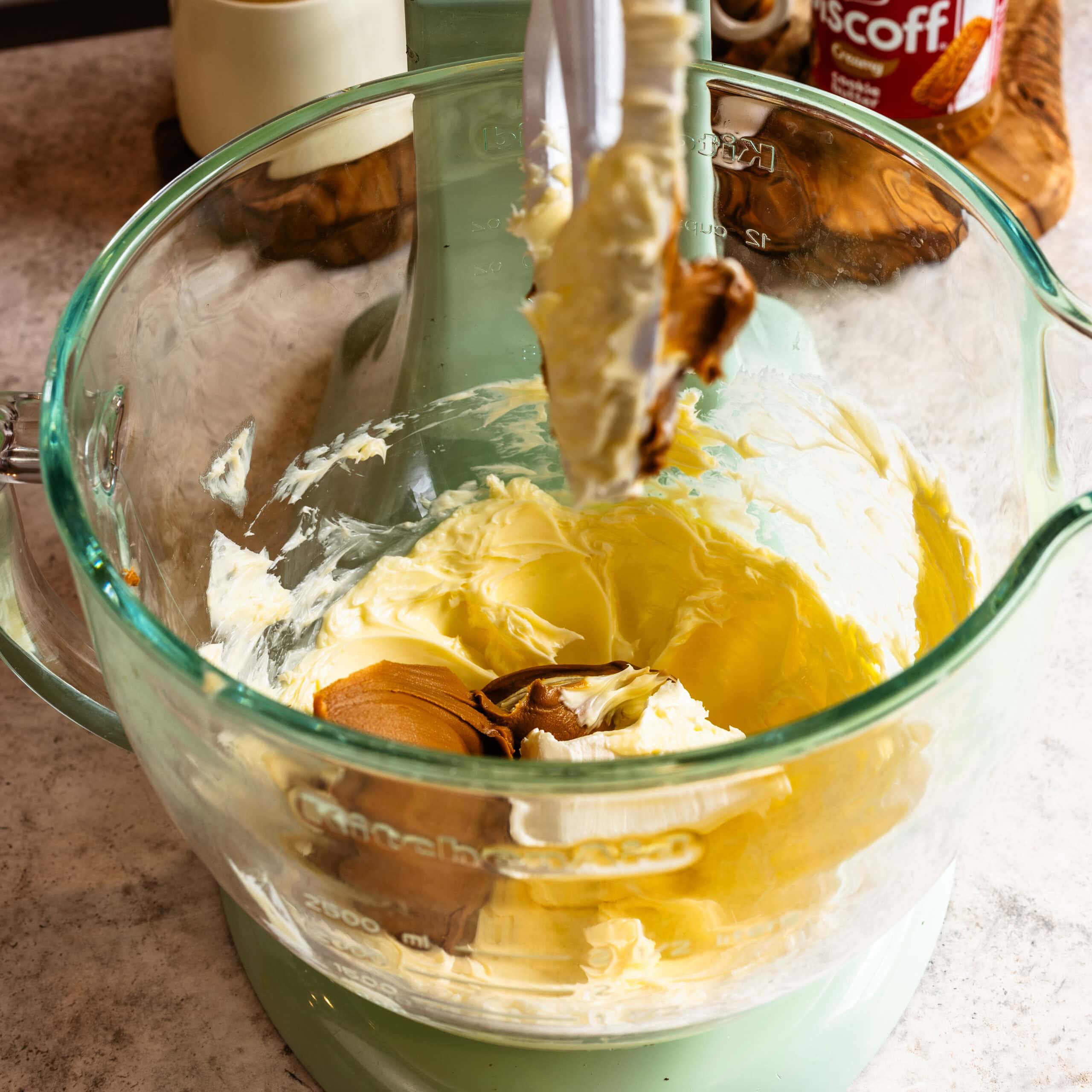 Beat the butter for 1 minute, then add the cream cheese and mix again. Next, add the Biscoff cookie butter and whip until smooth.