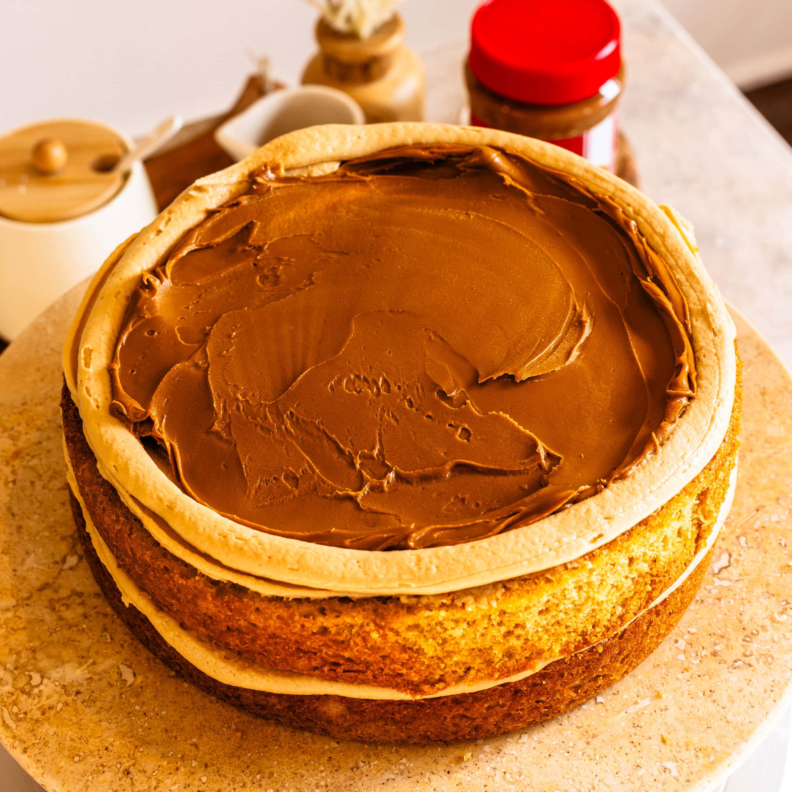 • Repeat with the syrup, frosting, and Biscoff spread. Then another cake layer. Repeat again.
