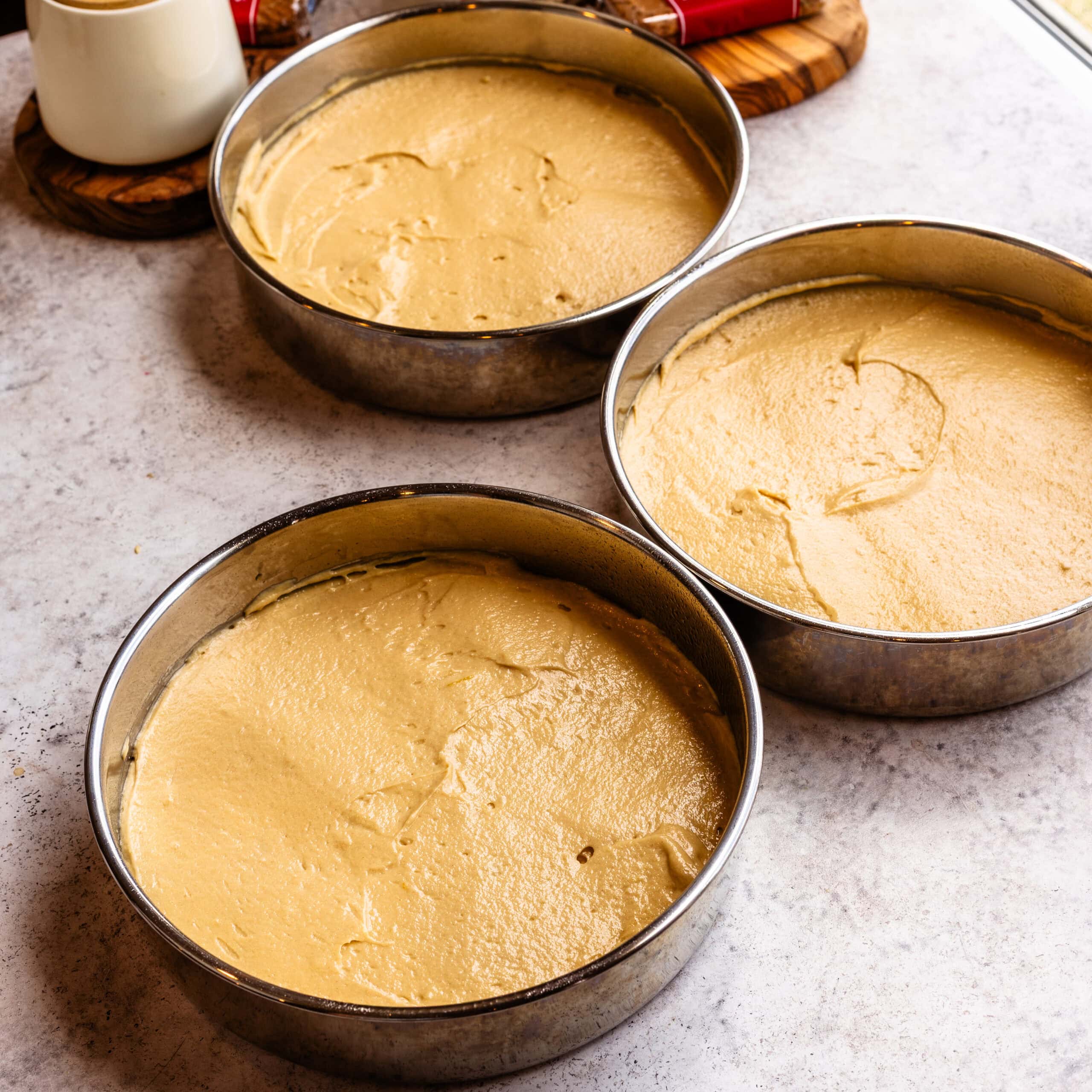 • Divide the batter between the 3 cake pans. Use an offset spatula to smooth it out.