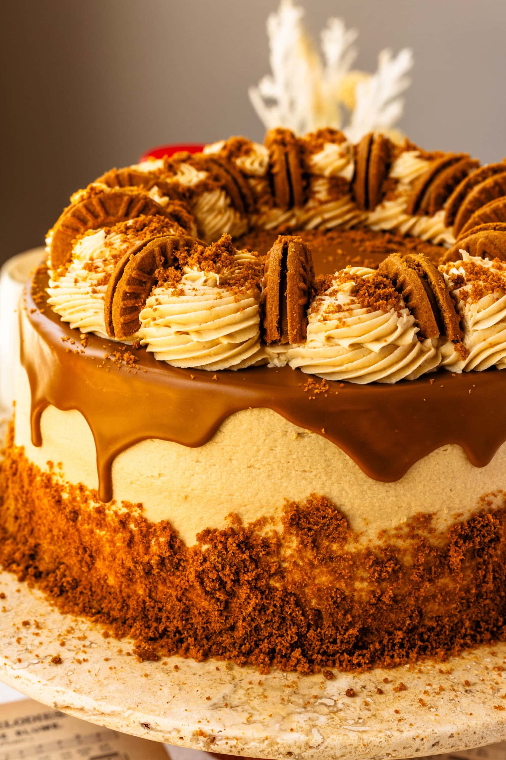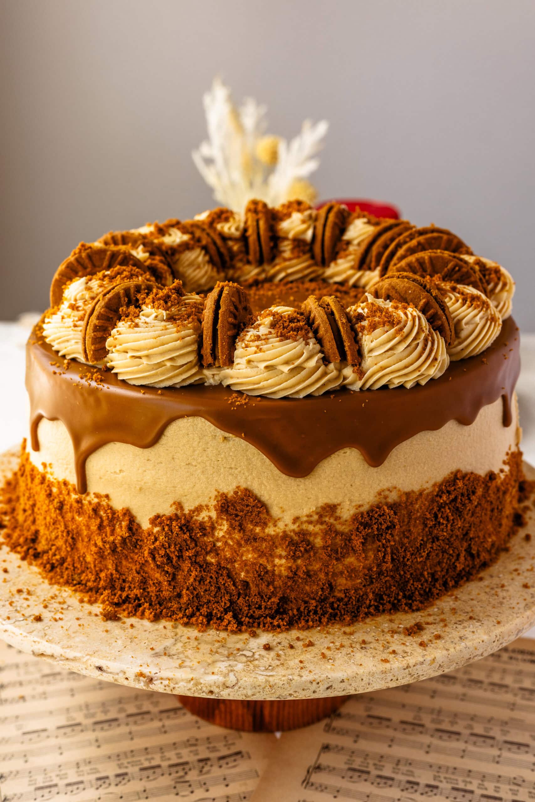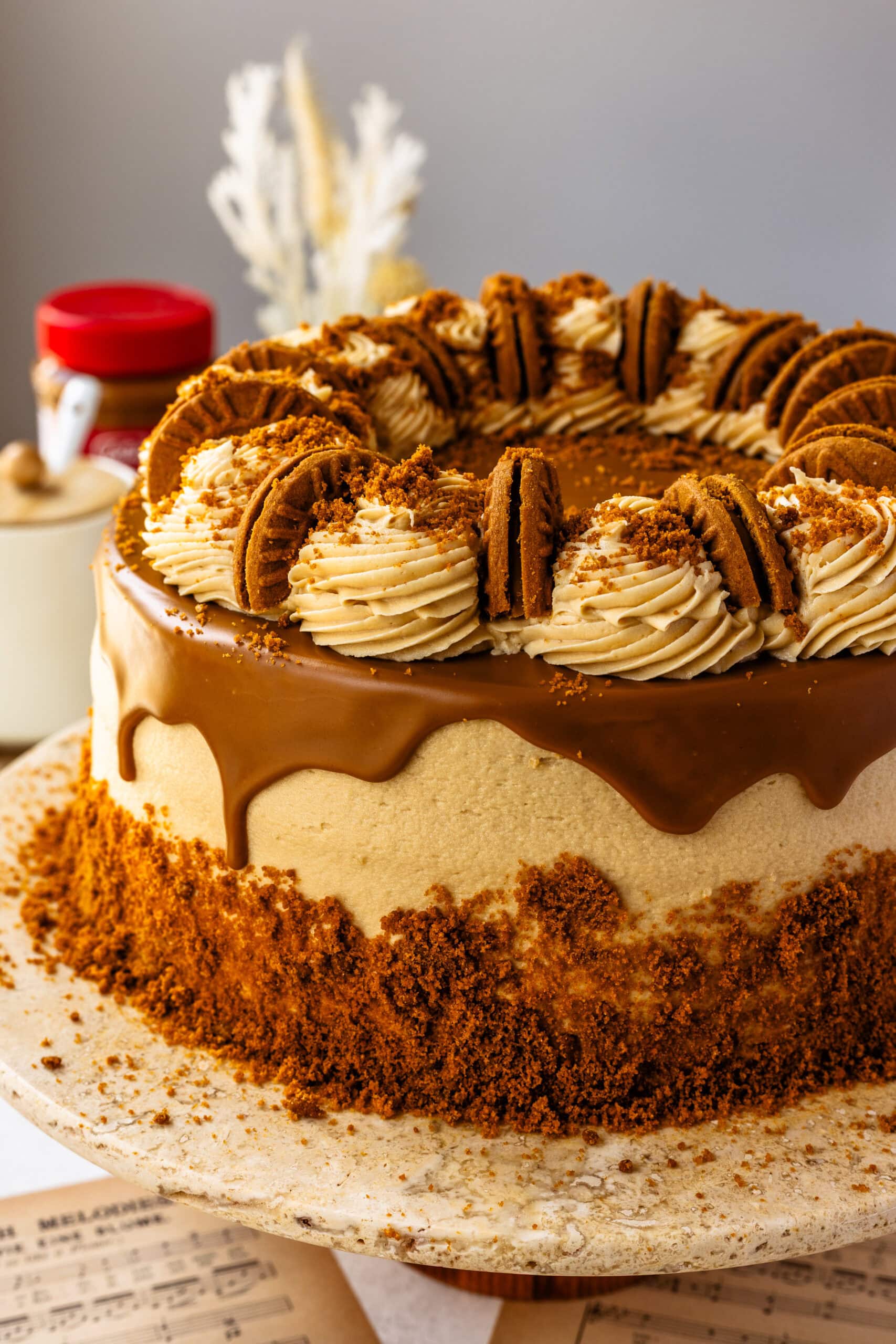 A Biscoff cake decorated with cookie butter frosting swirls, Biscoff cookies, and a smooth cookie butter drip, finished with Biscoff crumbs around the base.