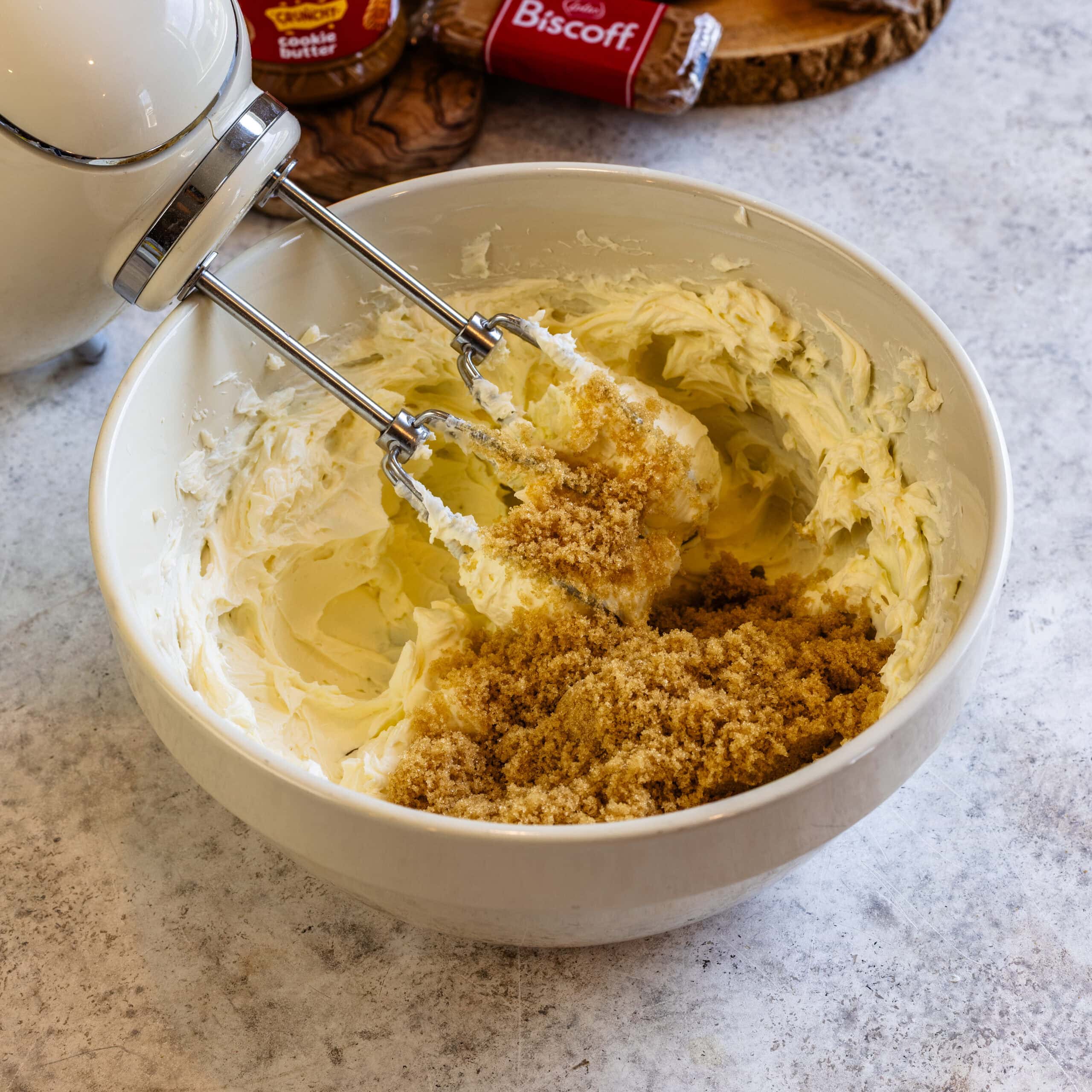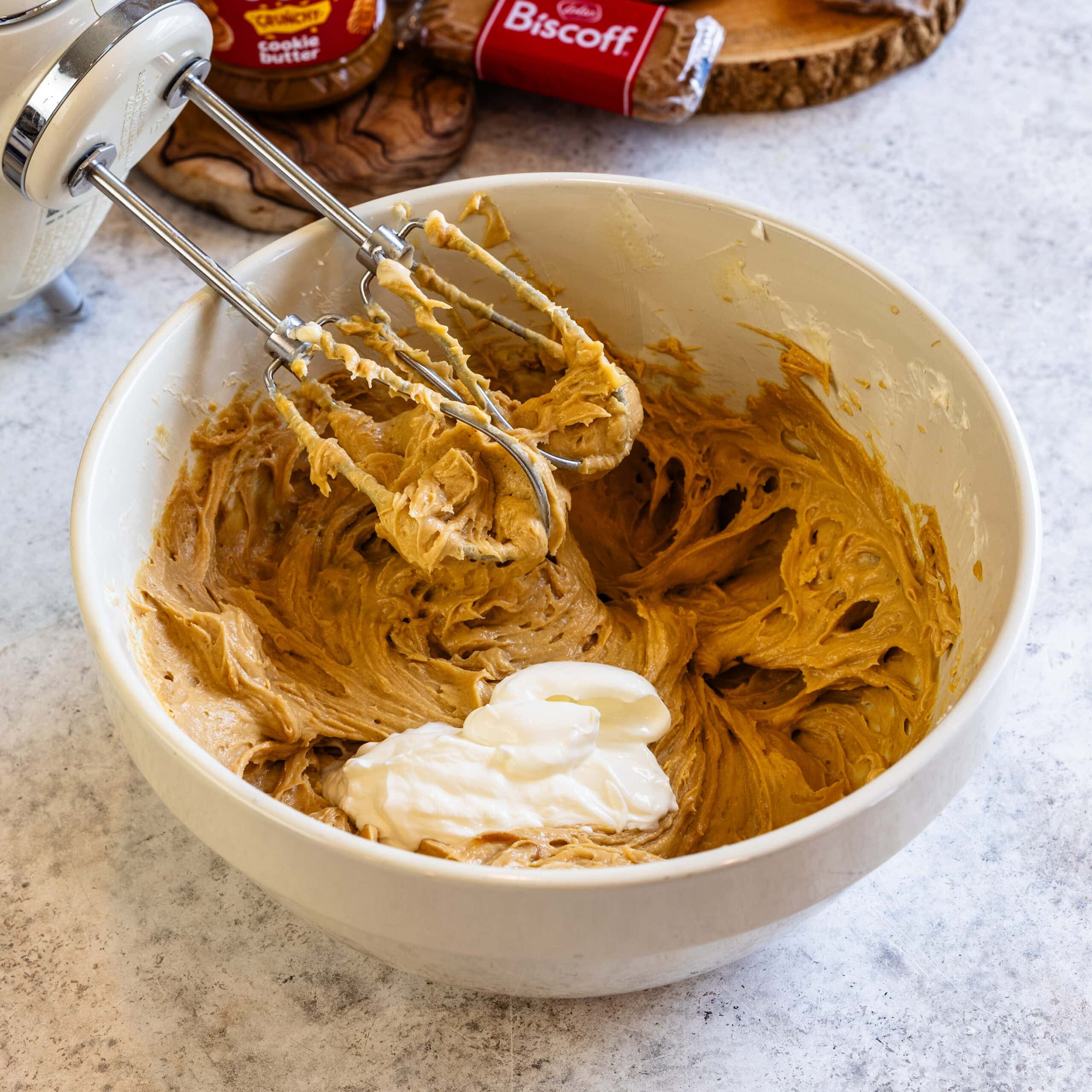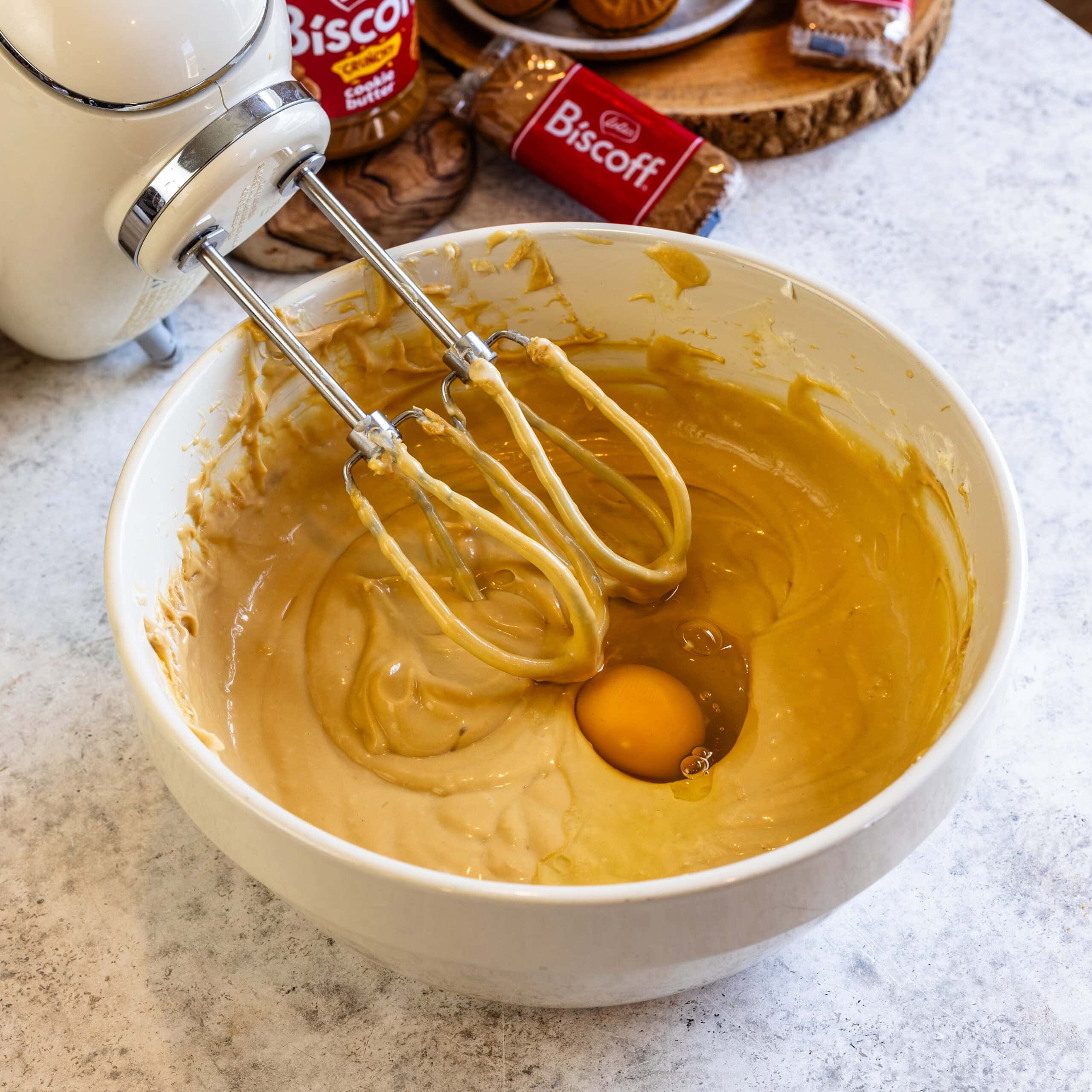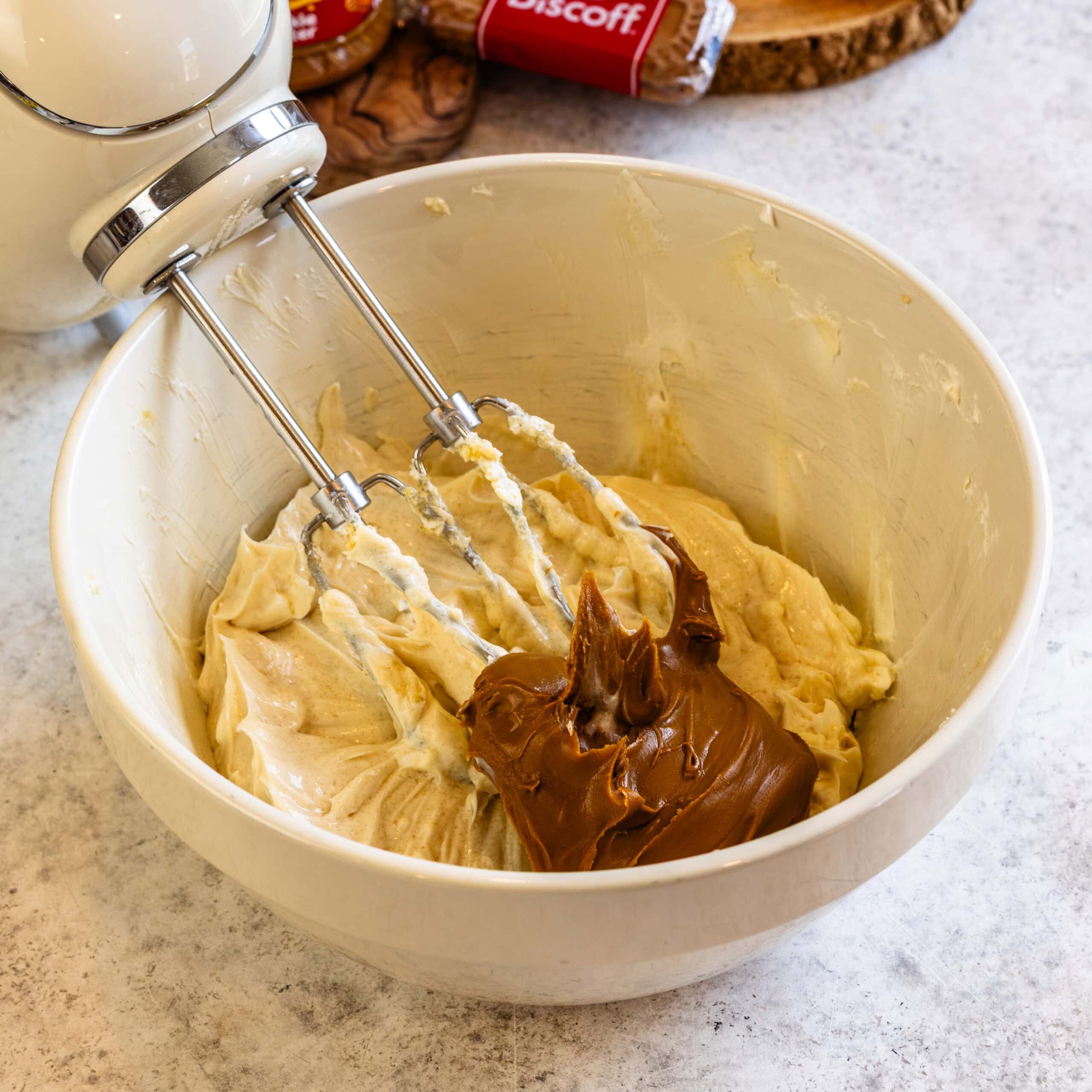 - Add the Biscoff cookie butter and mix to combine.