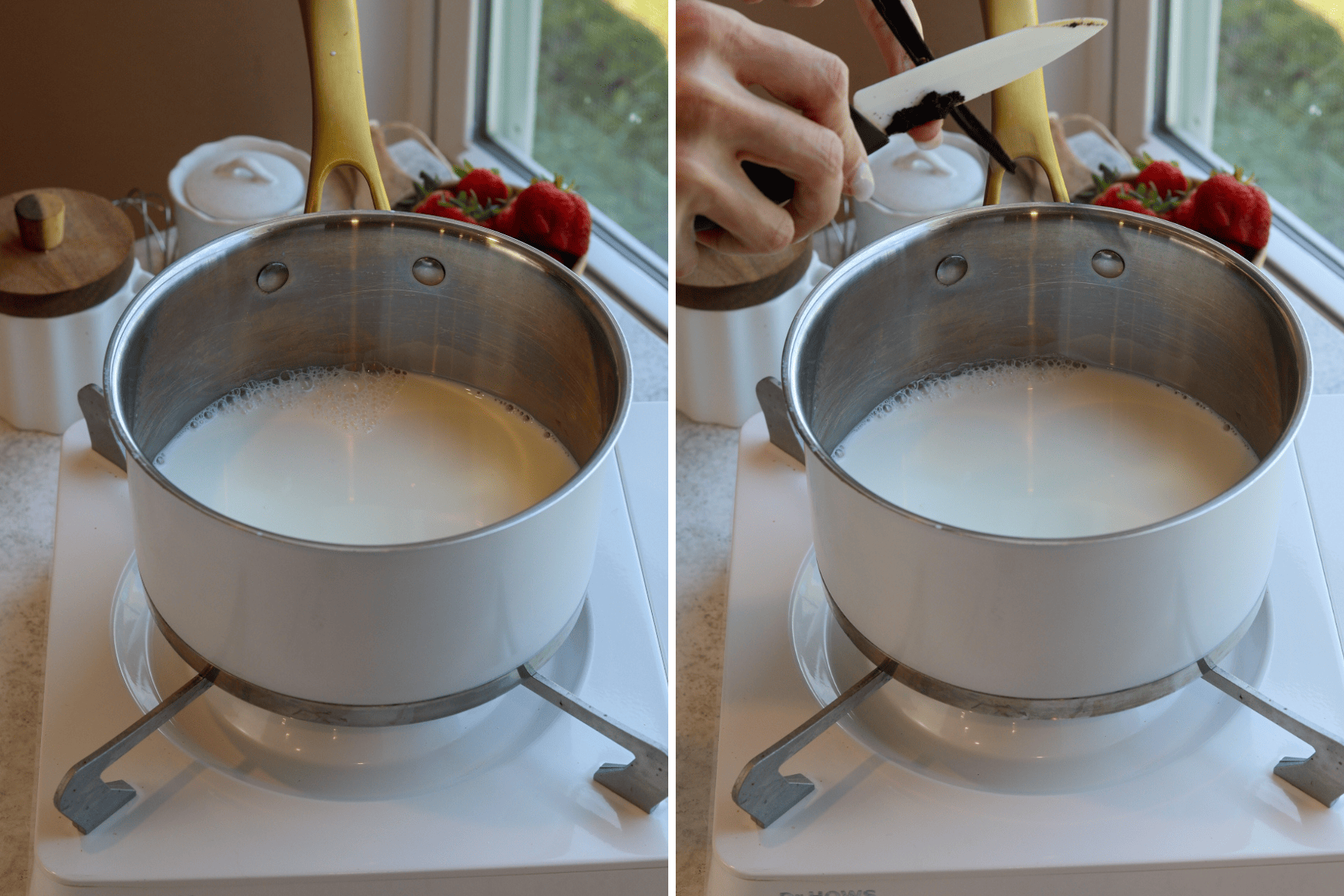 Start by splitting the vanilla bean and scraping out the seeds. Add the seeds and pods to a saucepan with the whole milk and heat gently until just simmering. If using vanilla extract instead, add it after cooking.