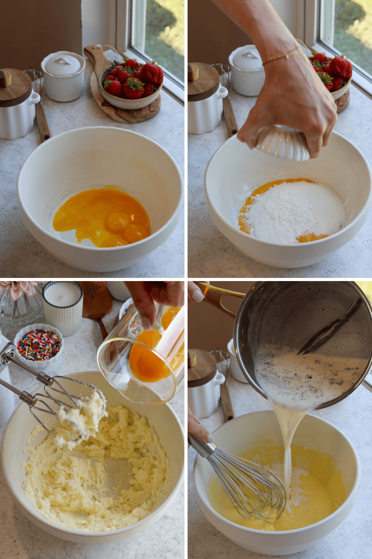 - Pour about 1/4 cup of hot vanilla milk over the yolks while whisking. Do this slowly so you donโt cook the eggs. This process is called tempering the eggs, add the milk very slowly in order to not scramble the eggs.