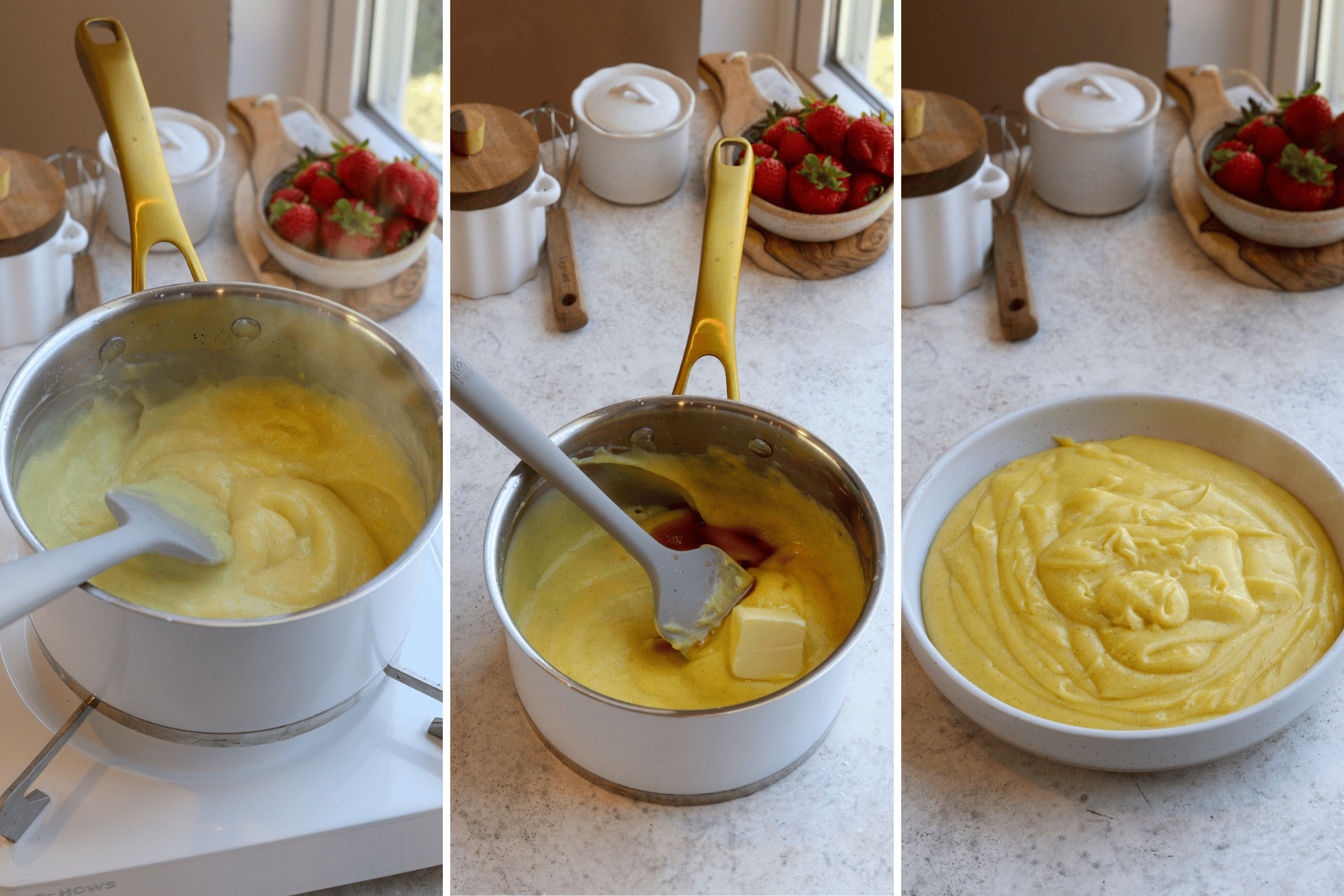 - Place the pan over medium heat, and begin to cook the custard stirring non-stop.
