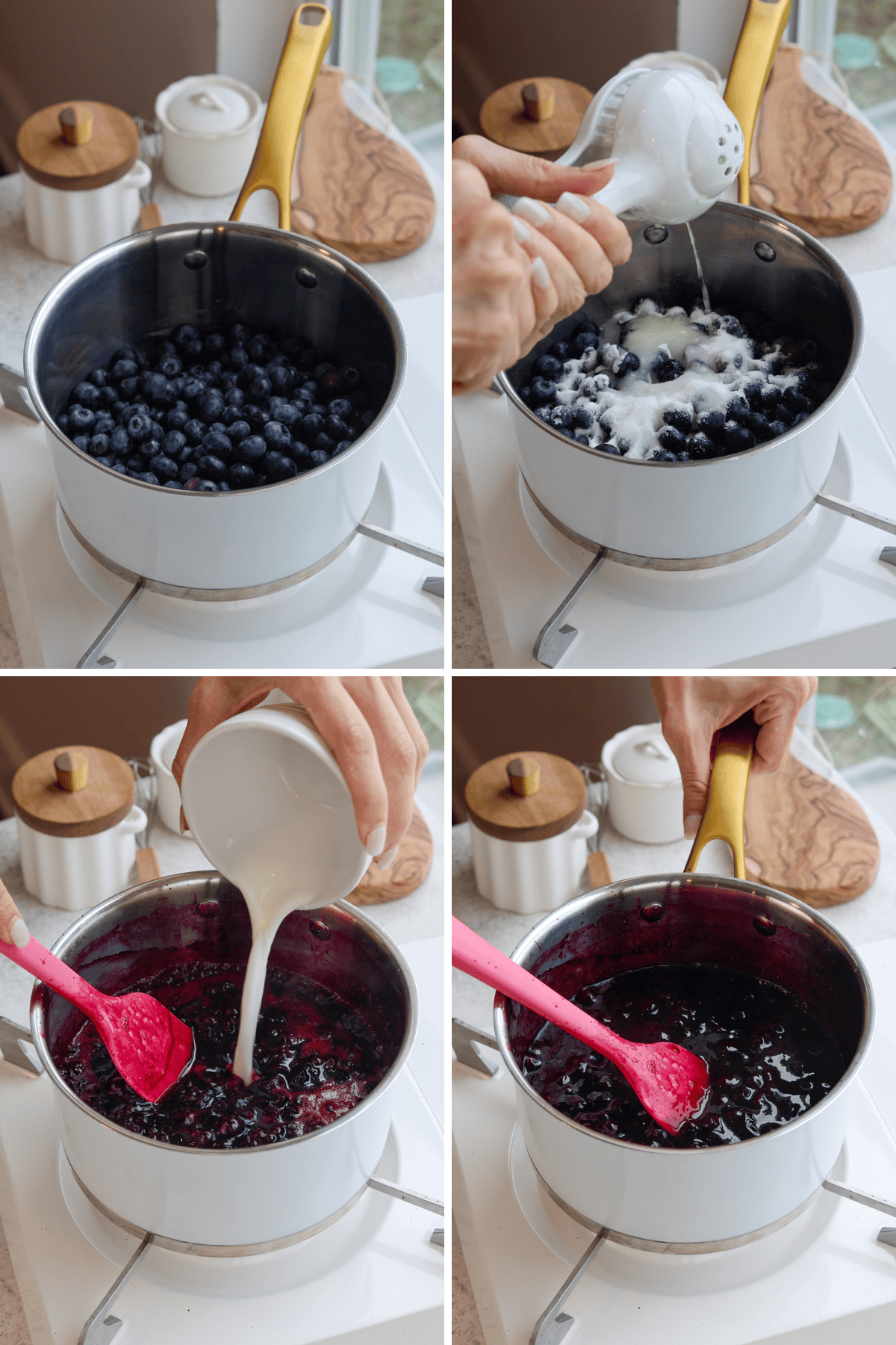 - In a small saucepan, combine the blueberries, sugar, and lemon juice.