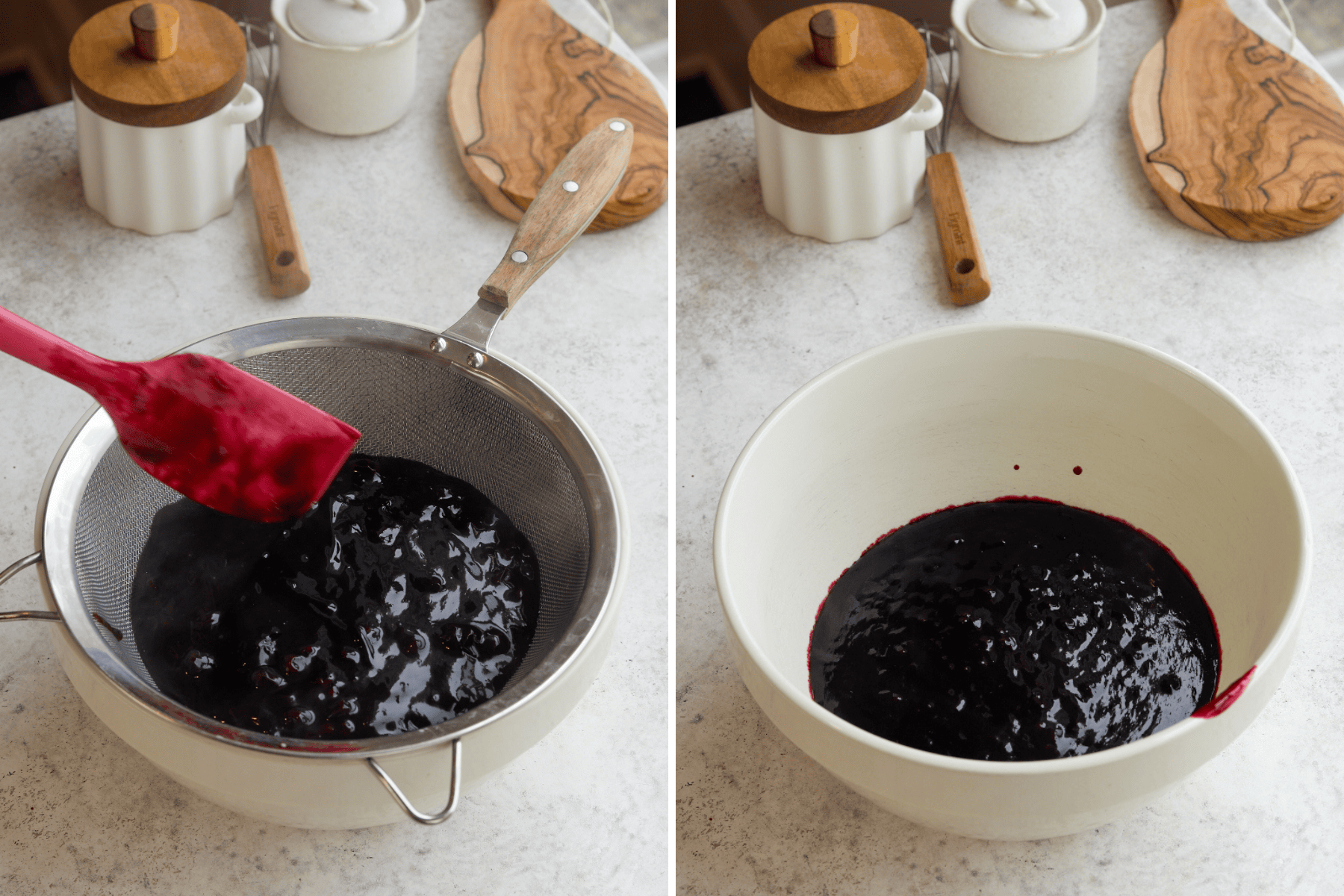 - Pour the mixture through a fine-mesh sieve into a bowl. Use a spatula or spoon to press the sauce through, leaving the skins and seeds behind. Discard the solids.