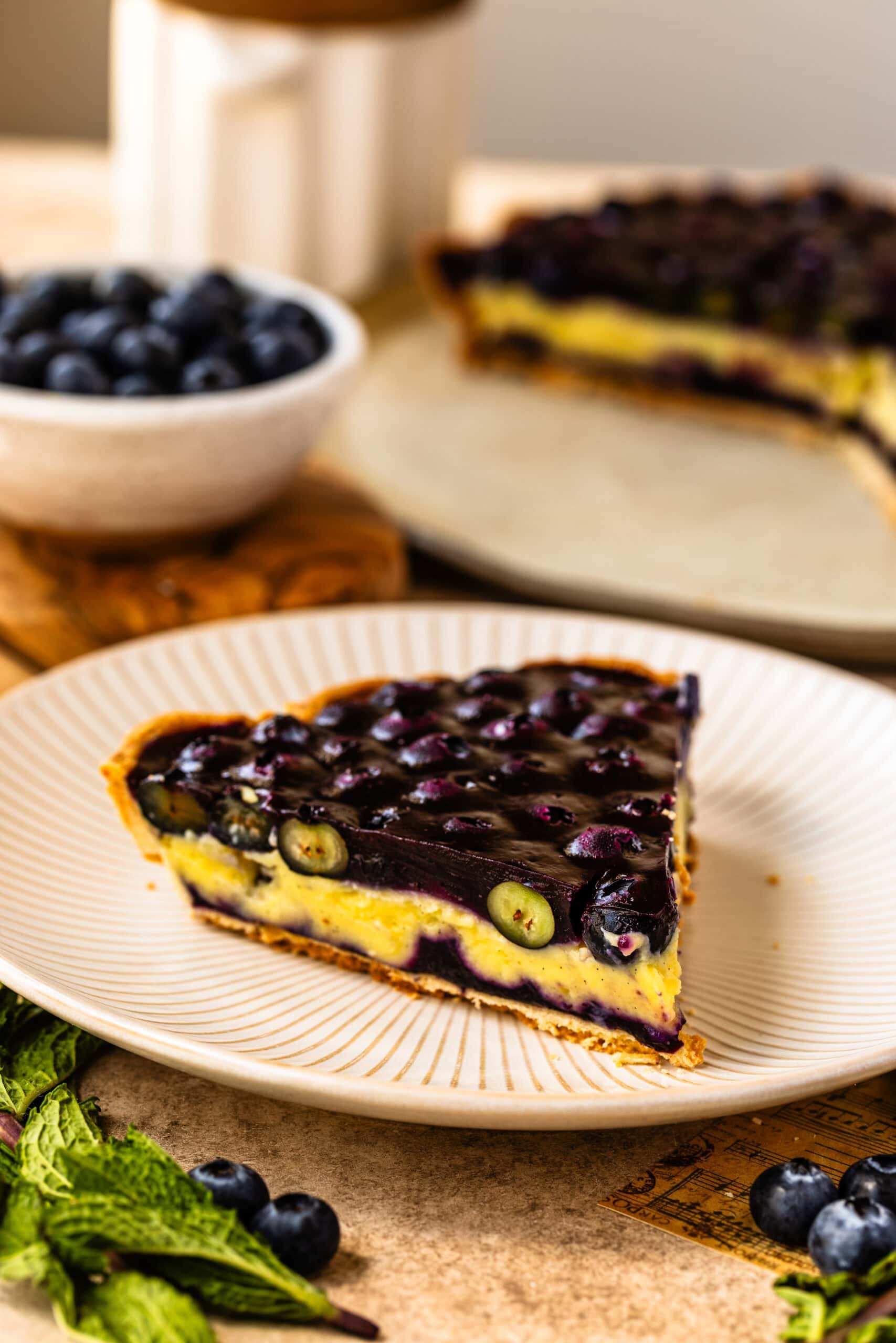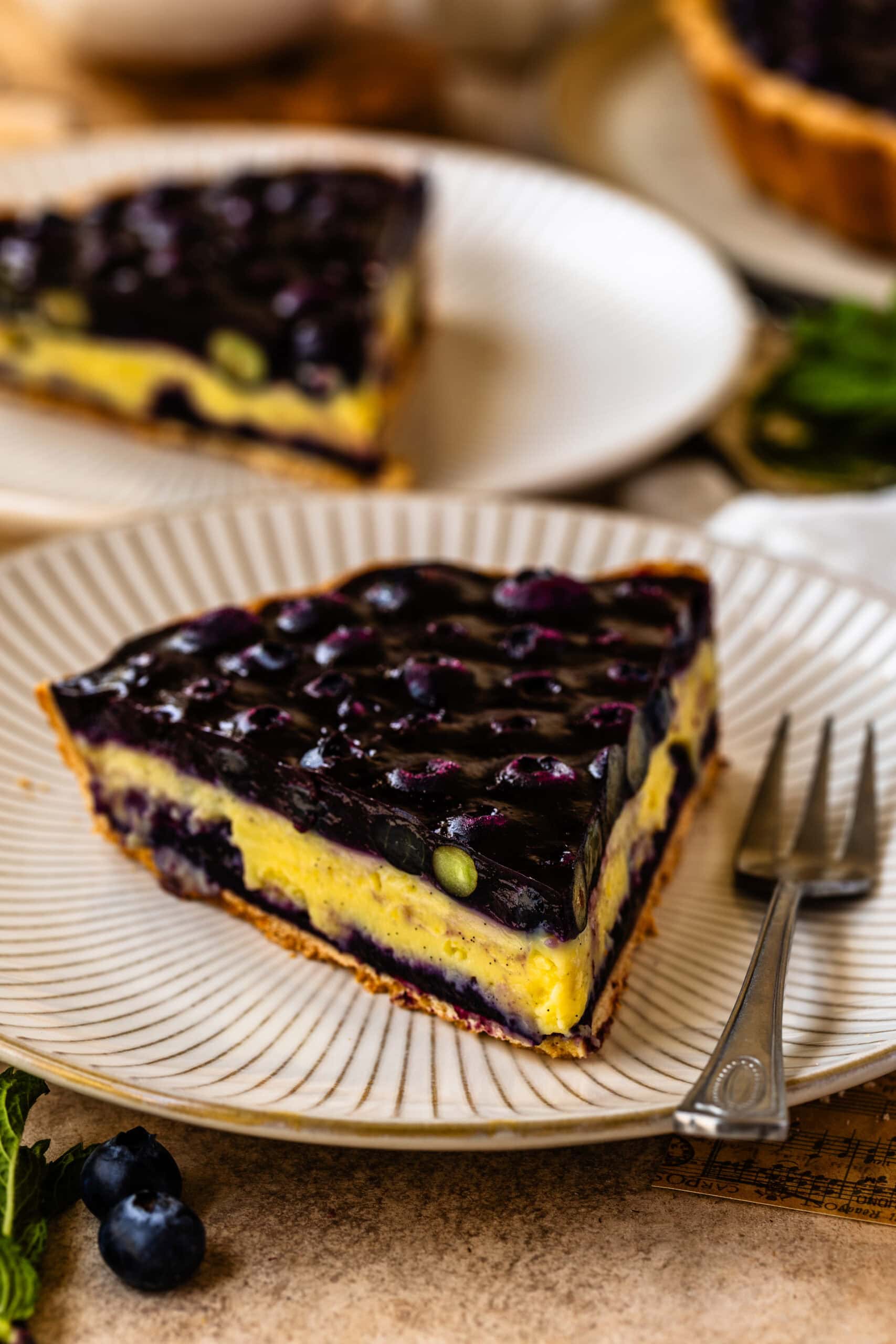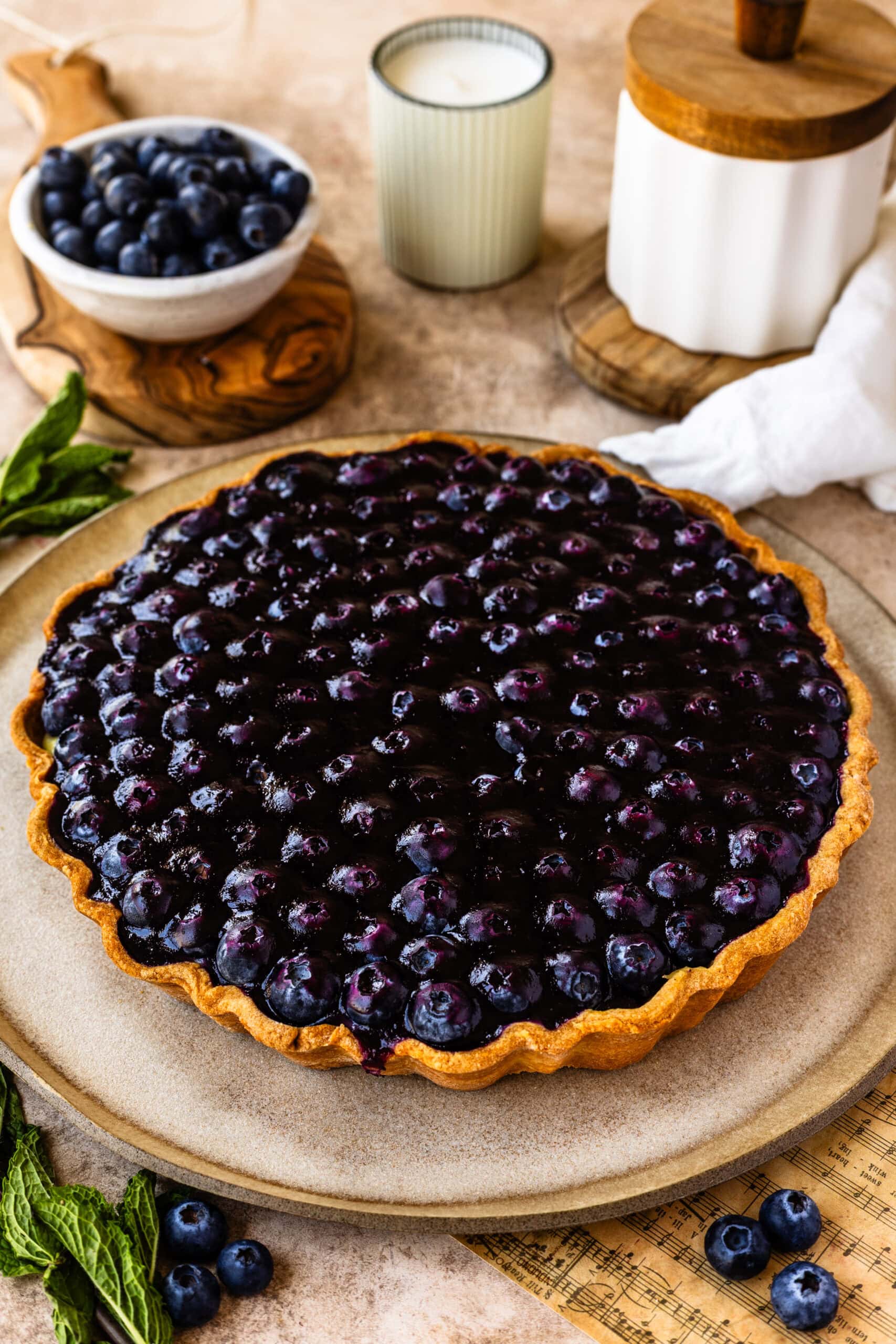 This tart combines three essential components: a buttery, crisp tart crust, a luscious vanilla pastry cream, and a generous topping of fresh blueberries coated in a homemade blueberry glaze. The blueberry sauce adds a punch of flavor, while the pastry cream balances the tartness with its creamy, vanilla richness.