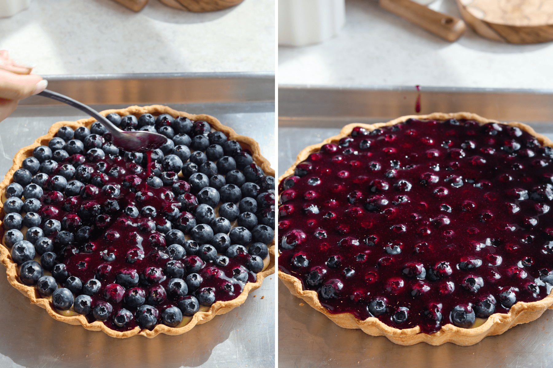 Spoon the glaze over the arranged blueberries, ensuring an even coating. Refrigerate the assembled tart for at least 6 hours to allow the topping to set.