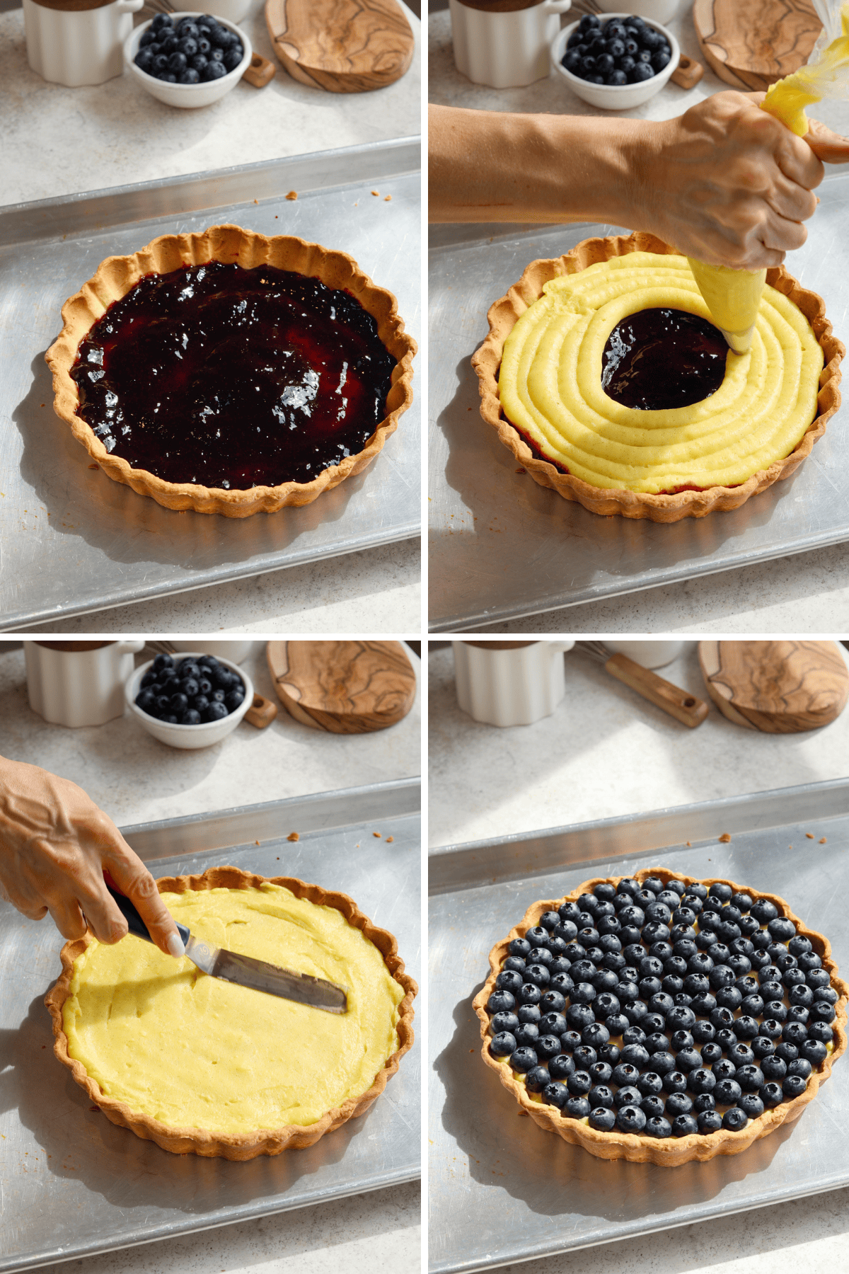 - Base Layer: Spread half of the blueberry sauce on the bottom of the cooled tart crust.