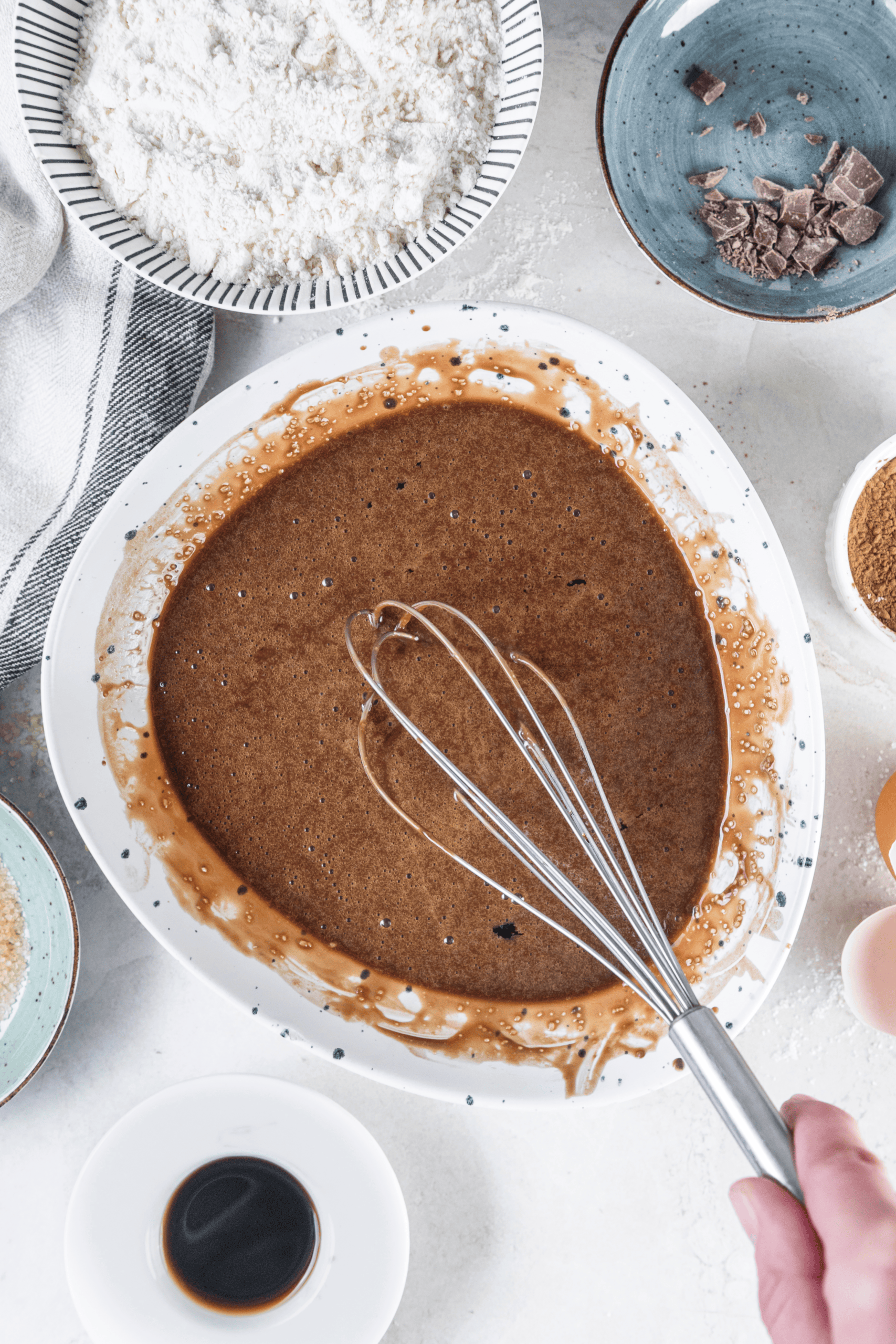 Whisk in the brown sugar until fully incorporated. Then follow with the egg and the vanilla.