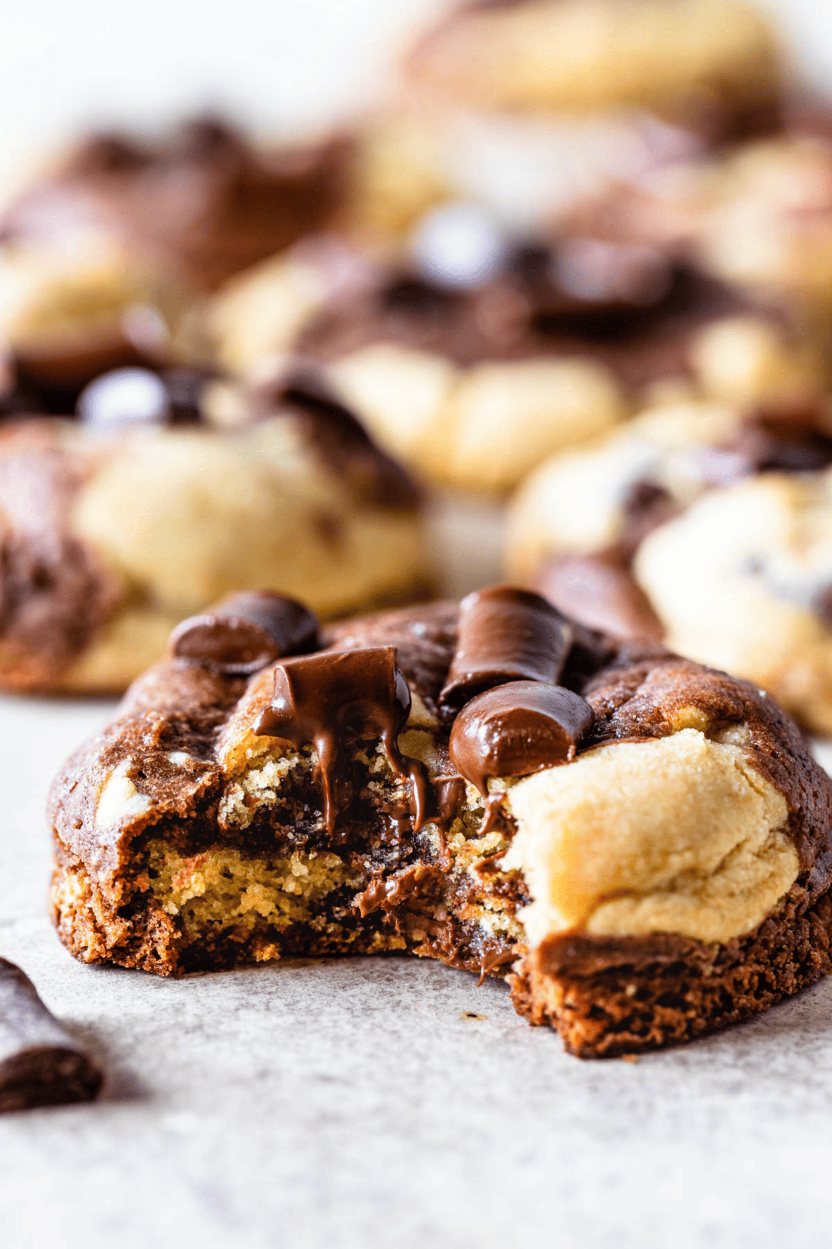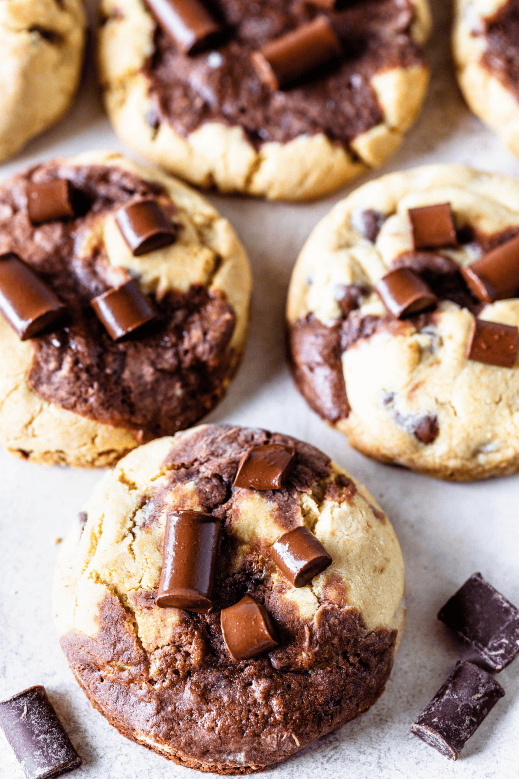 Just made these! While the cookies were good, I felt like they missed something, but I can’t quite pinpoint what it is. The brownie part, for me, was not moist and chewy enough. Perhaps that is what was off. I did make these almost to the T, except for leaving the doughs a bit longer than 2 hours in the fridge. I wonder if this had any effect on the finished product. In any case, pretty good and really thick cookies!