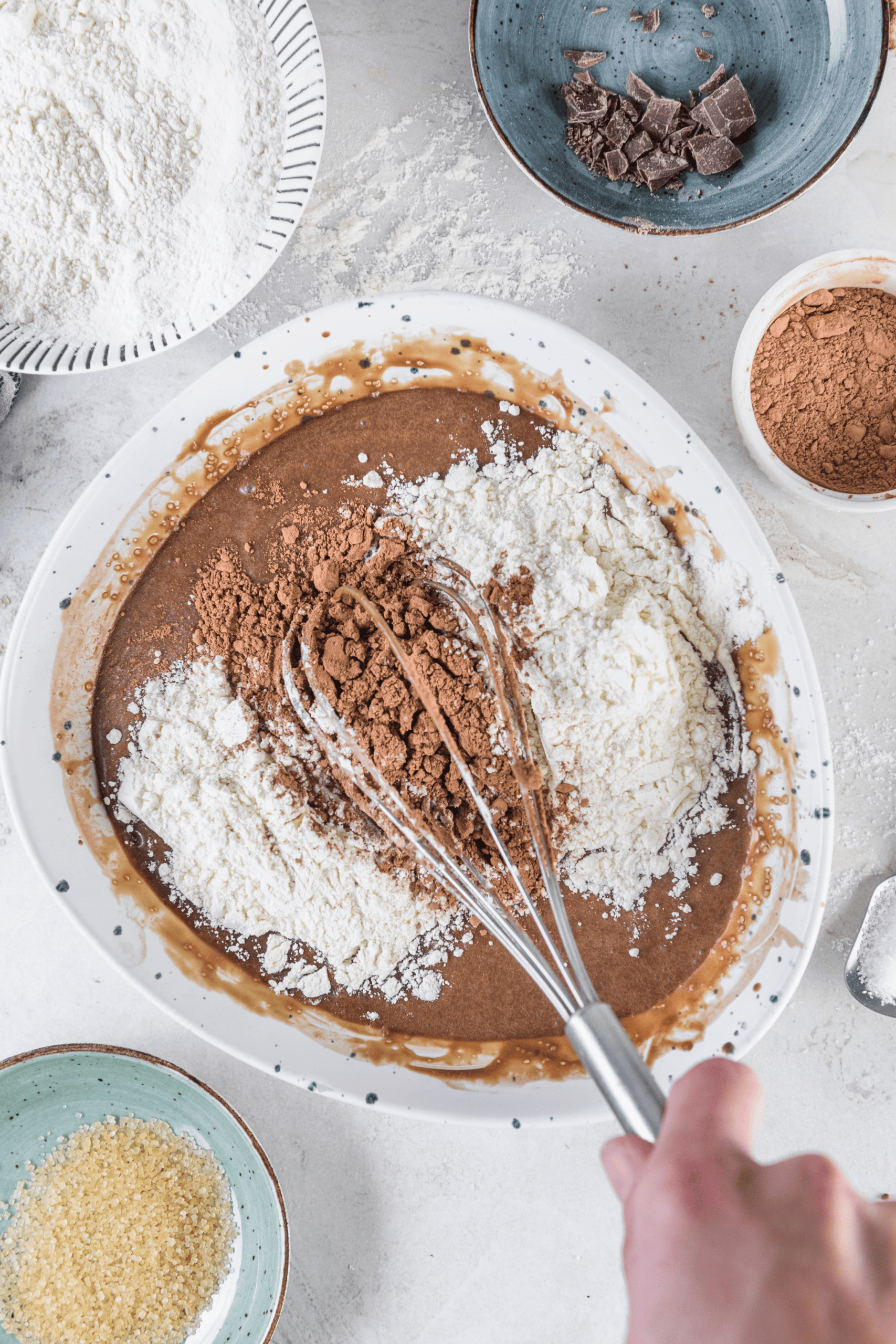 - Add the flour, cocoa powder, and salt to the bowl. It’s best if you pre-sift the dry ingredients before adding them, or sift them right into the bowl.