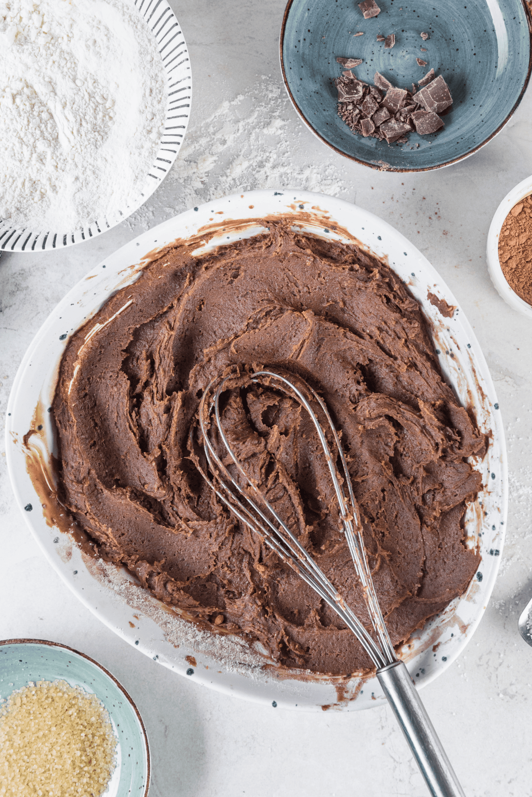 Melt the butter and chocolate together until smooth. I do this in a microwave in 20–30 second bursts, whisking between each, or over a double boiler.