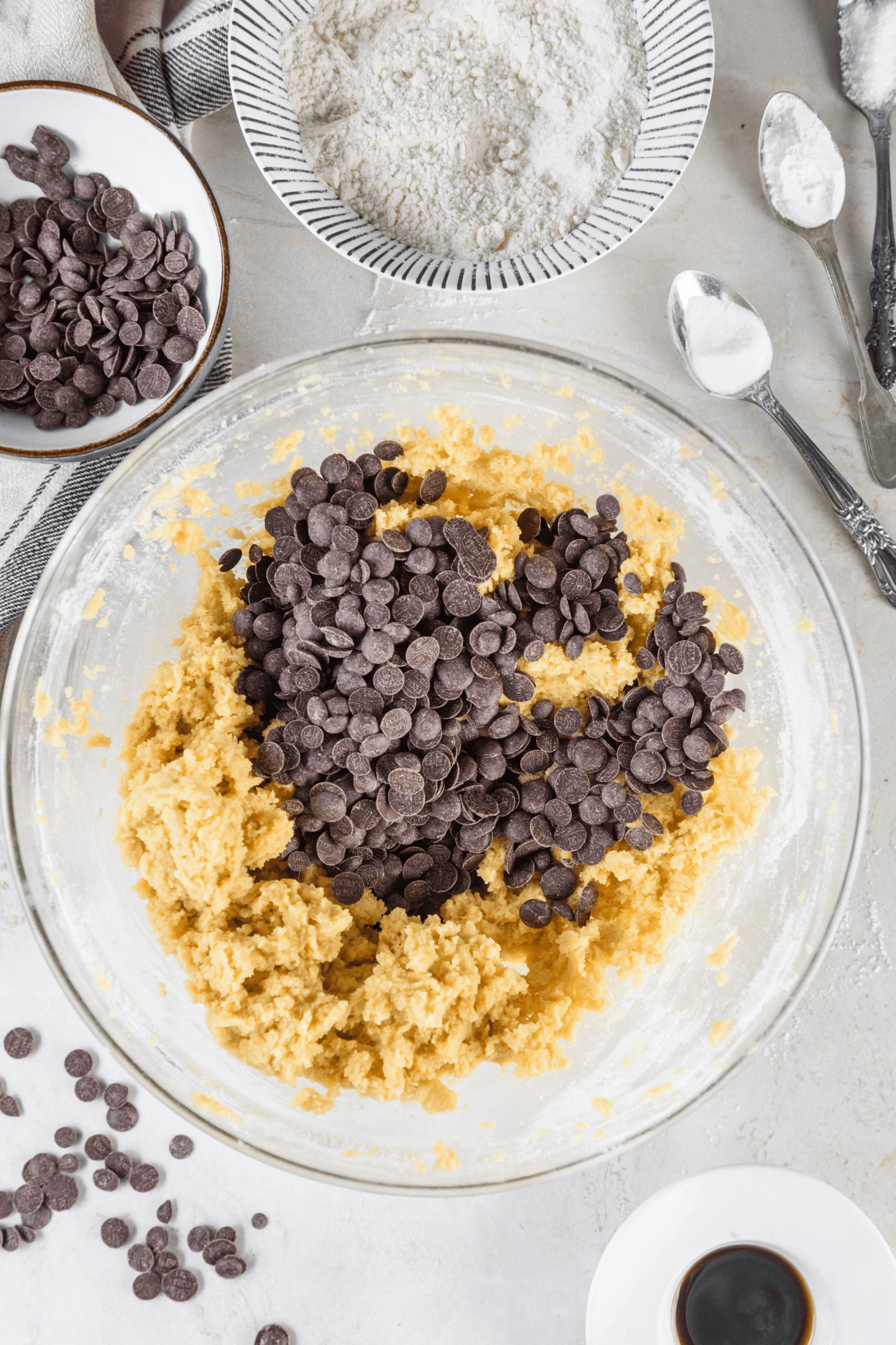 Add the flour, baking powder, baking soda, salt, and stir until a dough forms. Follow with the chocolate chips, or chocolate chunks.