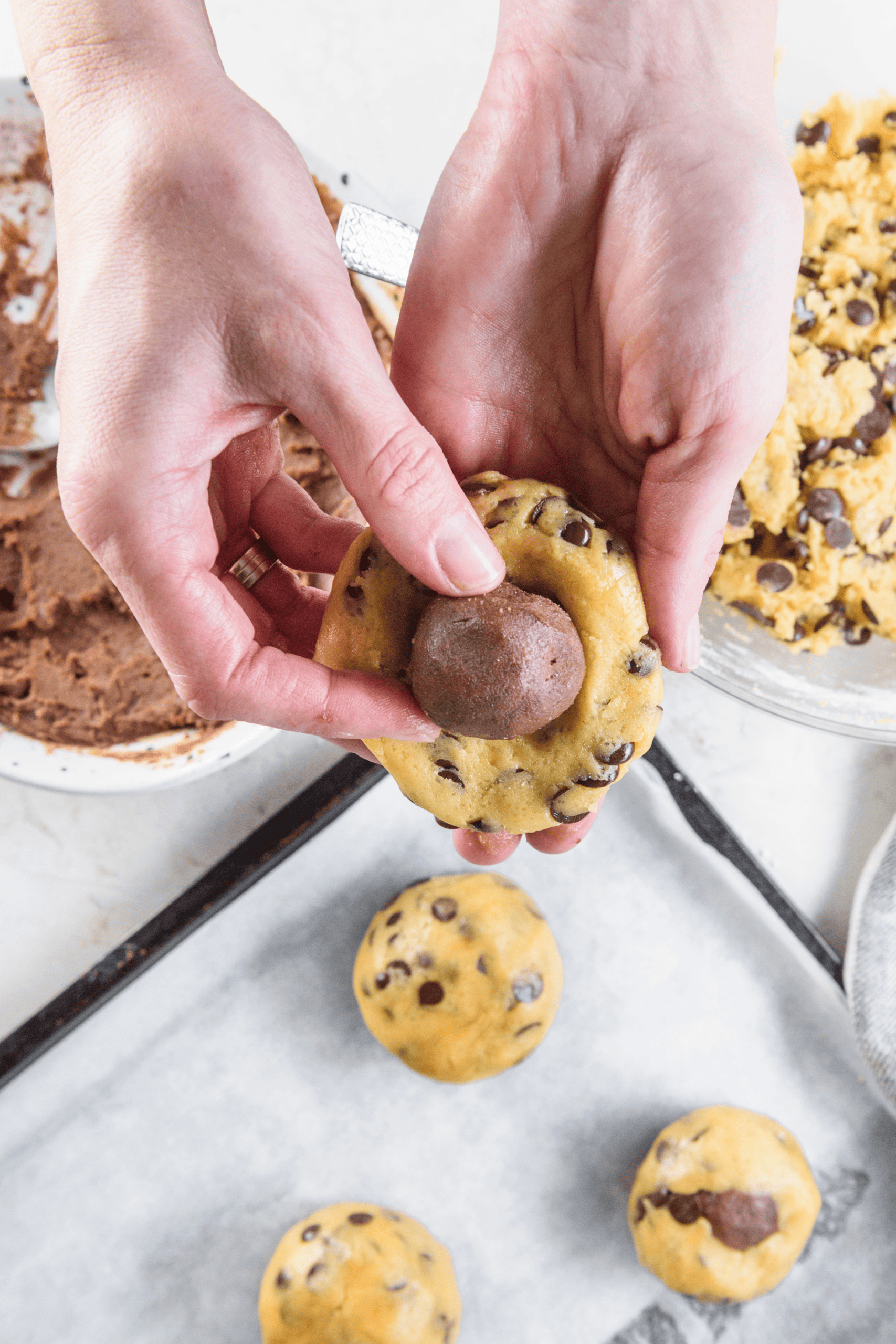 - Grab about 2 tablespoons of chocolate chip cookie dough and flatten it out with your hands. Grab about 1 tablespoon of brownie batter and place it in the middle of the cookie dough.