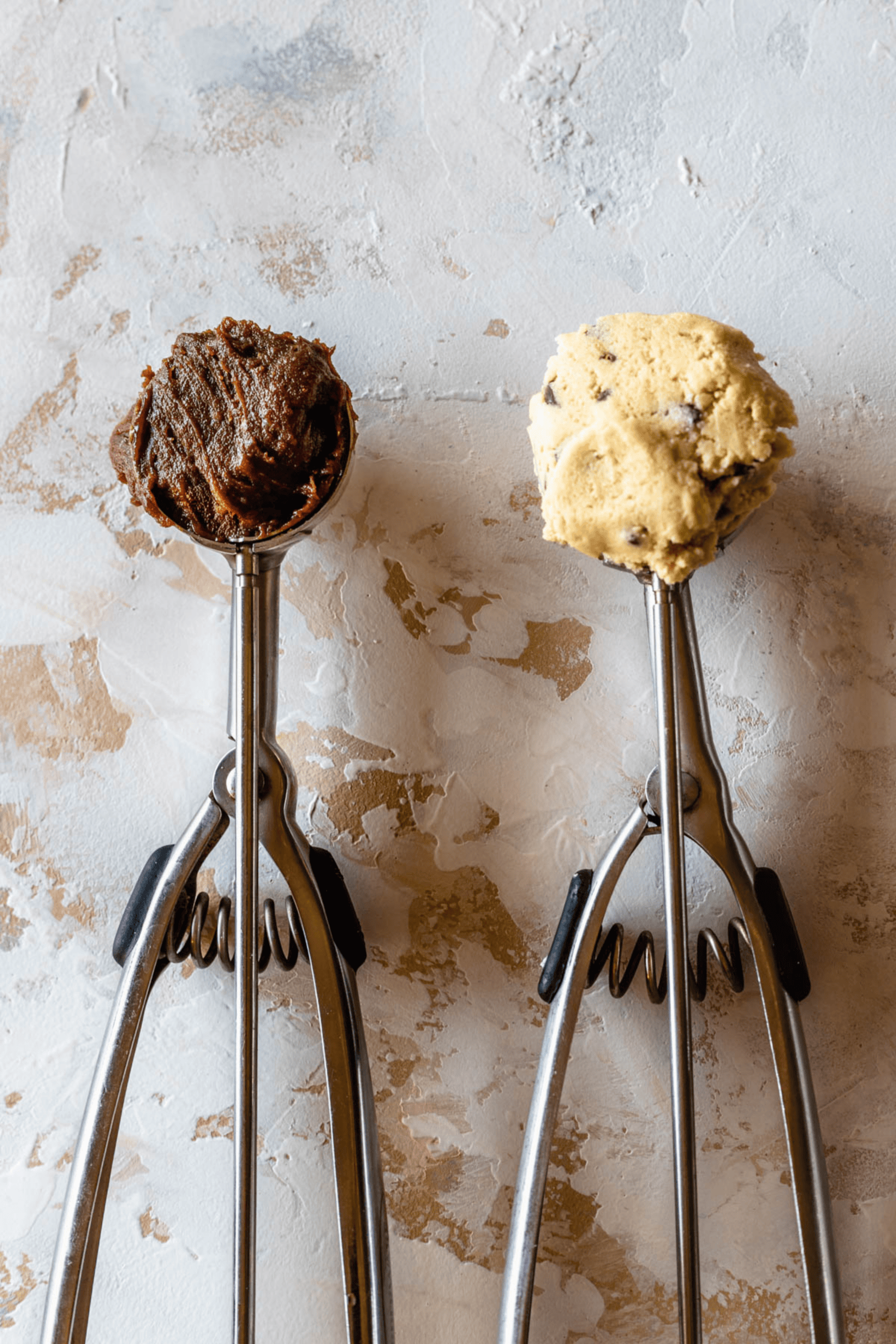 I like to portion the cookie dough into 2-tablespoon scoops. And for the chilled brownie batter, I make them into 1-tablespoon scoops.