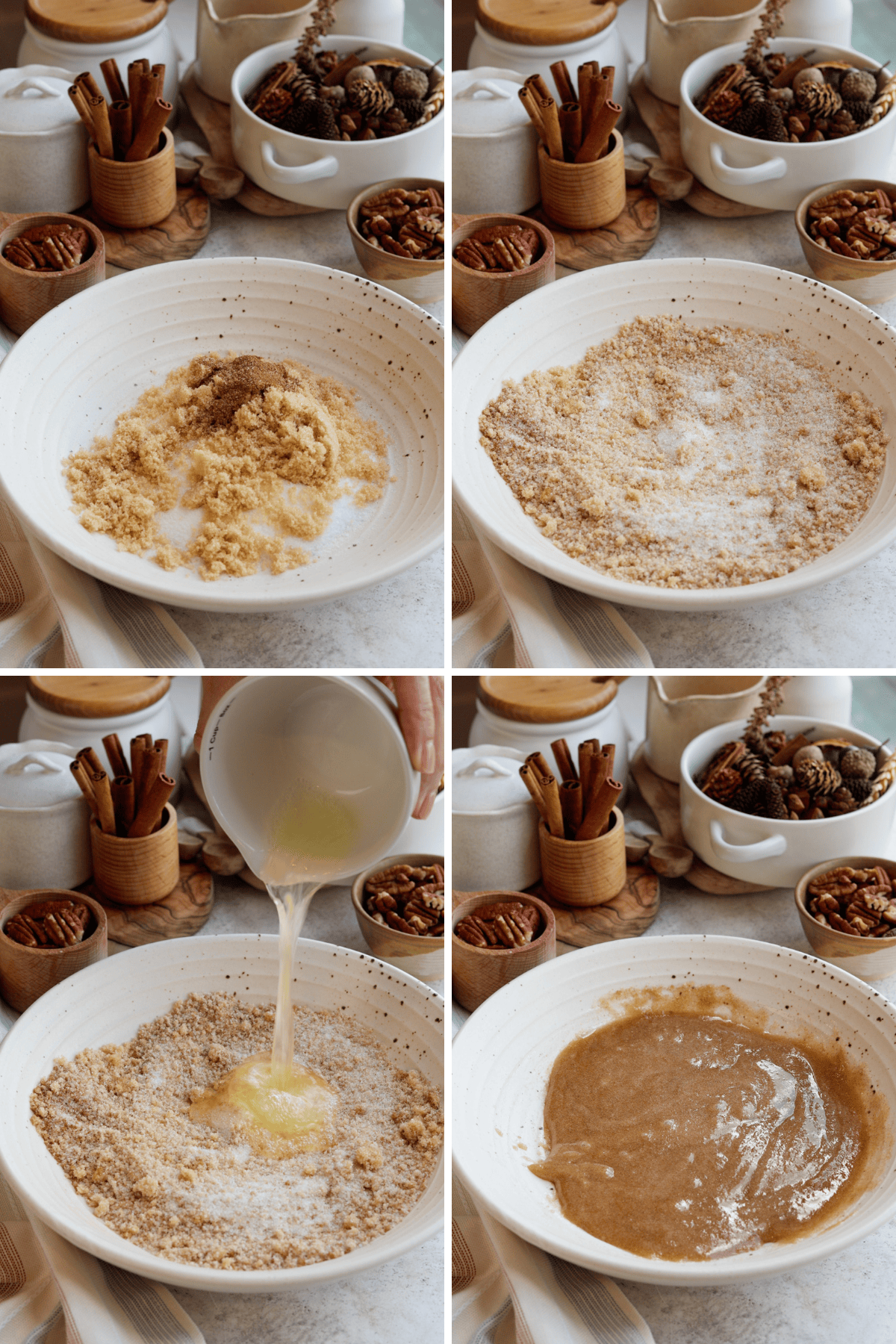 Add the brown sugar, granulated sugar, cinnamon, and salt, then stir until the sugar mixture is evenly combined.