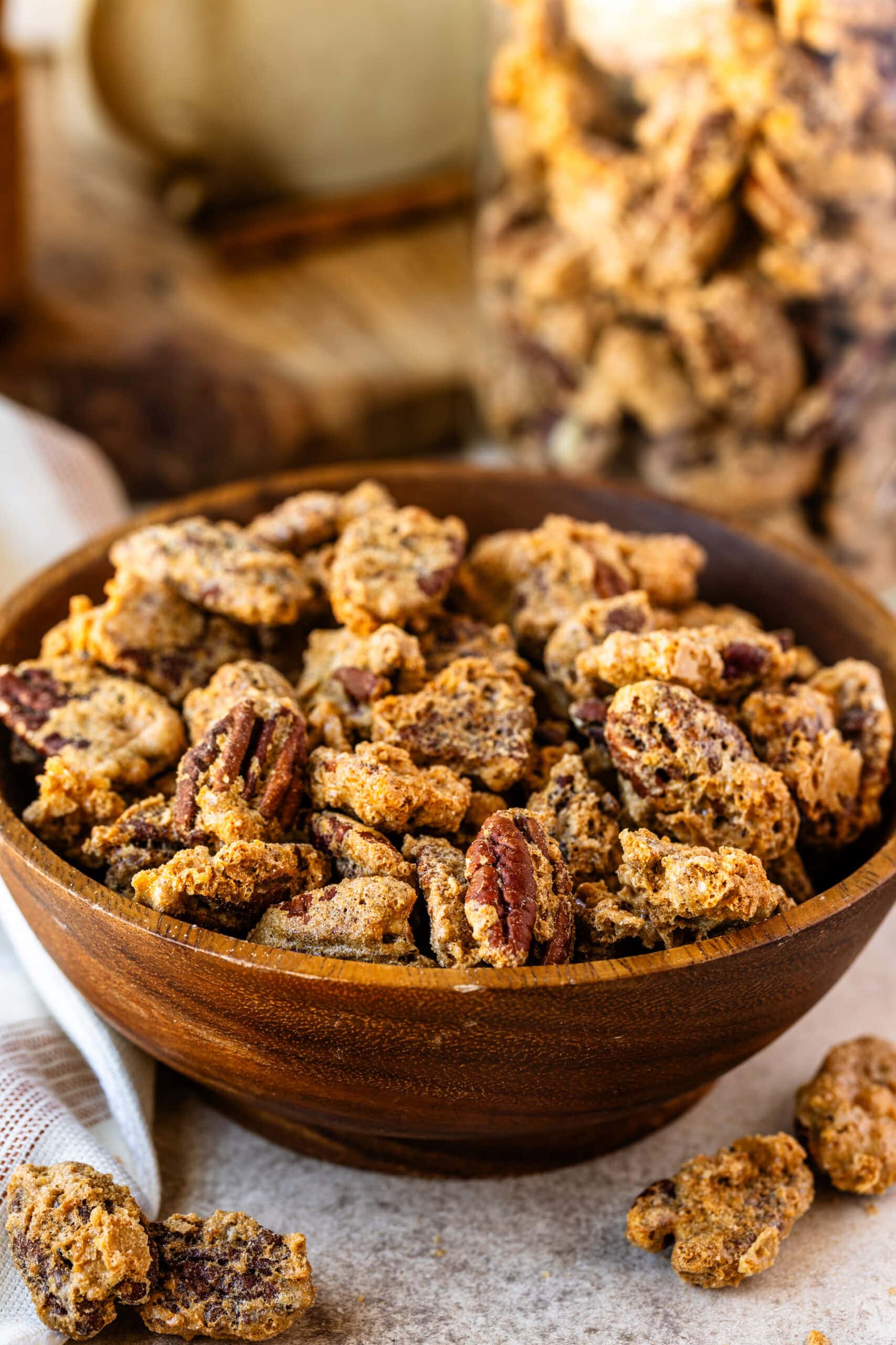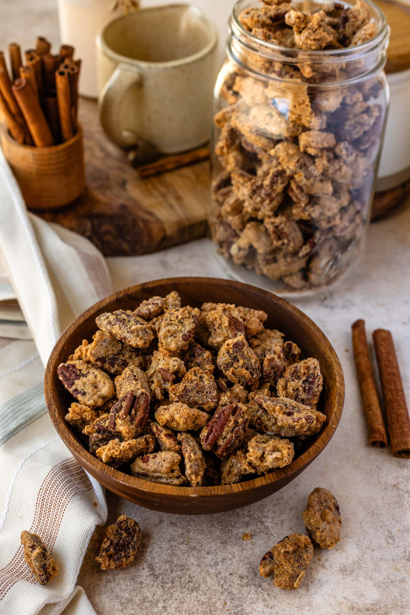If you love these candied pecans, youโll enjoy my Pumpkin Caramel Sauce drizzled over them, or try pairing them with my Pumpkin Pie for a sweet and salty crunch. My Cinnamon Cream Cheese Frosting also makes a dreamy dip for these warm, spiced nuts. If youโre looking for another festive edible decoration, try these sugared cranberries!